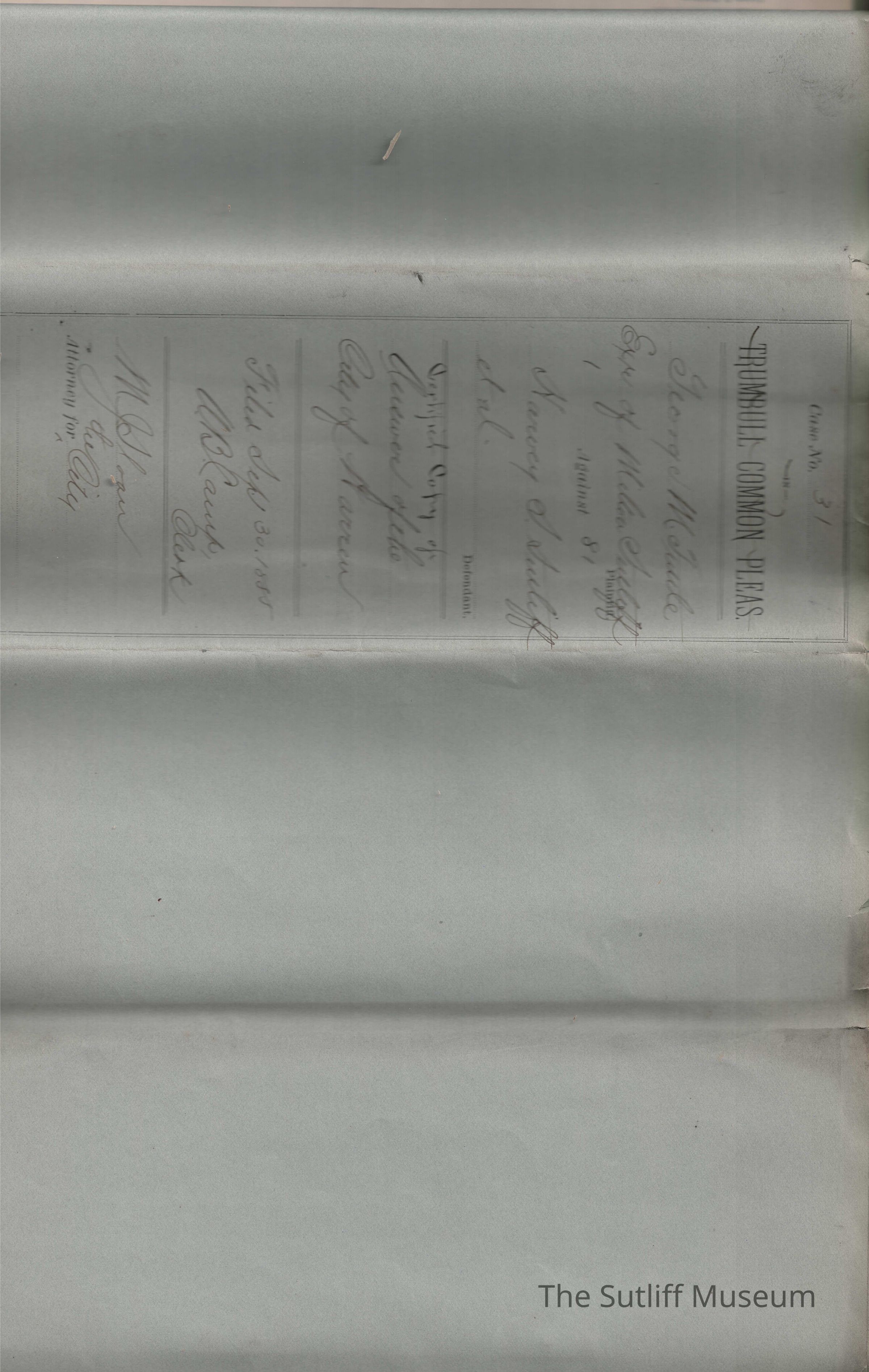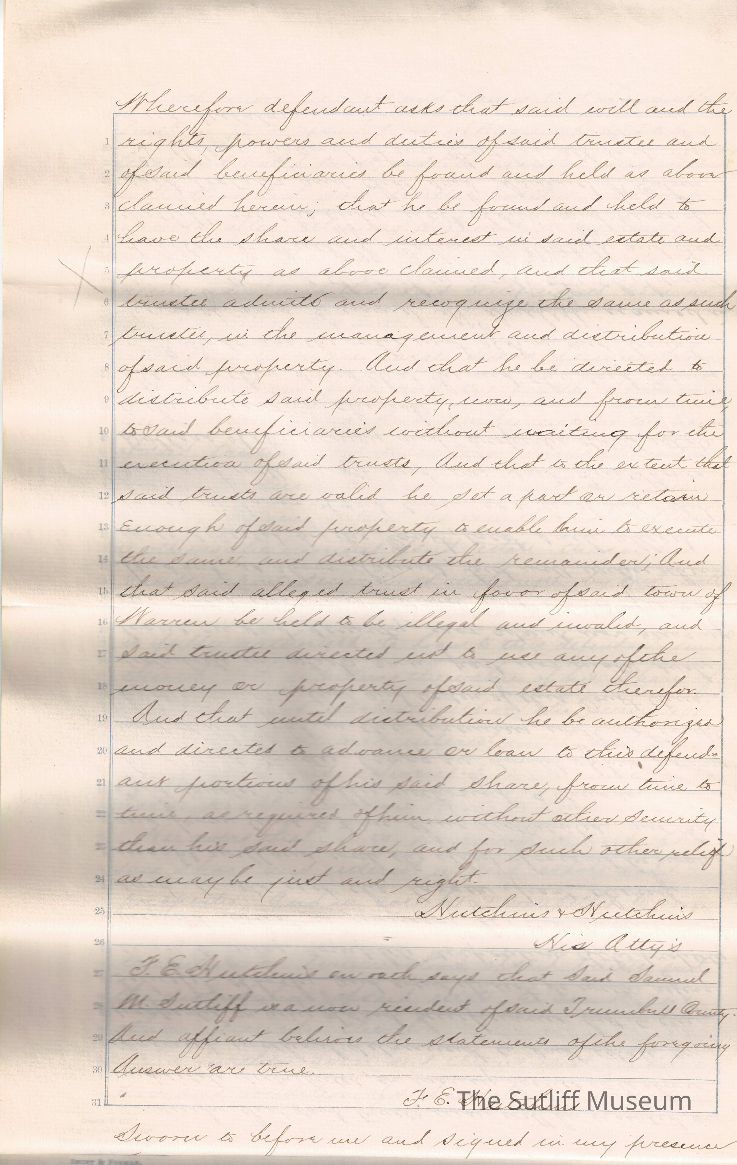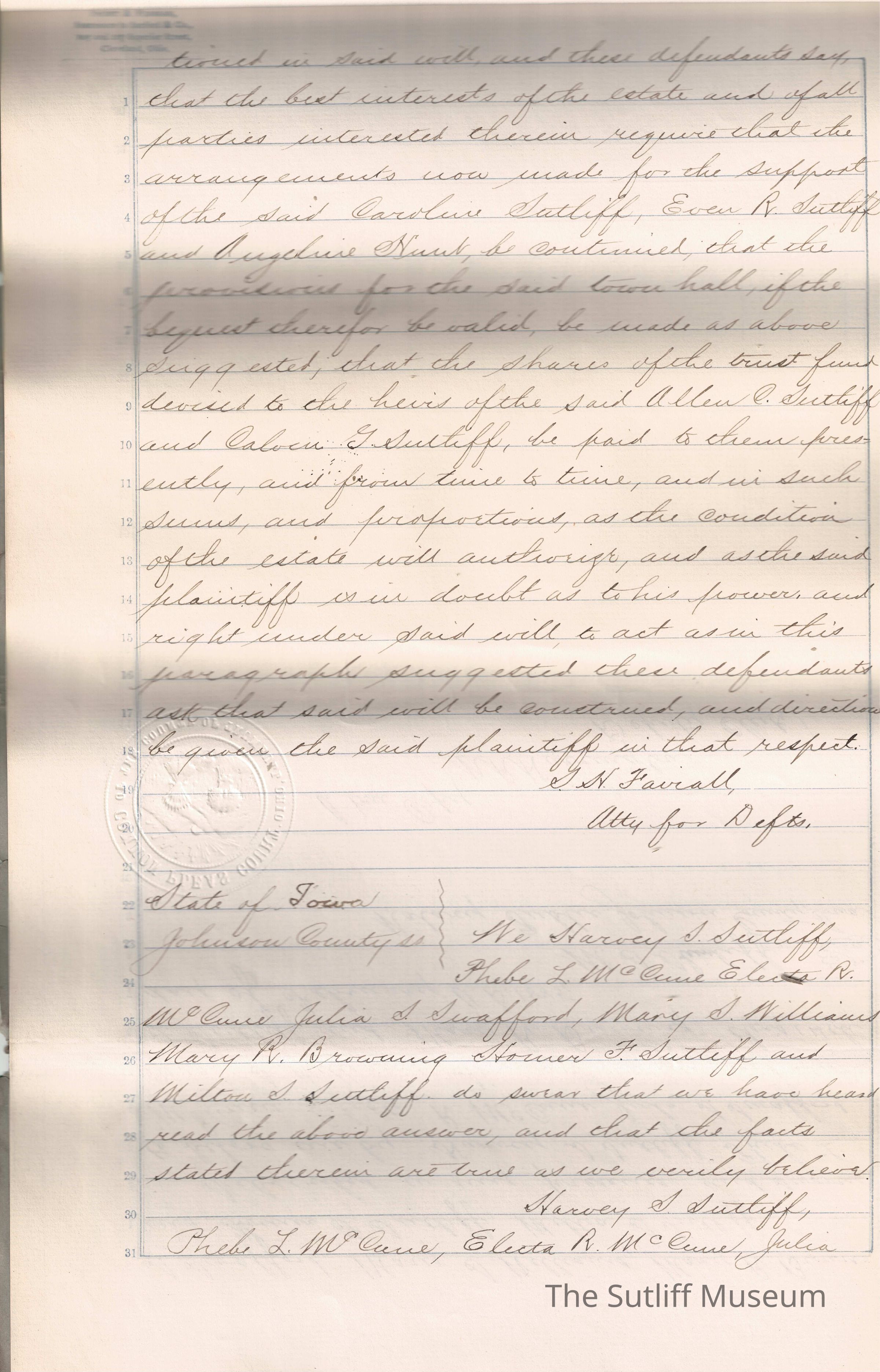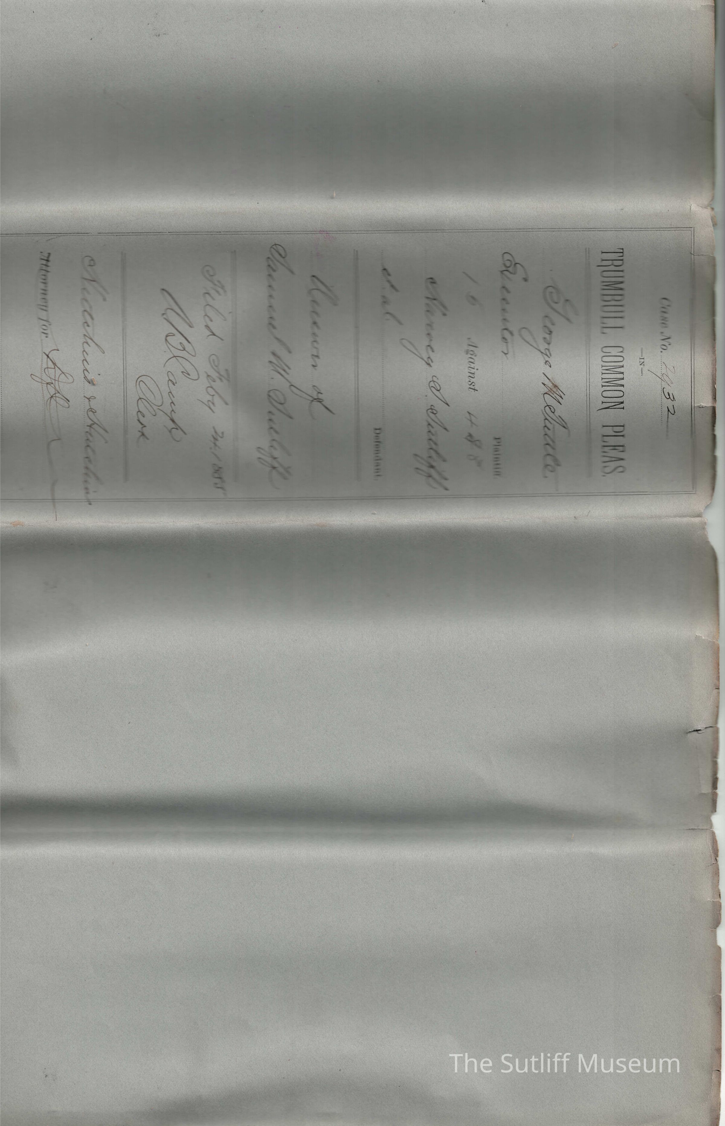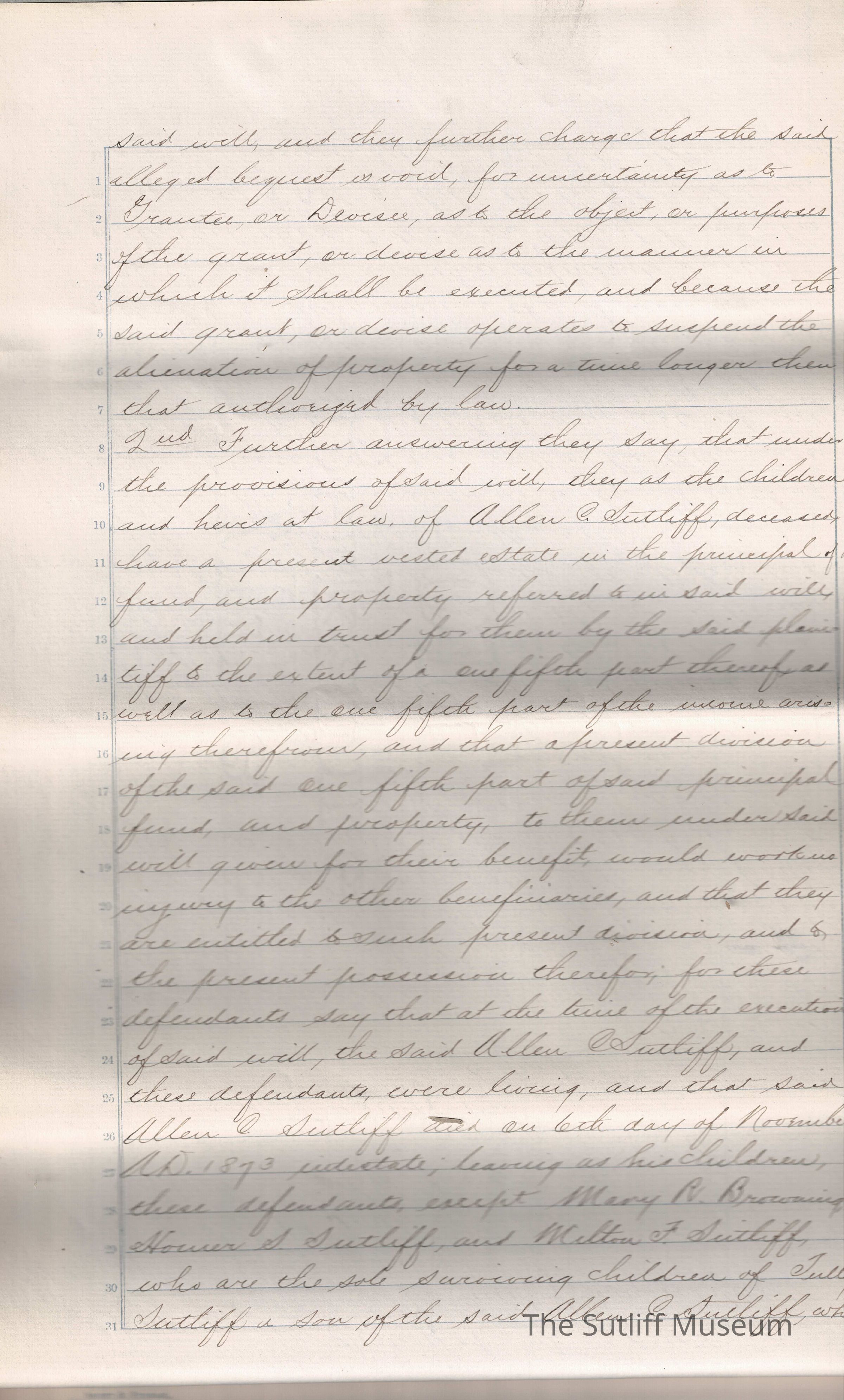 A copy of the legal case of George M. Tuttle vs Harvey Samuel Sutliff et al regarding a contestation of Milton Sutliff's will. Included is three different records.Collection