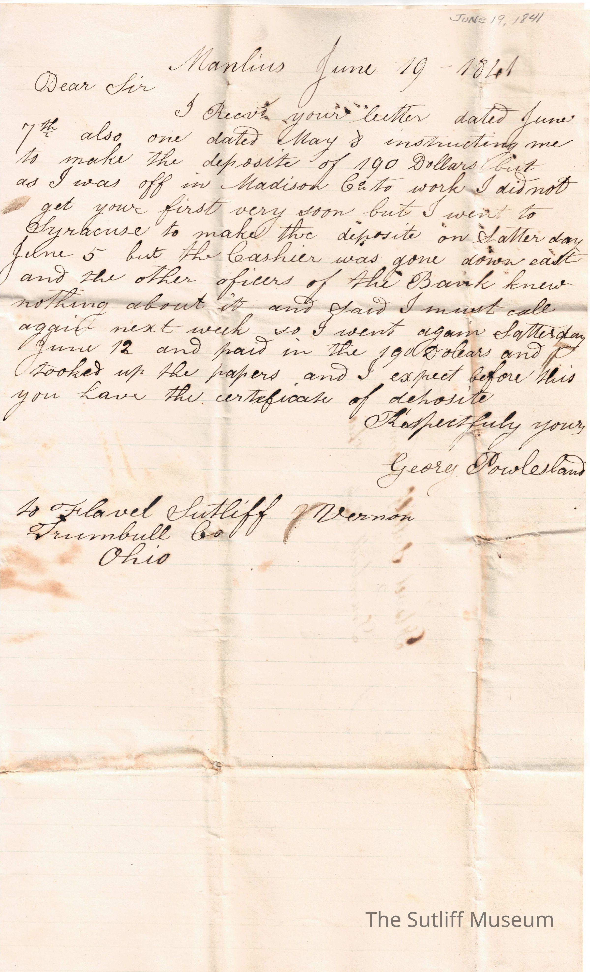 Letter from George Powlesland to Flavel Sutliff regarding his attempt to get the money for a deposit.