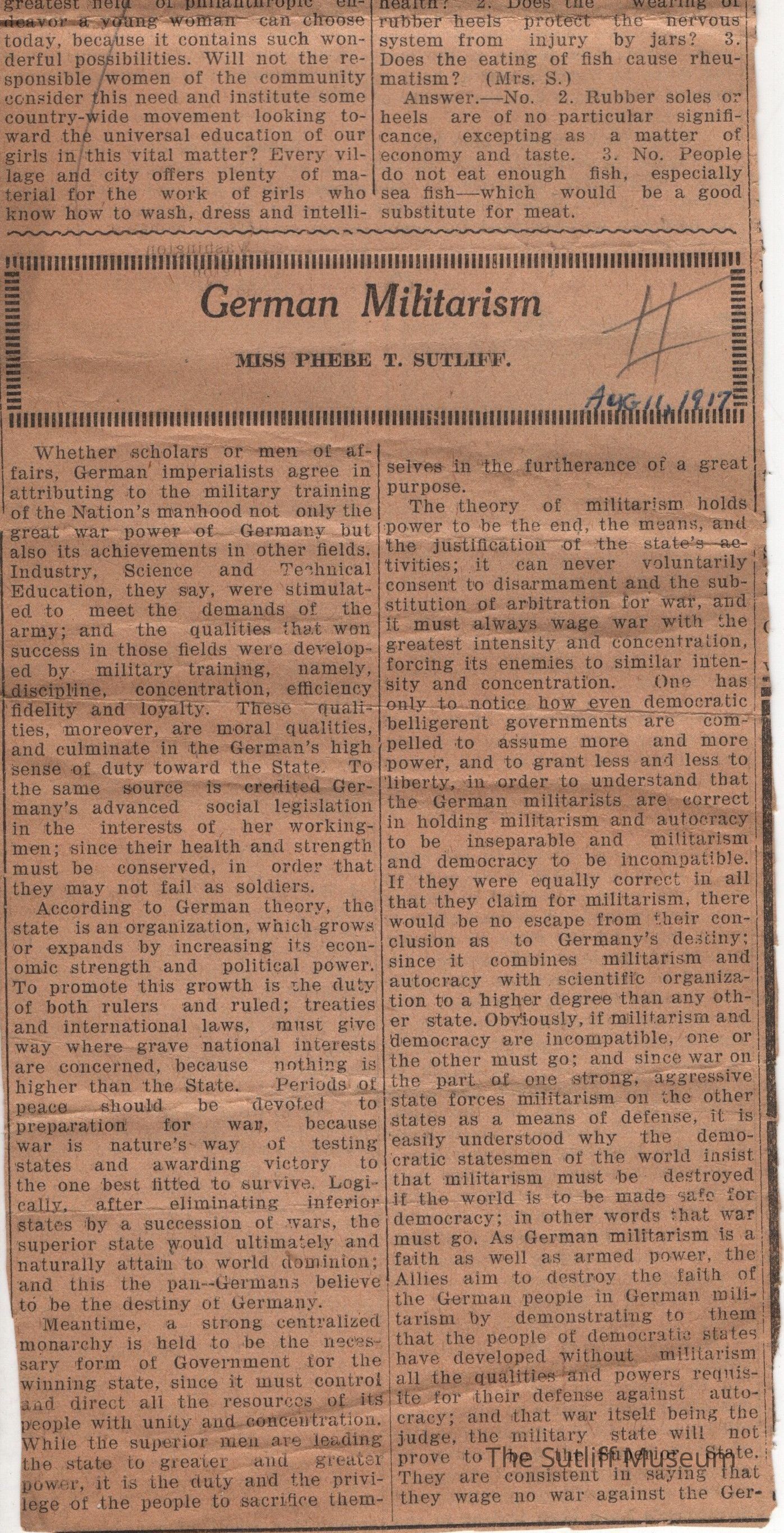 An article titled "German Militarism" by Phebe T. Sutliff. Dated 8/11/1917Collection