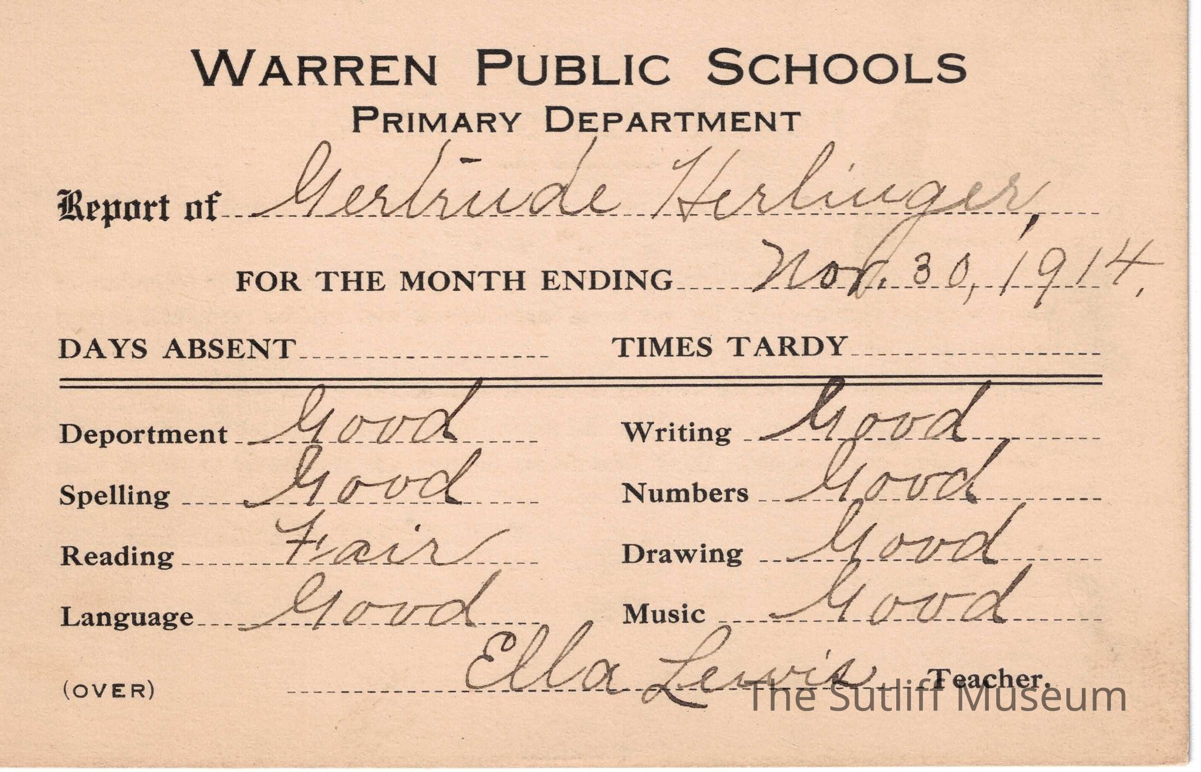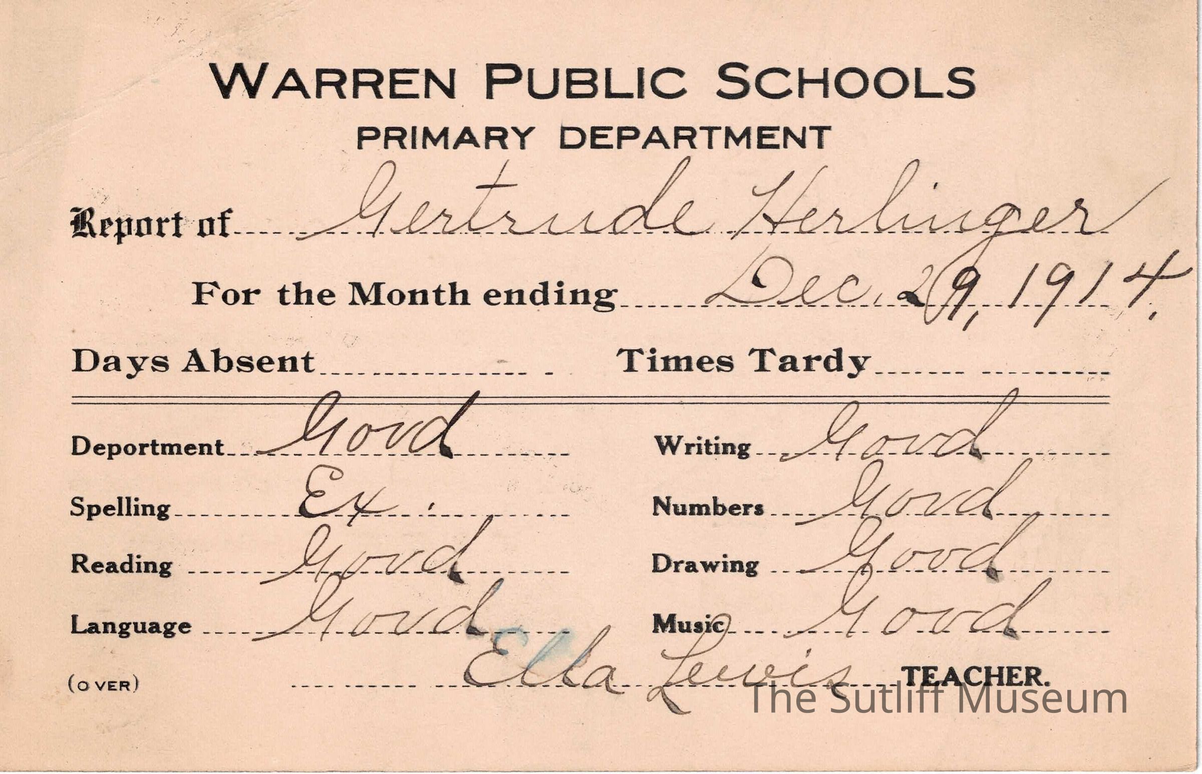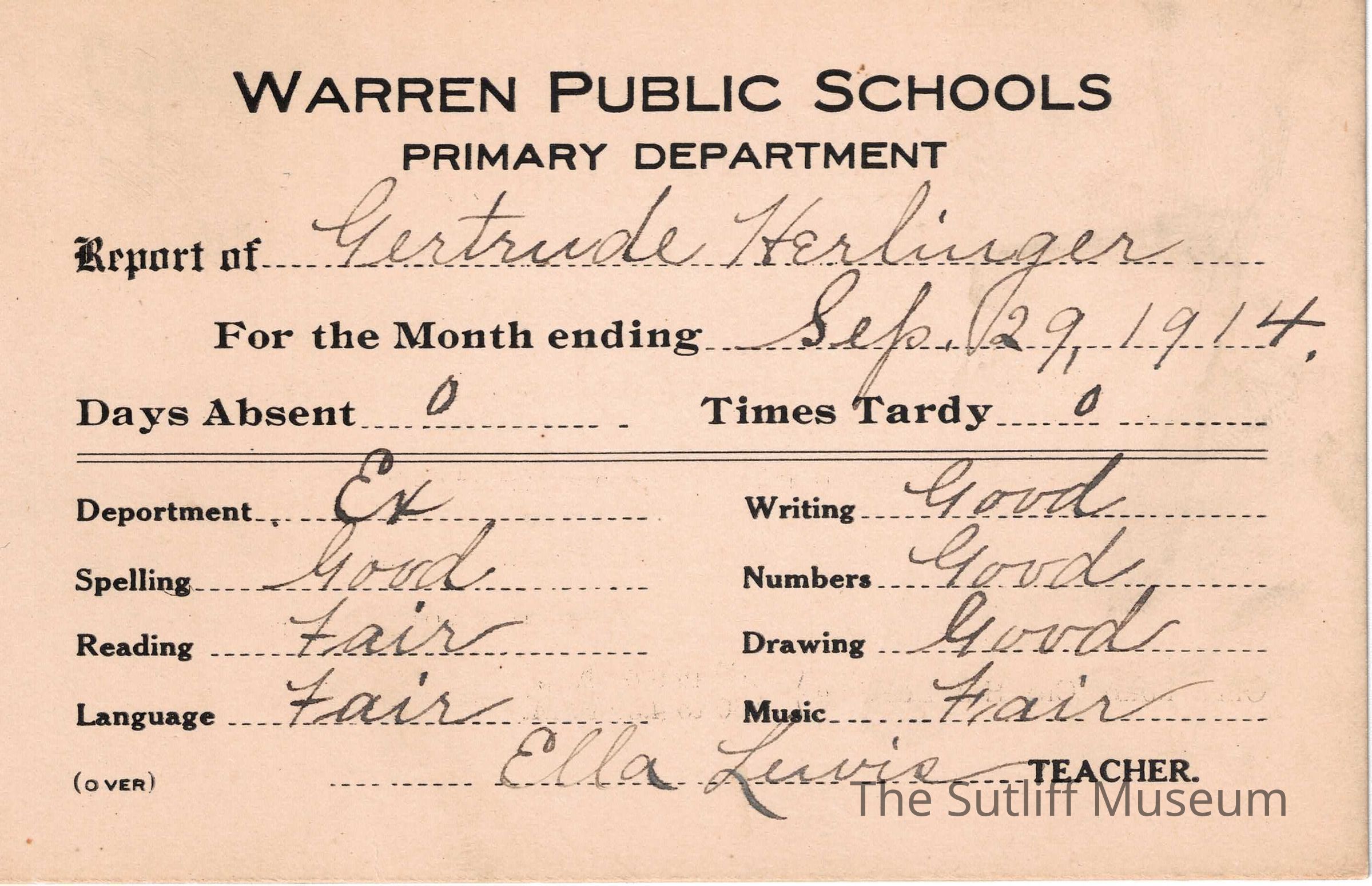 A set of four report cards for Gertrude Herlinger from the Warren Public School system. They are signed by teacher Ella Lewis. The first report card is dated September 29, 1914, the second is dated October 30, 1914, the third is dated November 30, 1914, and the last is dated December 29, 1914.Collection