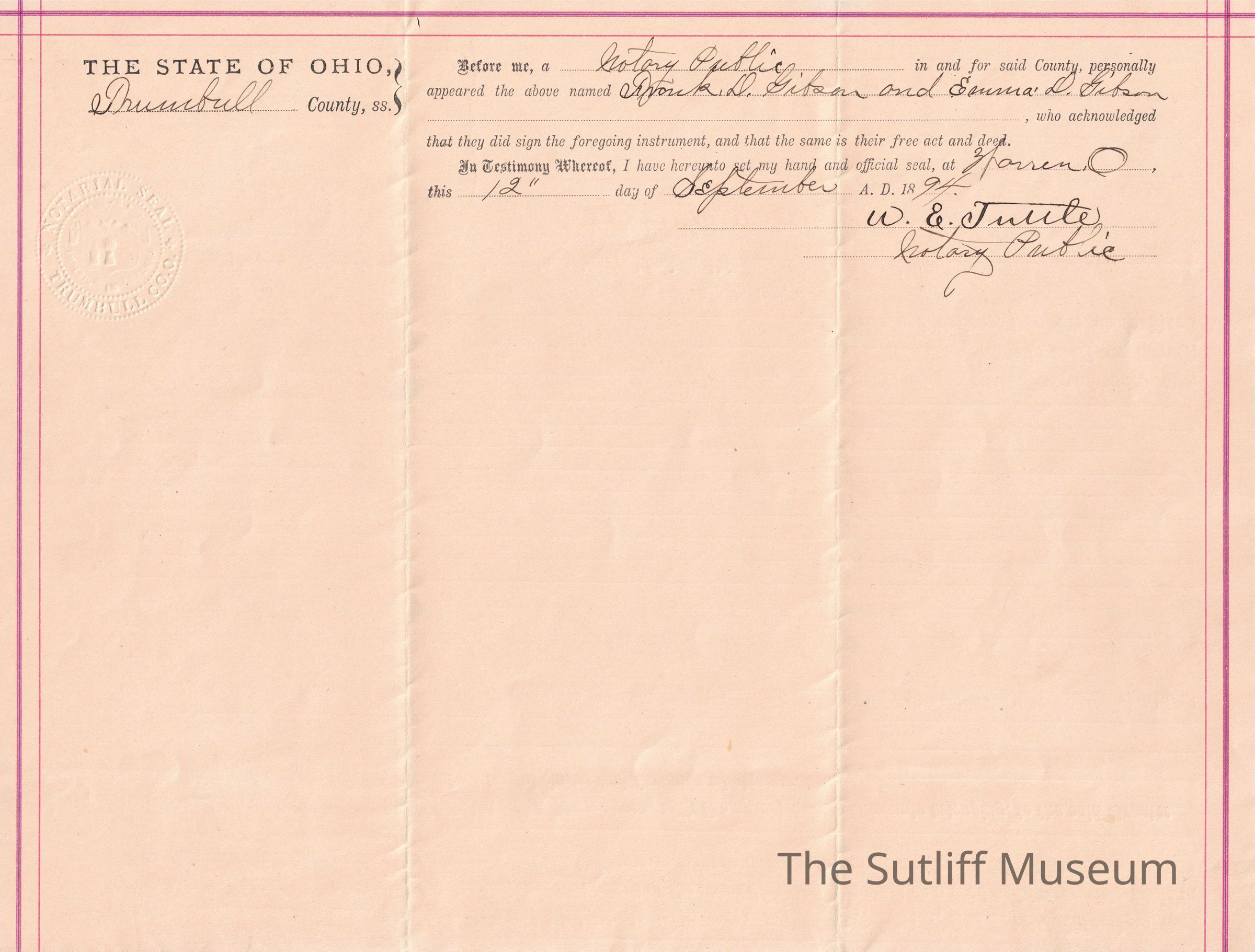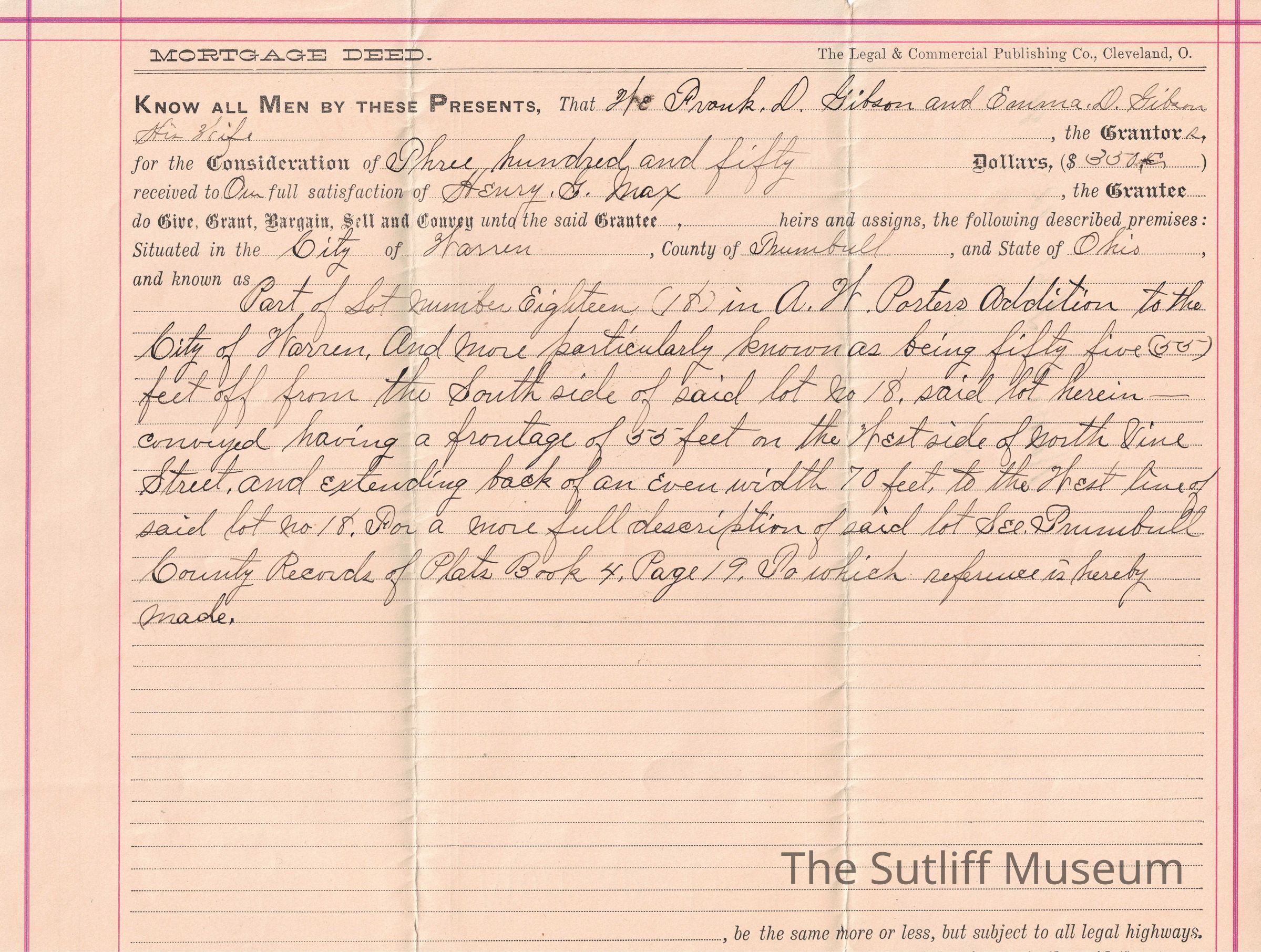 A legal document acting as a Mortgage Deed from Frank D. Gibson to Henry G. Max. It was cancelled September 14, 1896.Relationships
