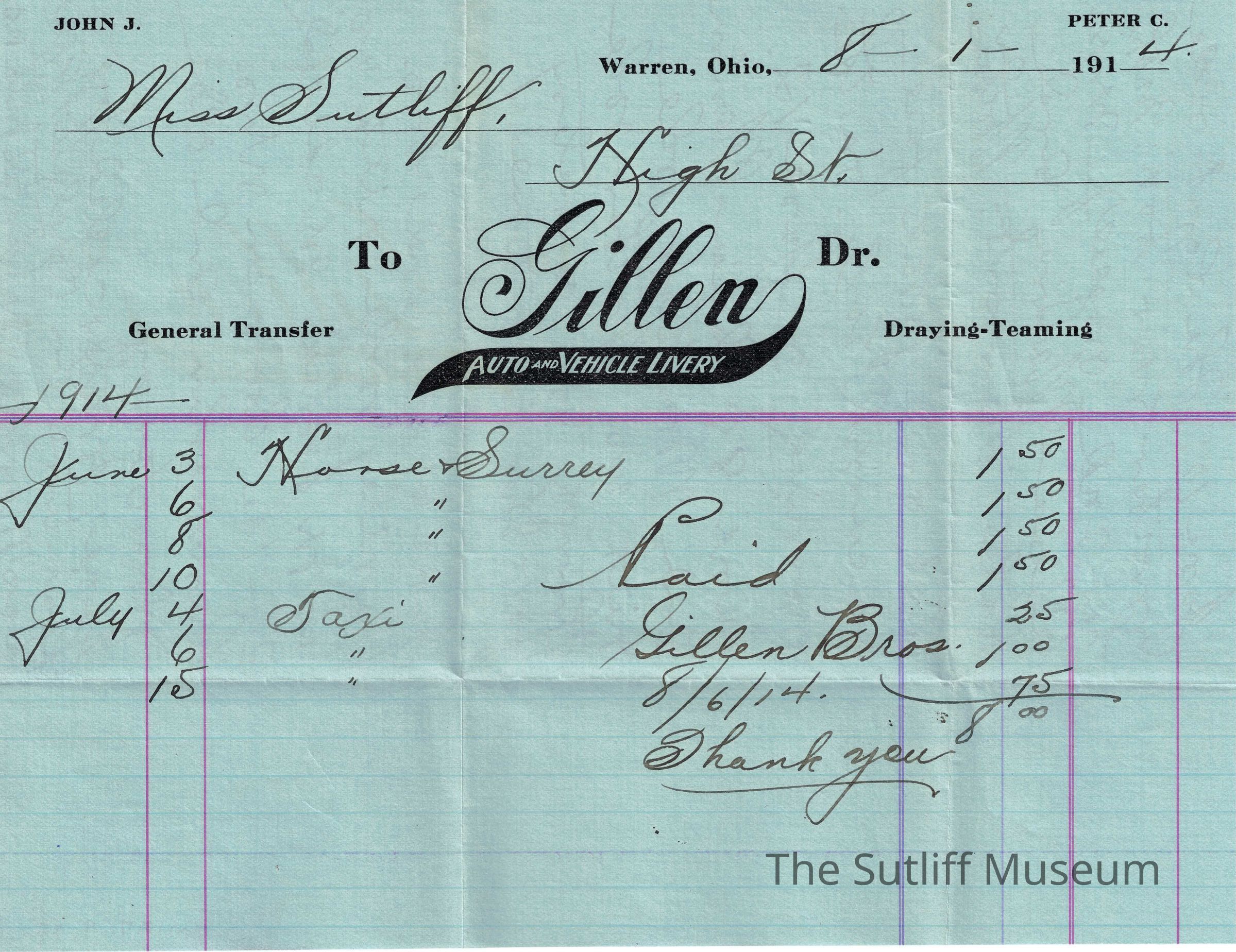 A receipt to Phebe Temperance Sutliff from Gillen Auto and Vehicle Livery for completing payment associated with Phebe Lord Marvin Sutliff's death receipts.Collection