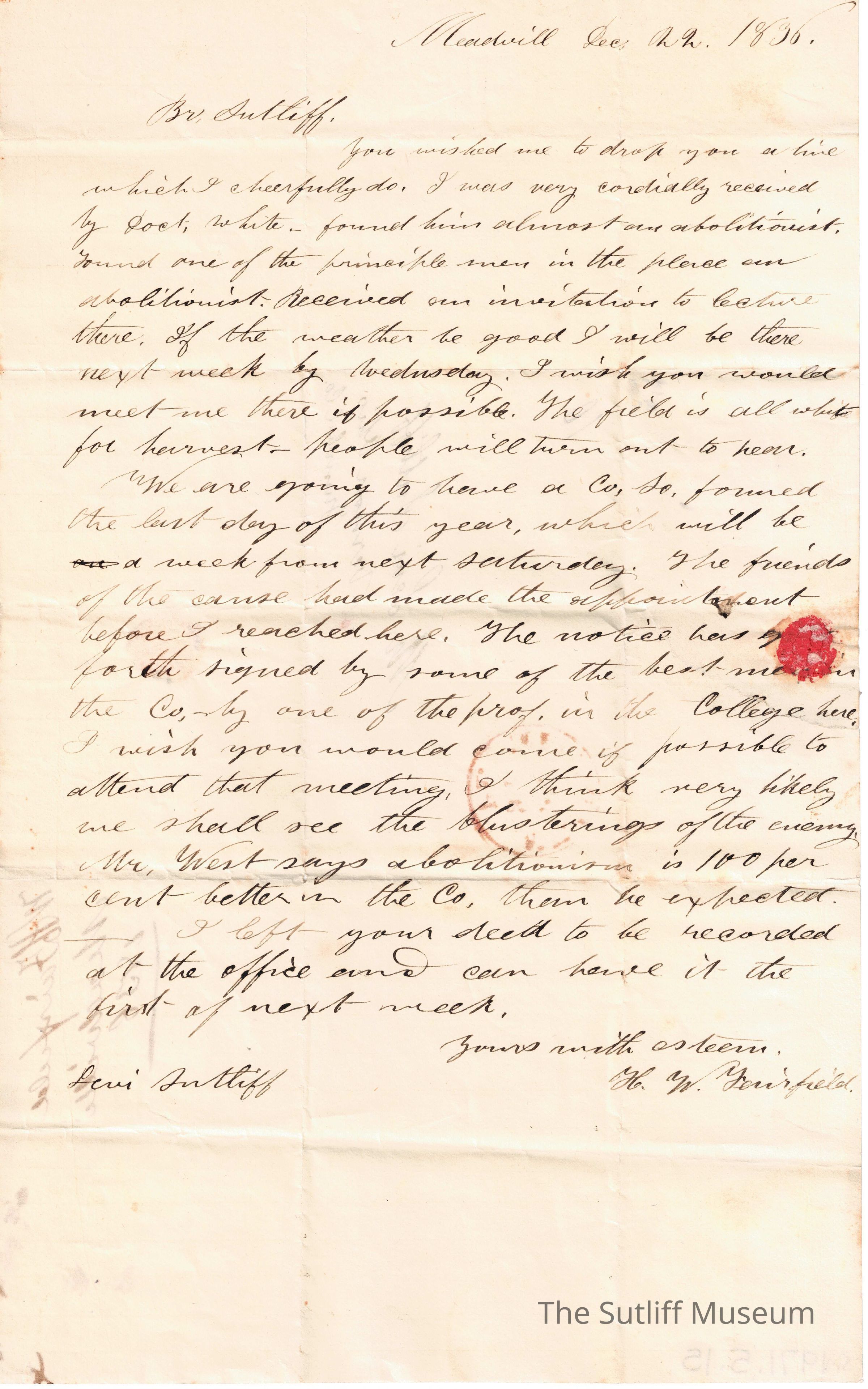 A letter from H.W. Fairfield to Levi Sutliff regarding abolition and the opportunity to speak at an University.Collection