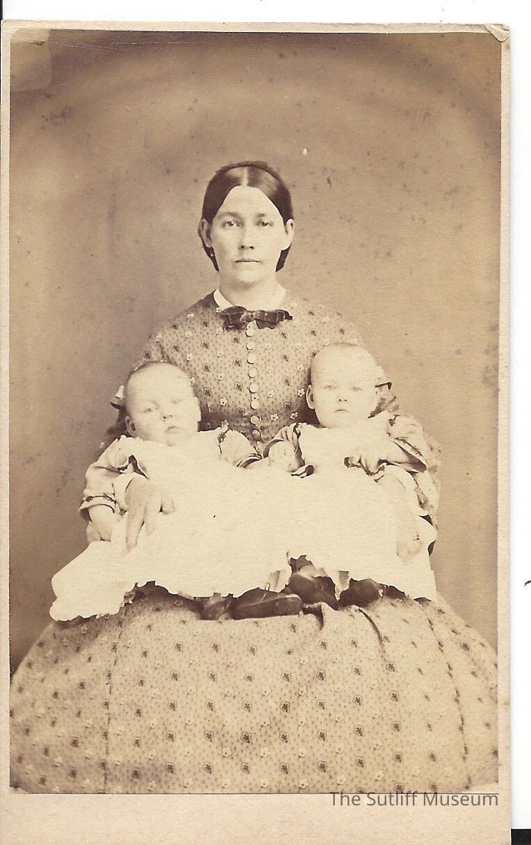Photograph of Hannah Bennett, wife of Calvin Granger Sutliff, and their twin infants. The twins, Calvin G. and Belle H. were born Sept. 14th, 1851.