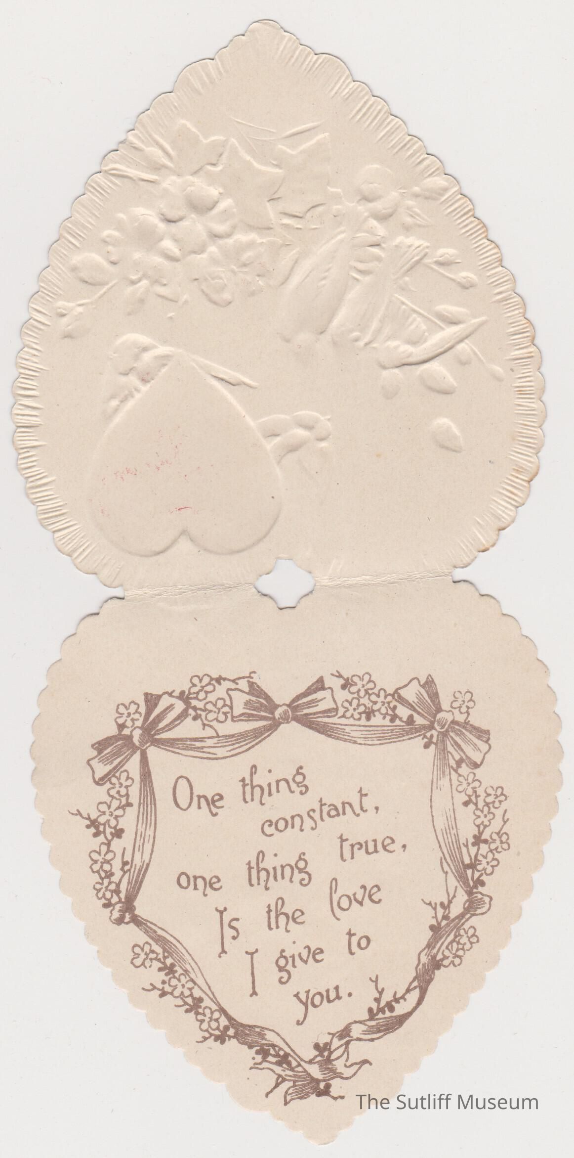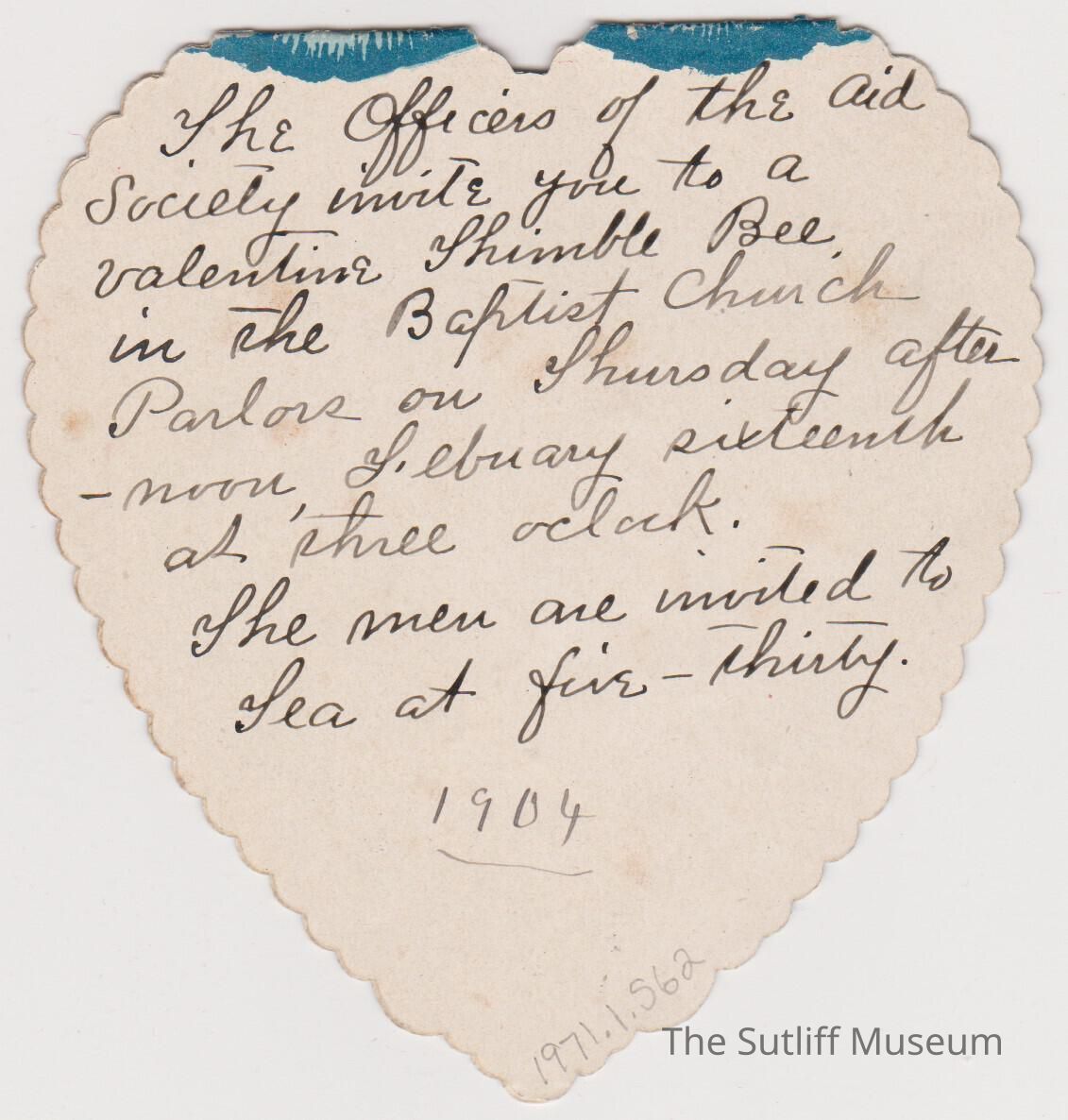 Heart shaped card with flowers and doves on the front "Happy Days/ to my/ Valentine" printed in a heart. Inside card had a floral and bow design and reads "One thing/ constant,/ one thing true./ Is the love/ I give to/ you." The back side of the card in handwritten black ink reads "The Offices of the Aid Society invite you to a Valentine shimble Bee in the Baptist church parlore on Thursday after-noon, February Sixteenth at three o'clock. The men are invited to flea at five-thirty/ 1904"Collection
