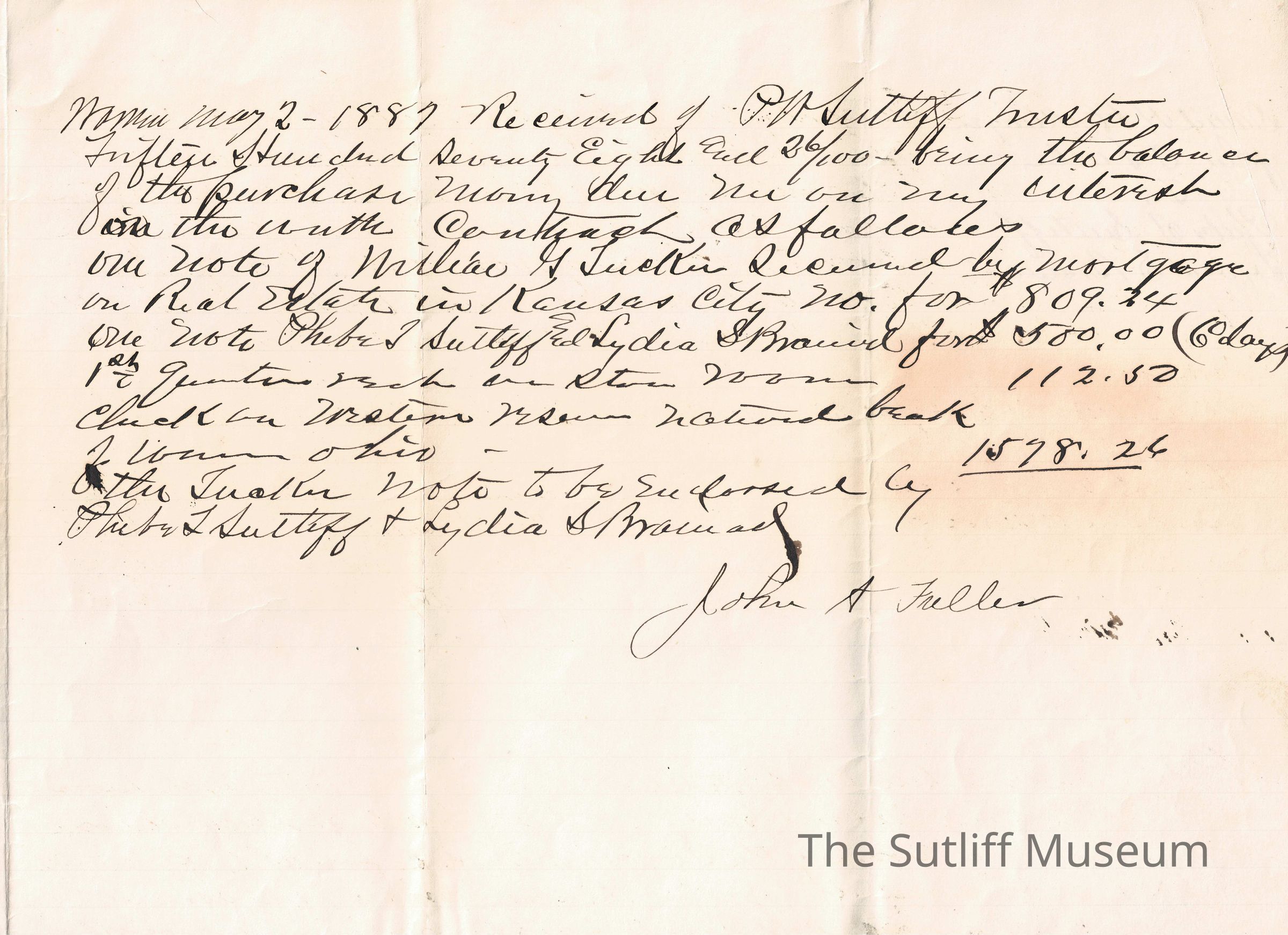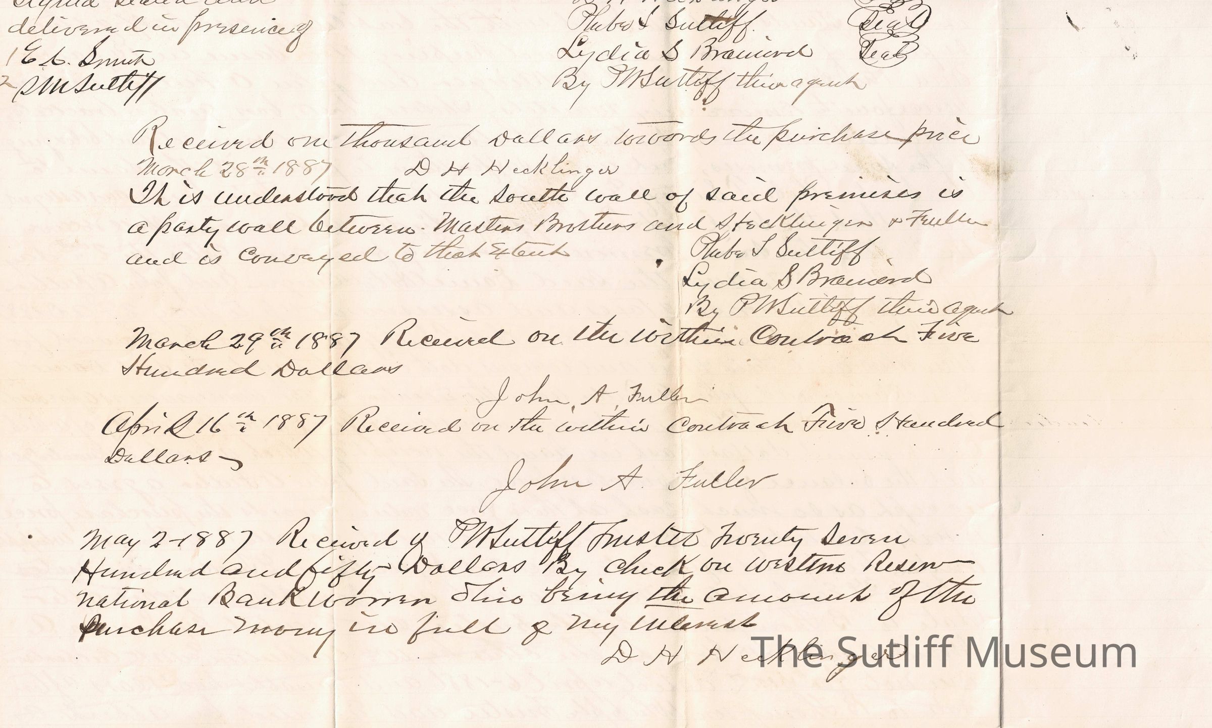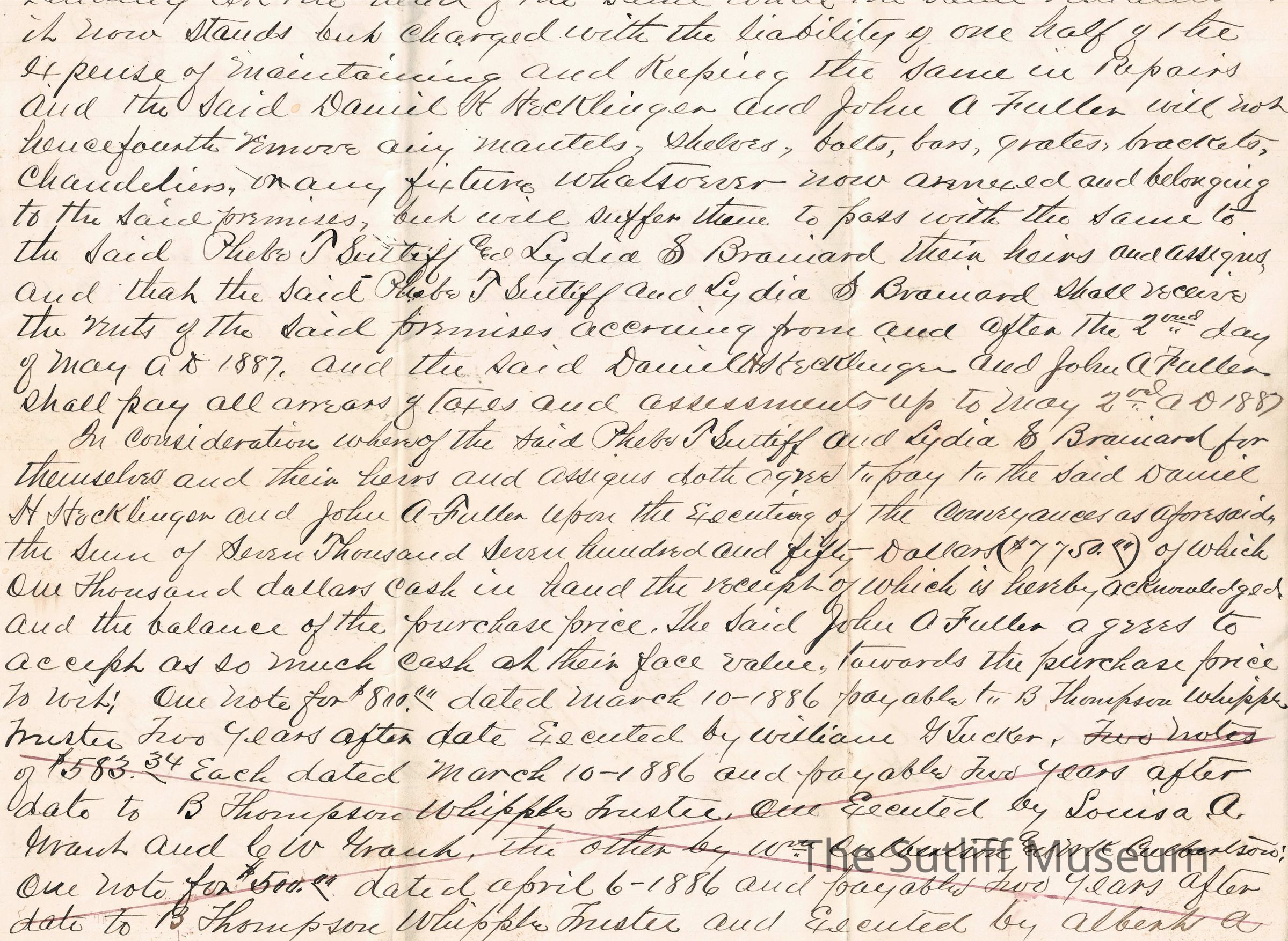 A legal document acting as a contract between David H. Hecklinger and John A. Fuller to Phebe Temperance Sutliff and Lydia Sutliff Brainard.