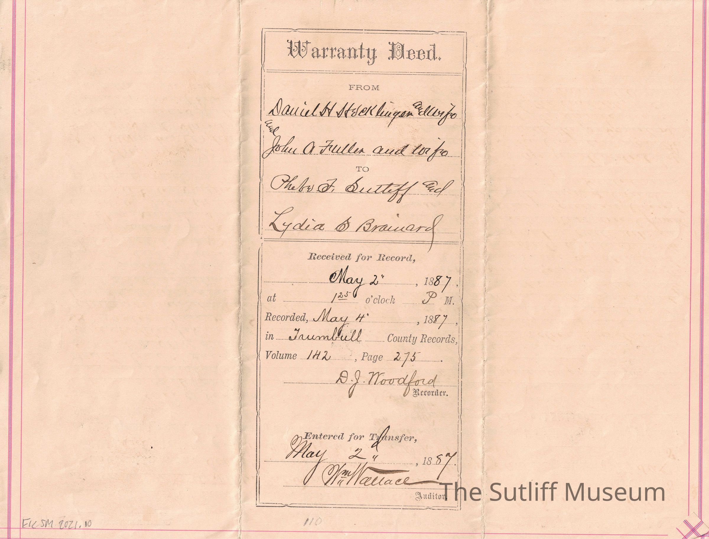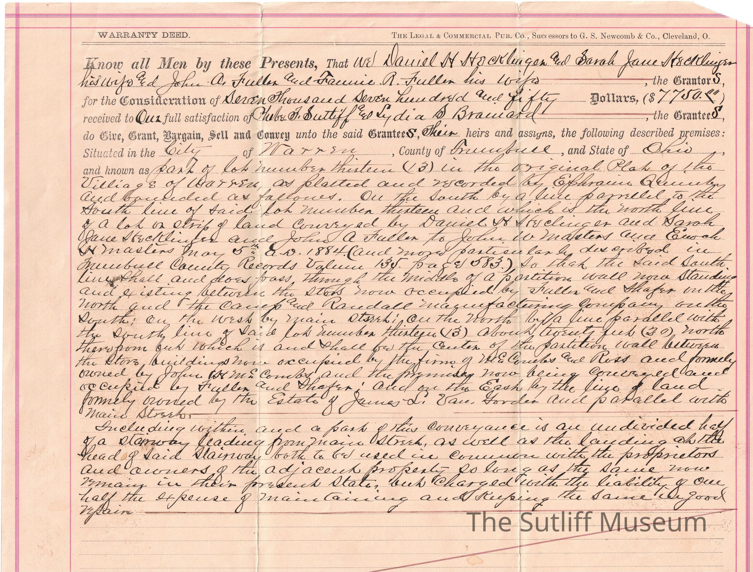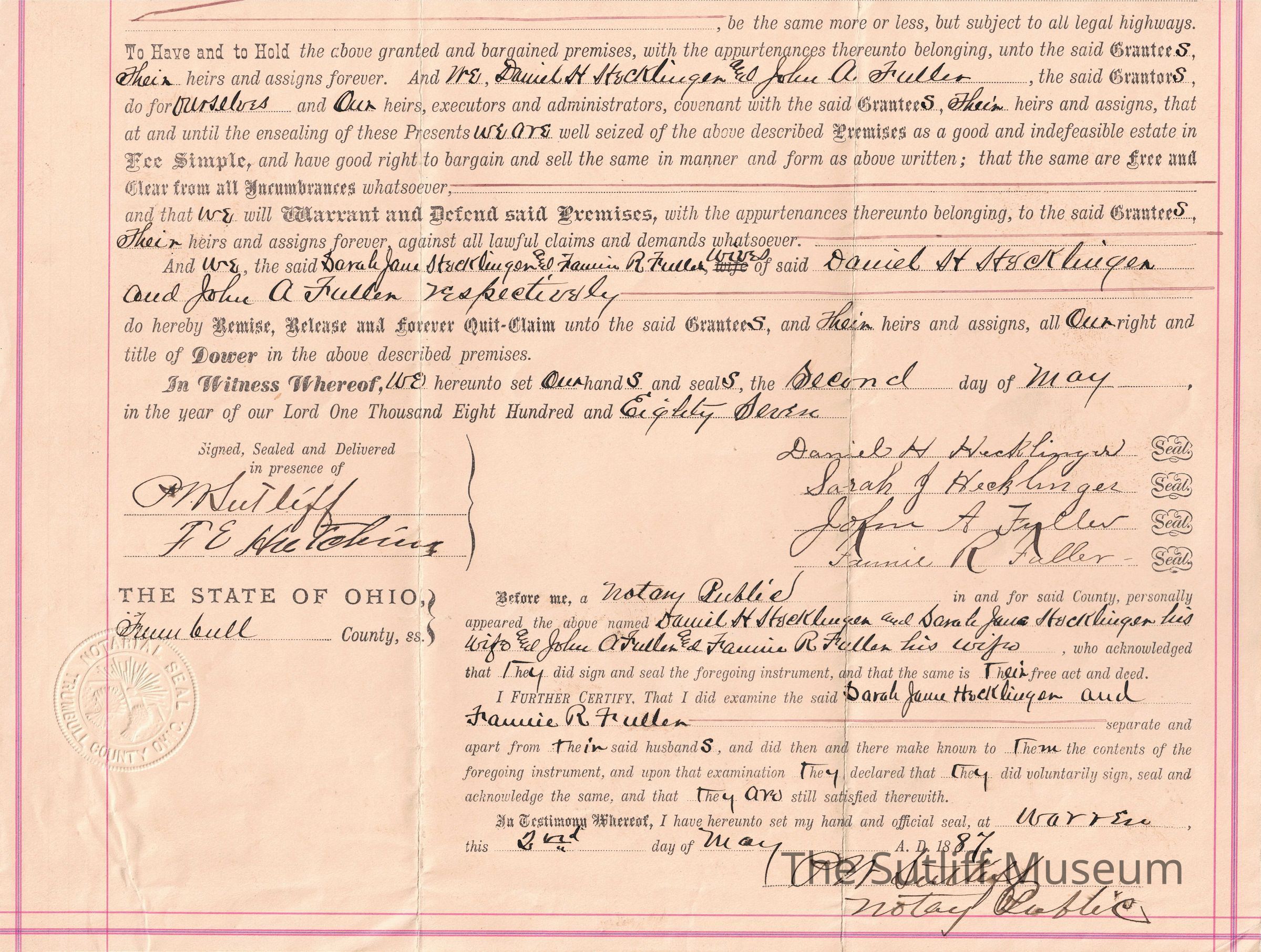 A legal document acting as a deed transfer between David H. Hecklinger and John A. Fuller to Phebe Temperance Sutliff and Lydia Sutliff Brainard.