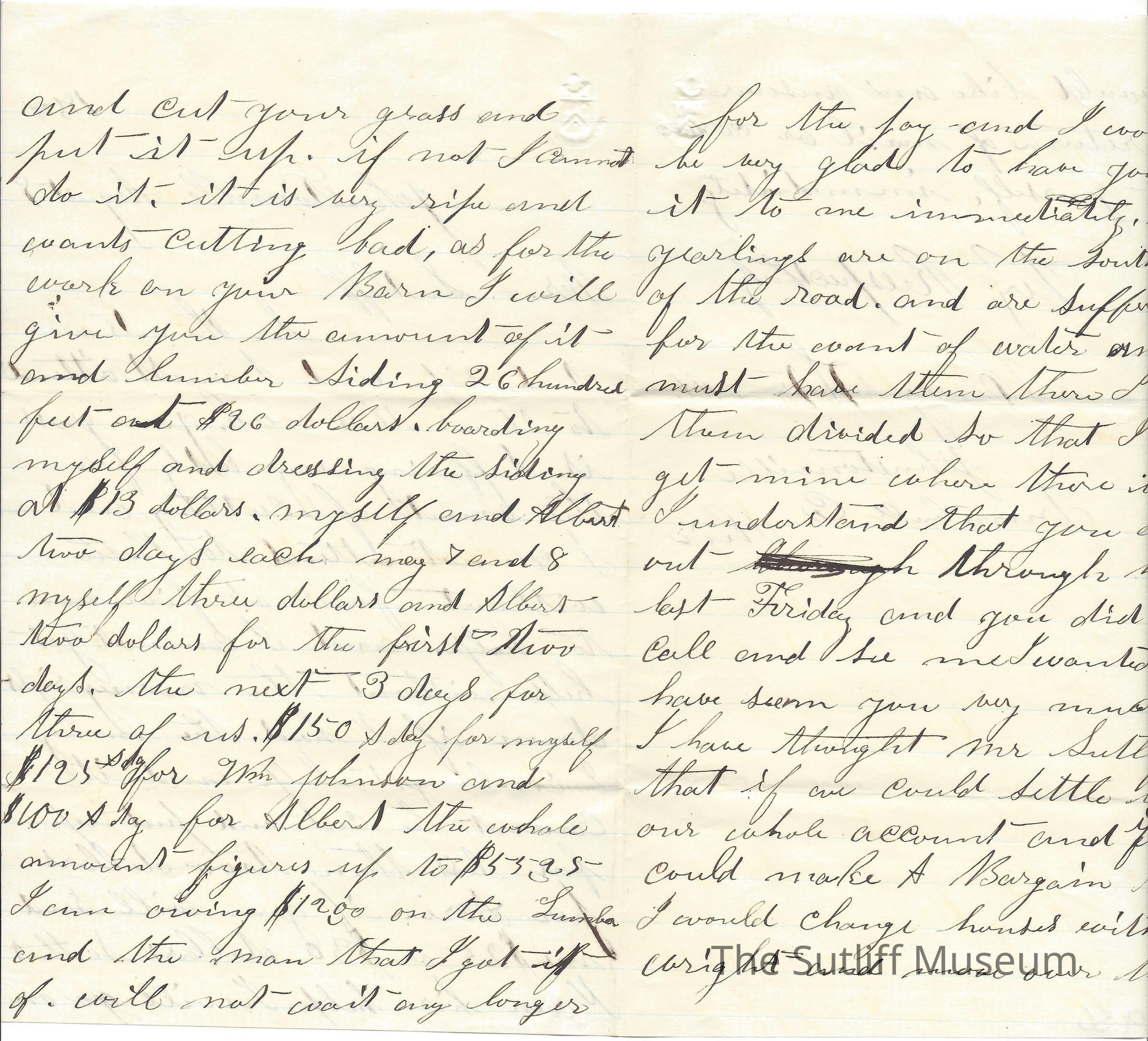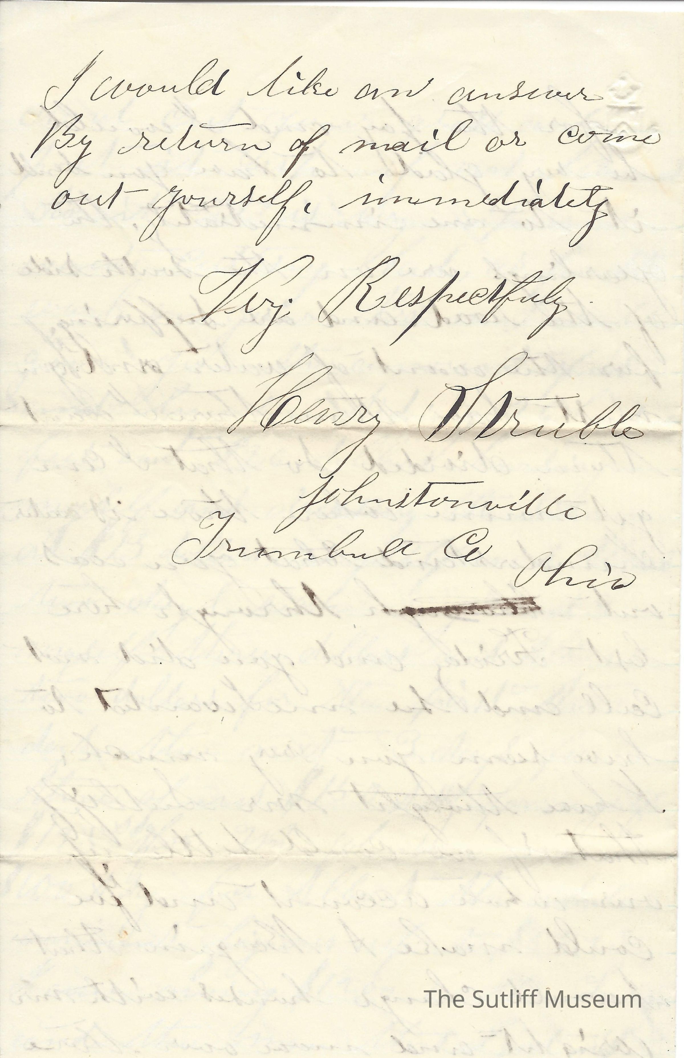 A letter from Henry Struble to Levi Sutliff regarding his land and requesting money to hire help.Collection