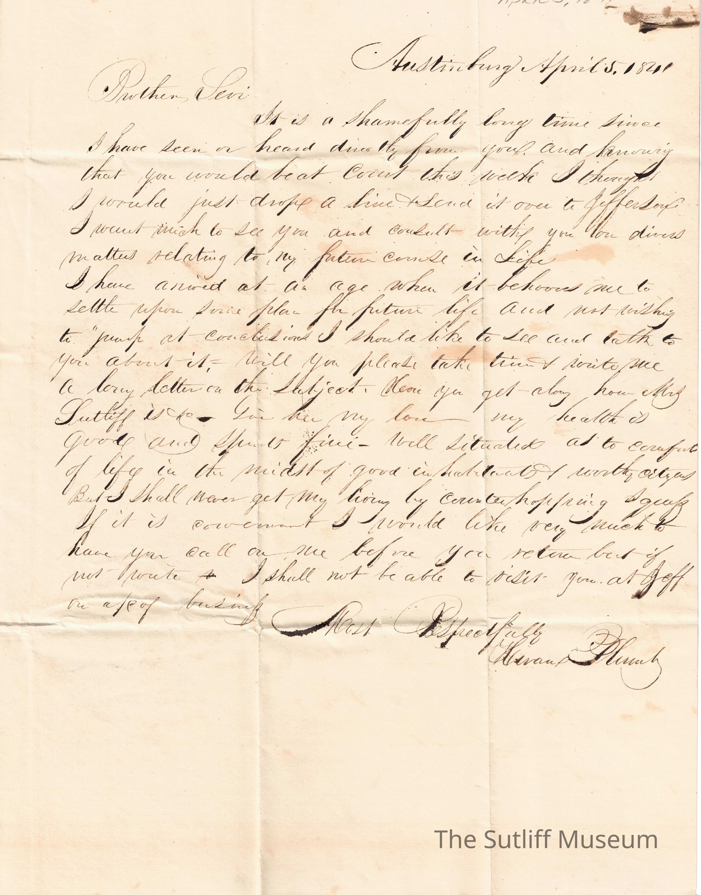 Hiram Plumb writes to Levi to ask him for advice in his "future course in life" to to send his good wishes. He asked Levi to write a long letter to him on the subject. It can be assumed from the letter that he means to get his money in order and wants advice from a lawyer.Collection