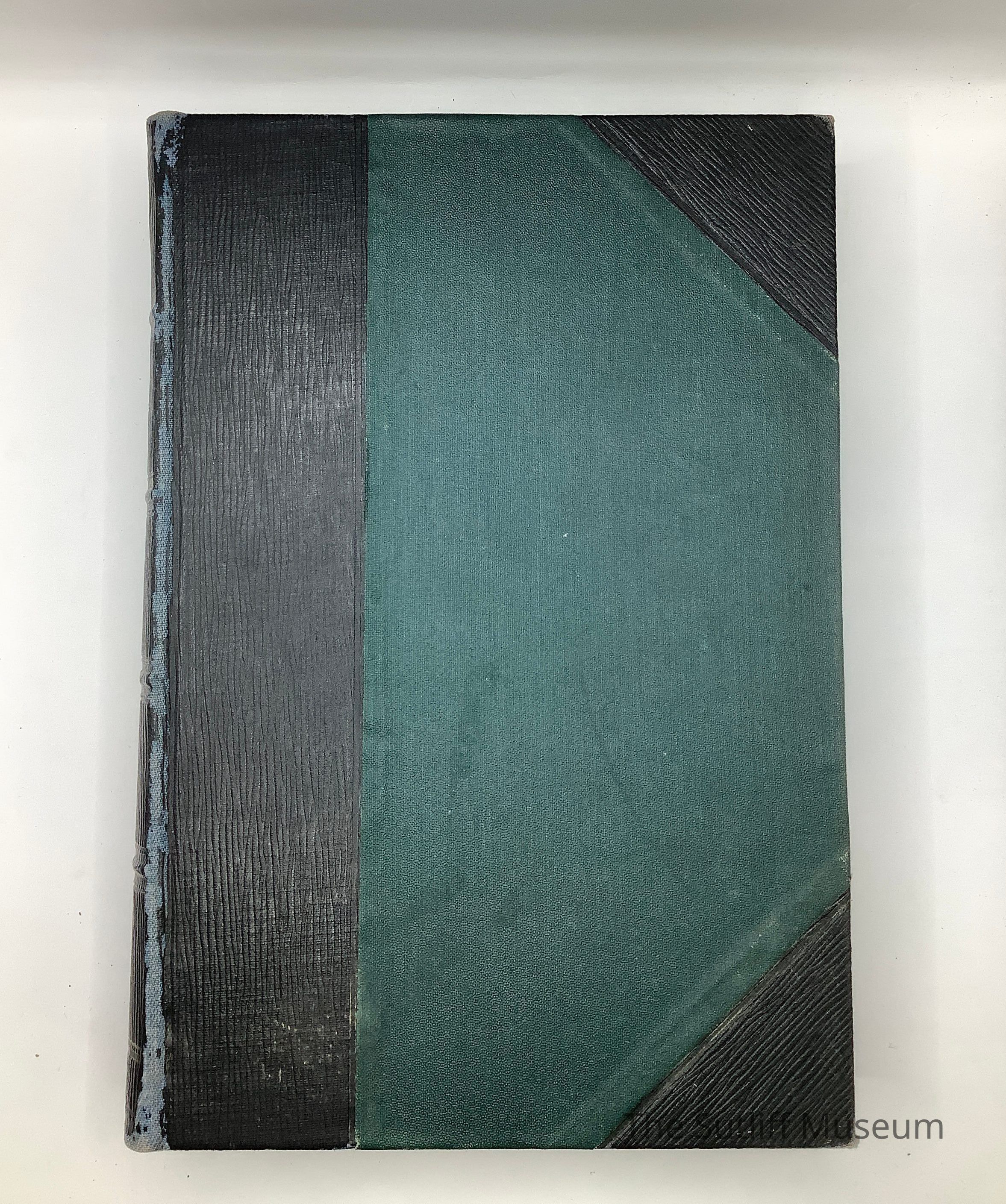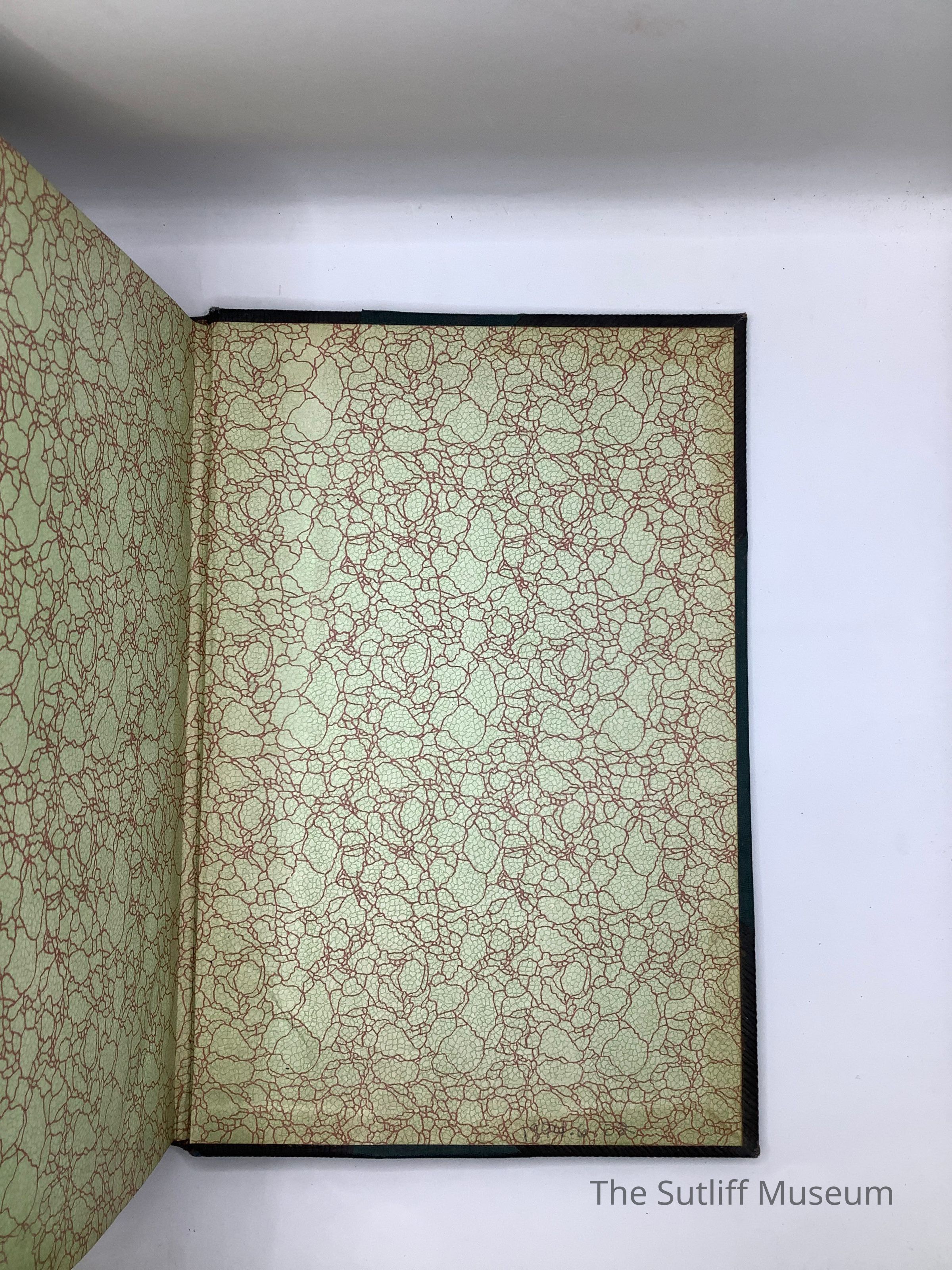 Green and black leather binding. Inside has green and red marble that continues on edges of pages.