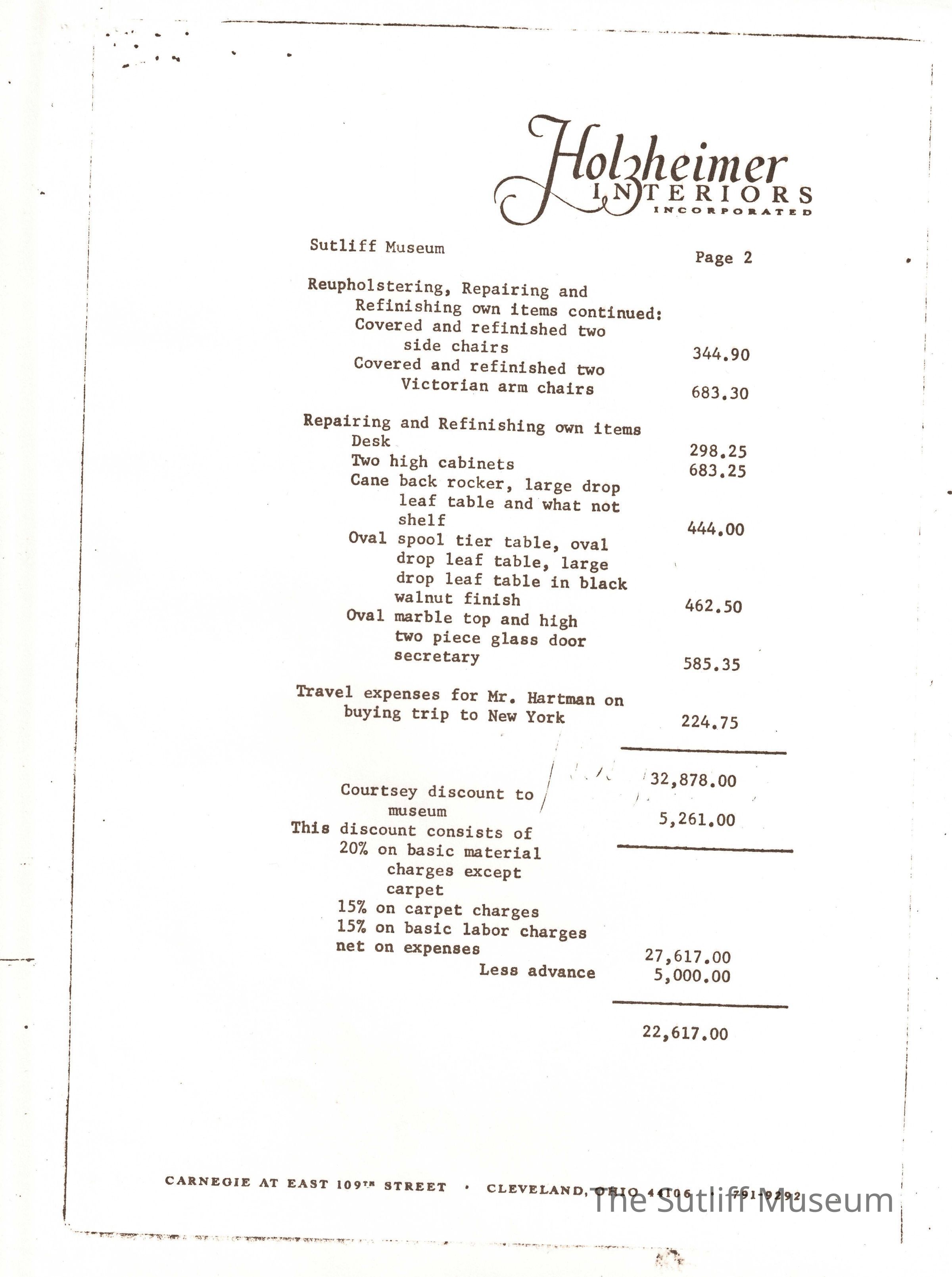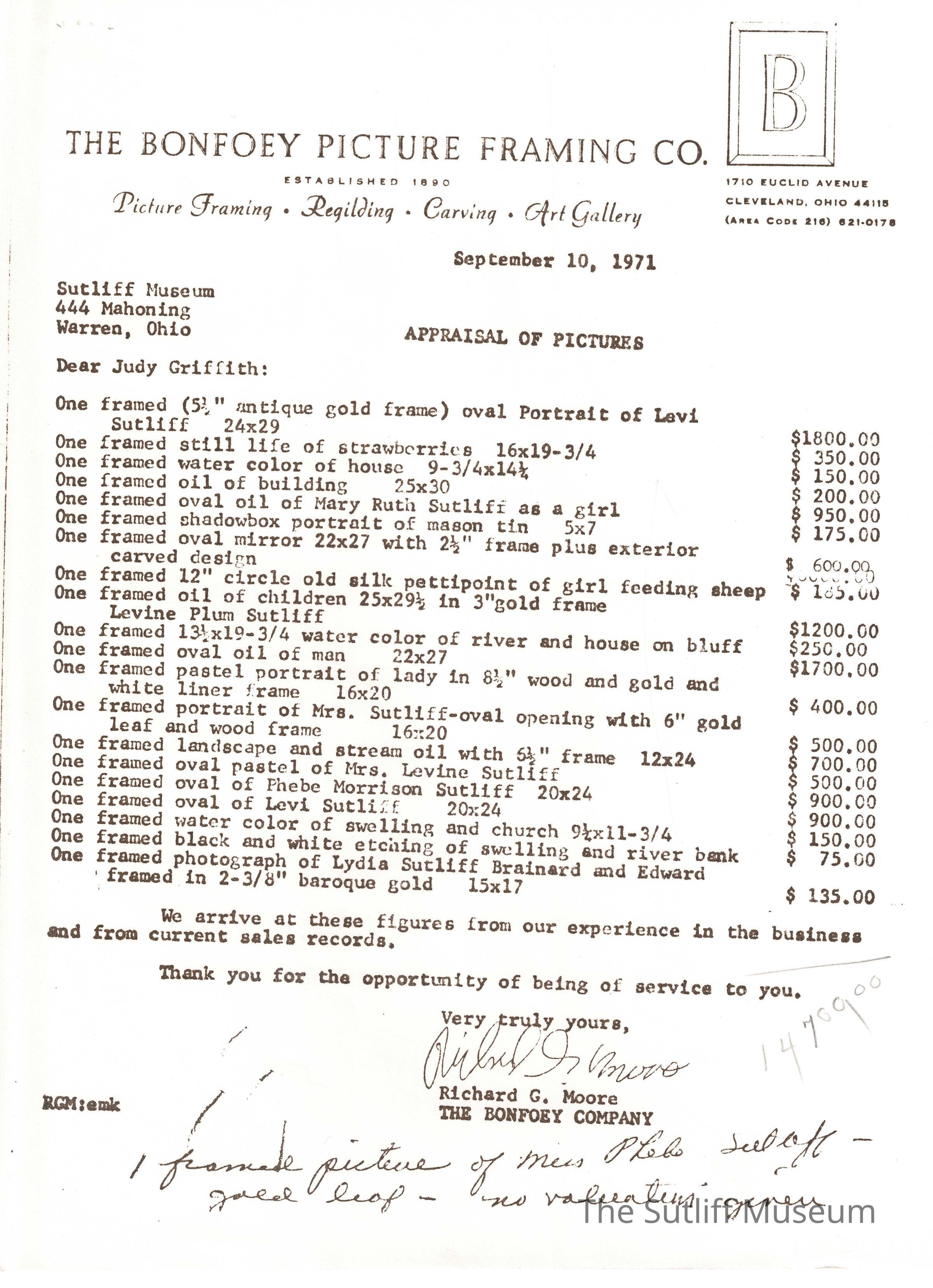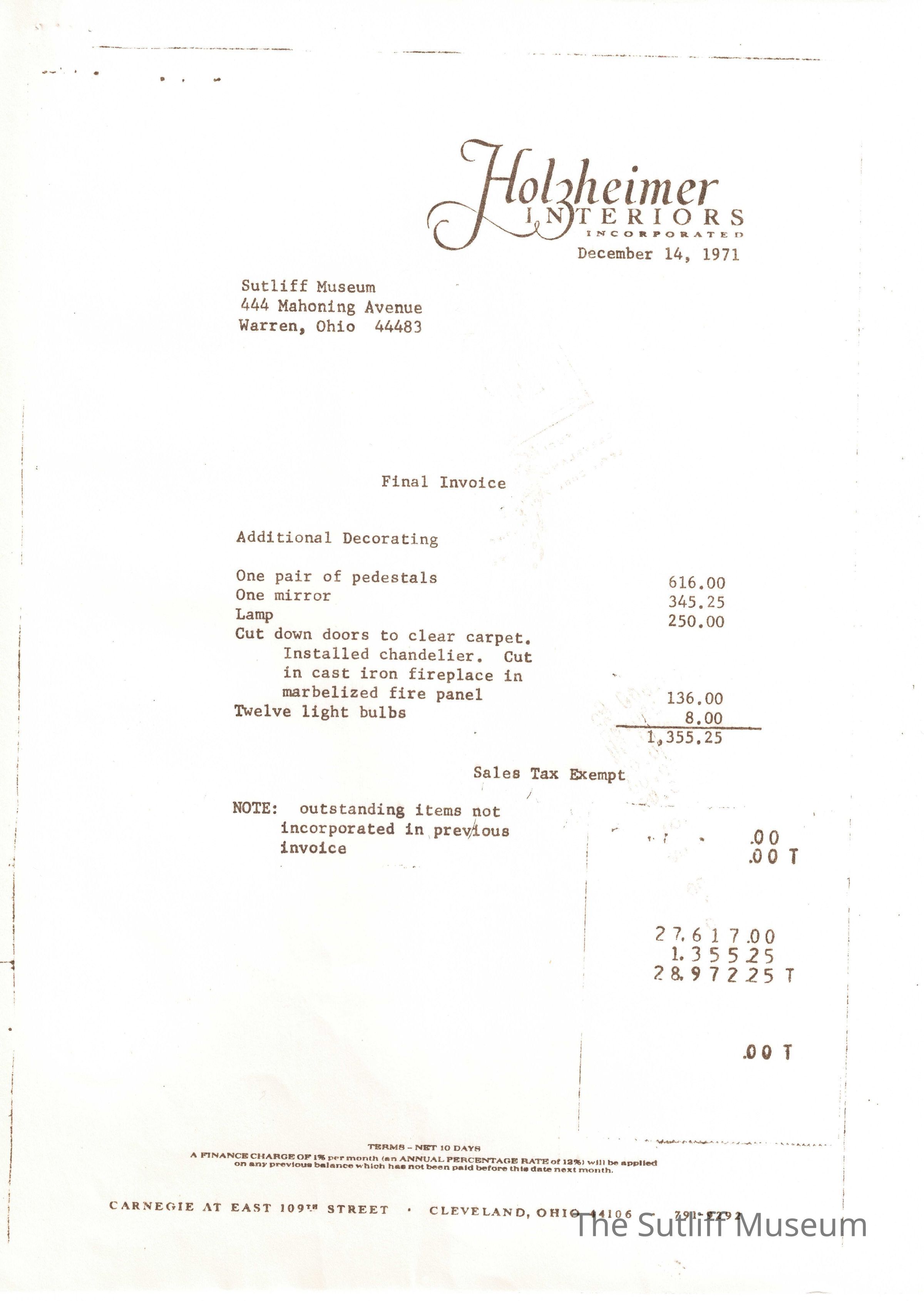 This contains copies of the bill from Holzheimer Interiors, Incorporated for the interior decorating of the Sutliff Museum and an appraisal of pictures from The Bonfoey Picture Framing Co. This also includes a handwritten note stapled to the bill and appraisal for the addition of the framed painting of Phebe T Sutliff to the appraisal form.Collection