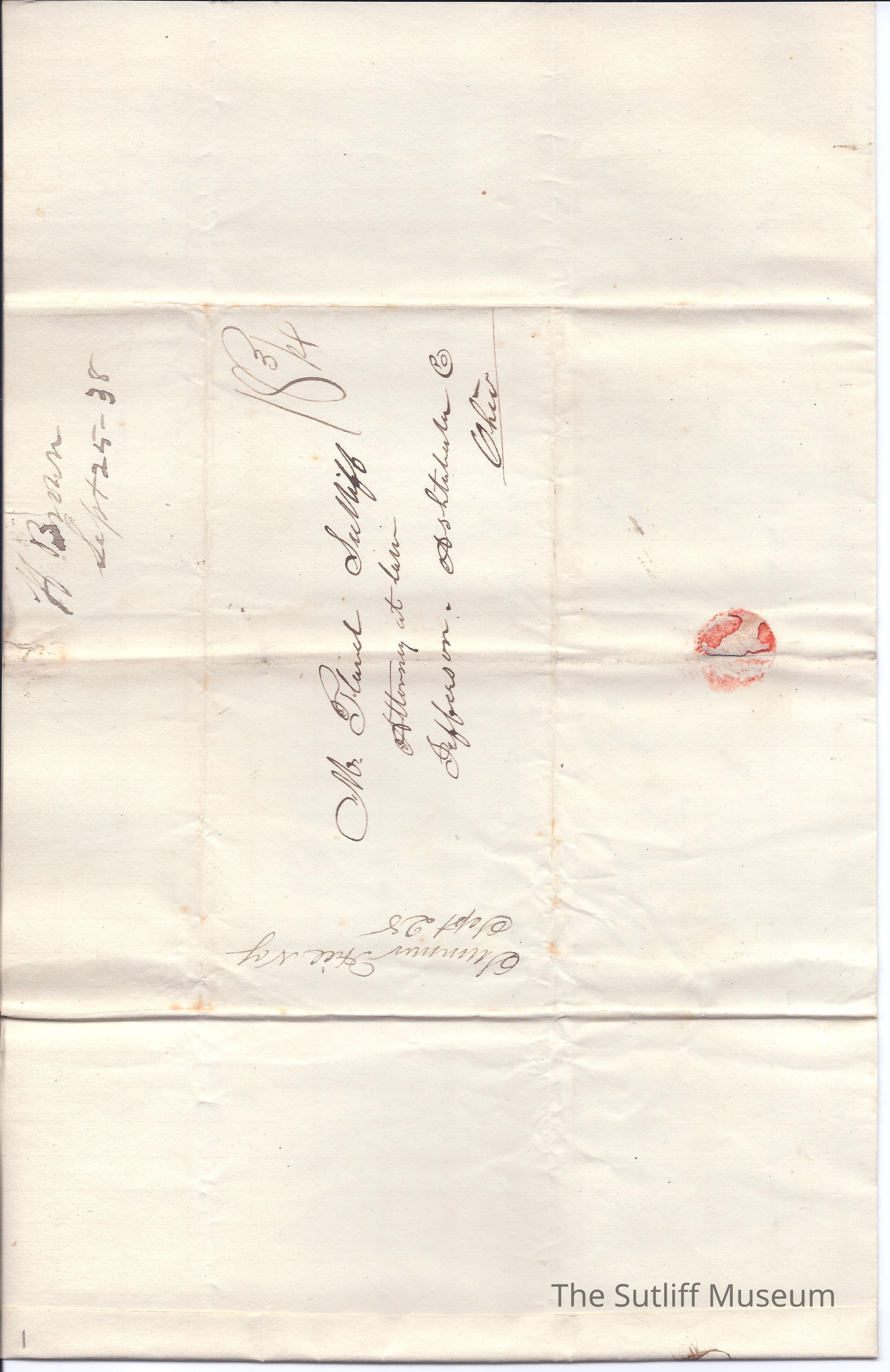 Letter from Horace H Brown to Flavel Sutliff. Horace writes that he is ill and may not make it to Ohio to meet his brother Allen and Flavel. Says if he doesn't make it to have Allen act as he sees fit.
