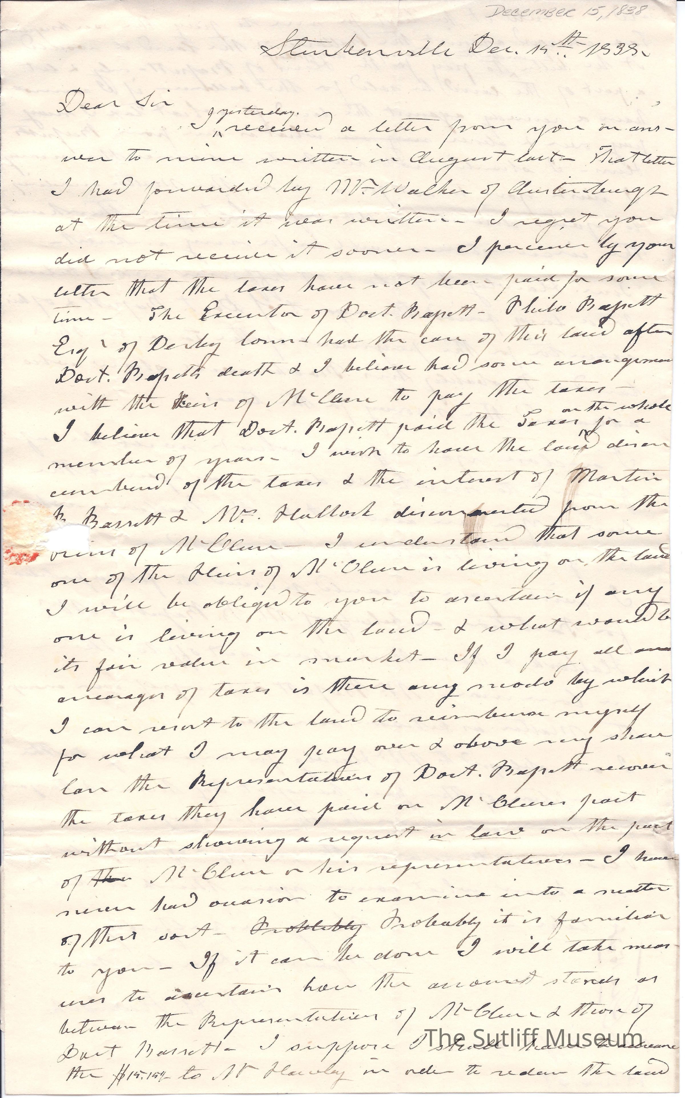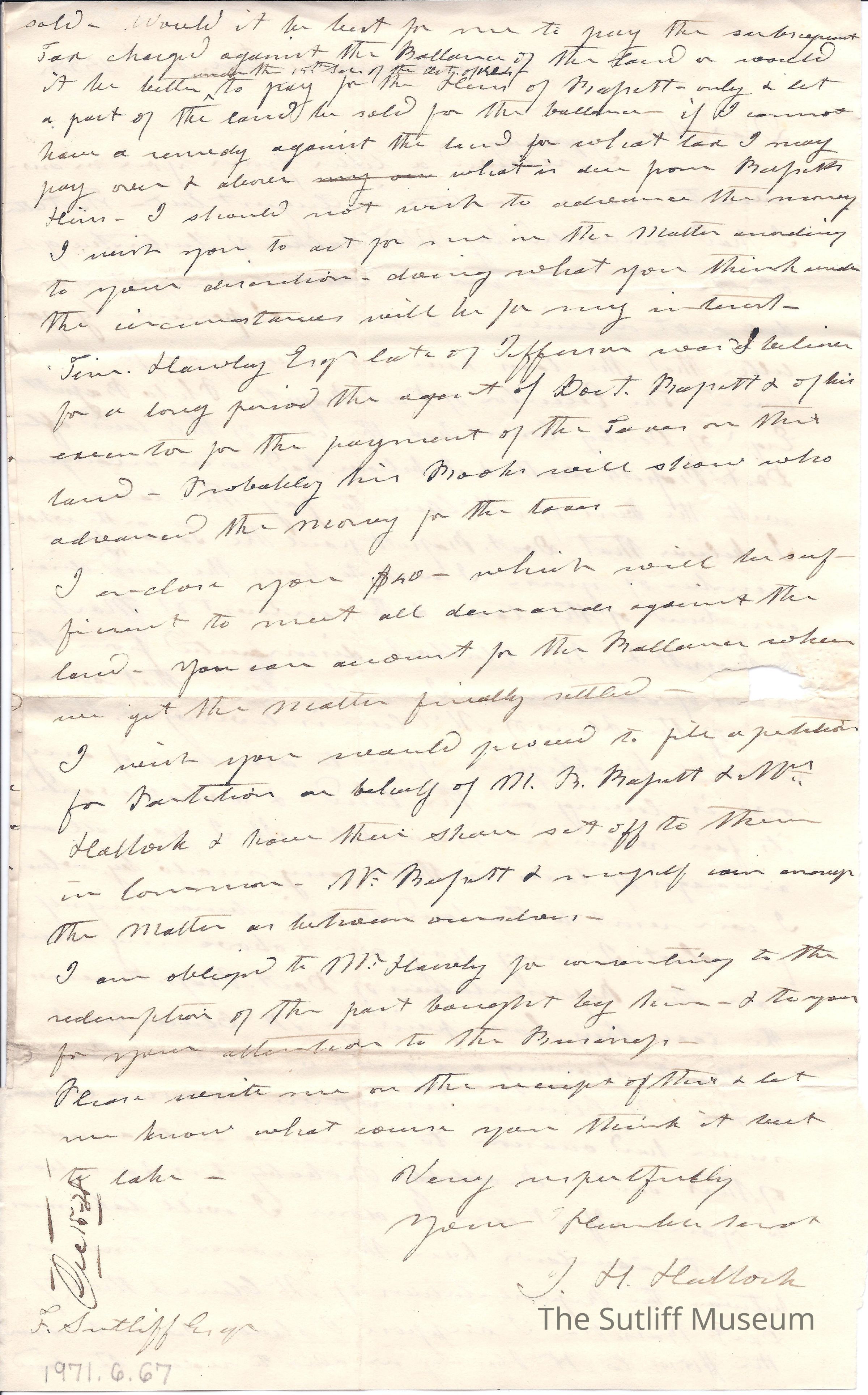 Letter from I.H. Haddock to Flavel Sutliff. A man from Steubenville writes Flavel informing him the taxes on an estate have been settled.Collection