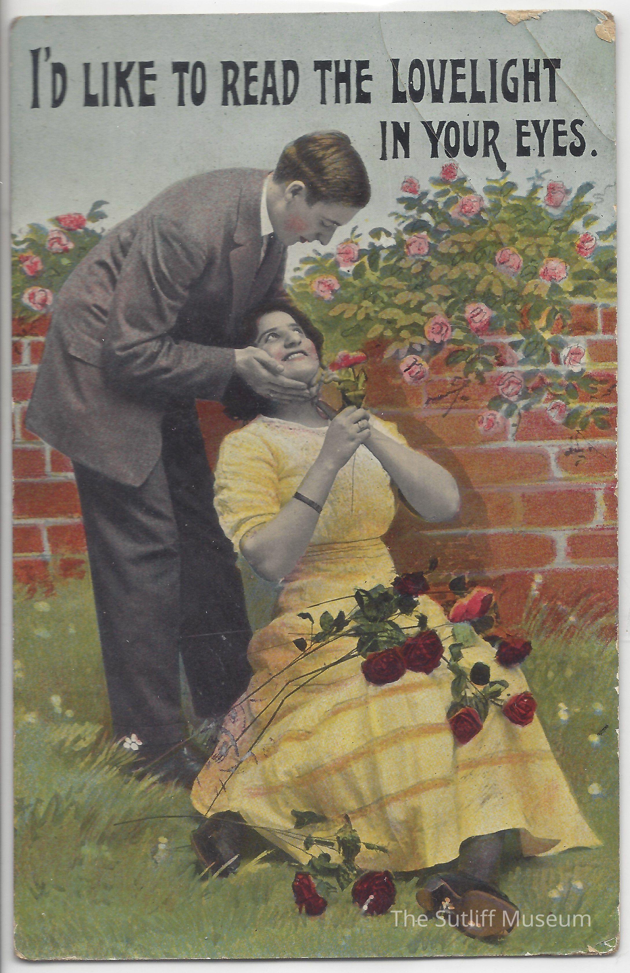 A postcard depicting a couple in a garden with the phrase "I'd Like to Read the Lovelight In Your Eyes."