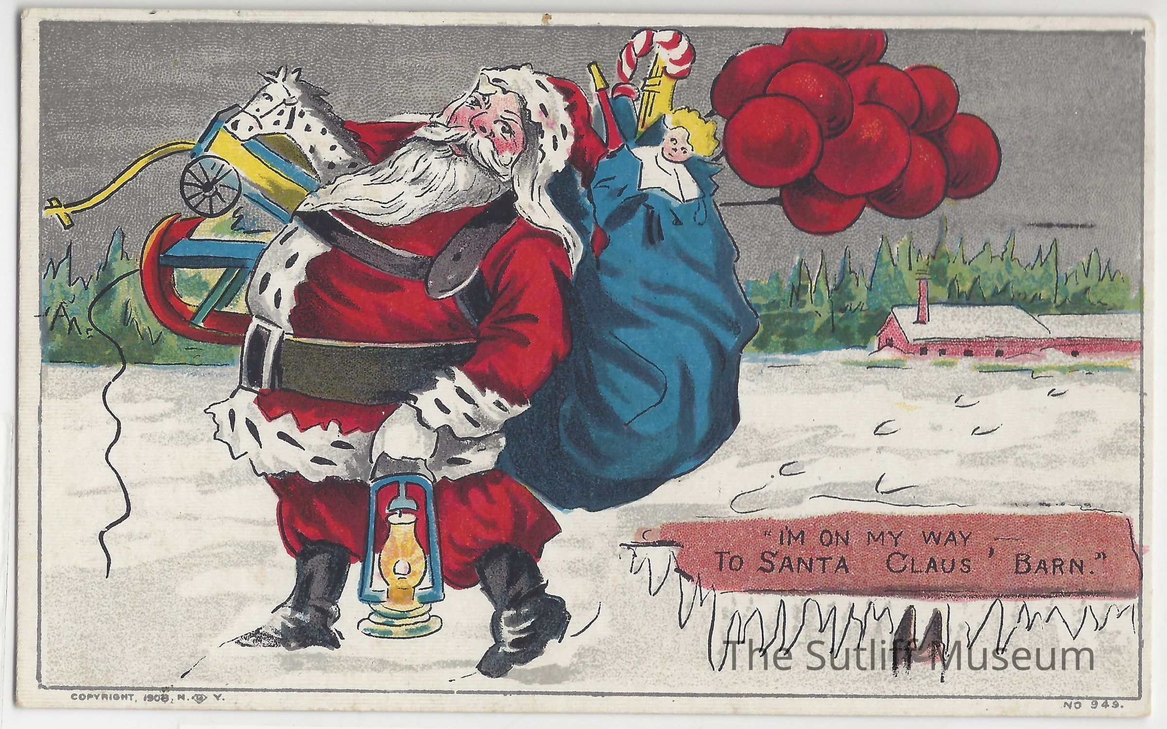 Christmas postcard depicting Santa Claus and his bag of toys. In black text, "I'm On My Way, To Santa Claus' Barn." in all capitals on the bottom right corner.
