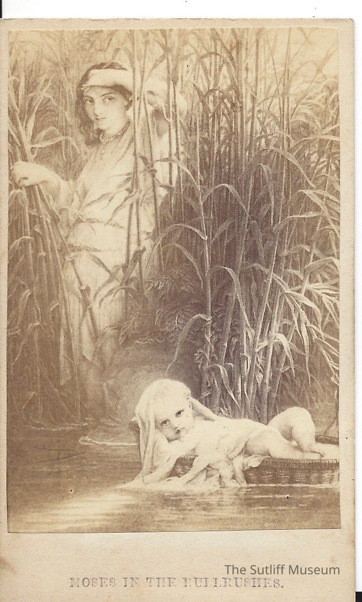 Postcard of a woman looking towards the water where there is a baby in a basket entitled "Moses in the Bullbrushes." Signed on the back "Phebe Sutliff"
