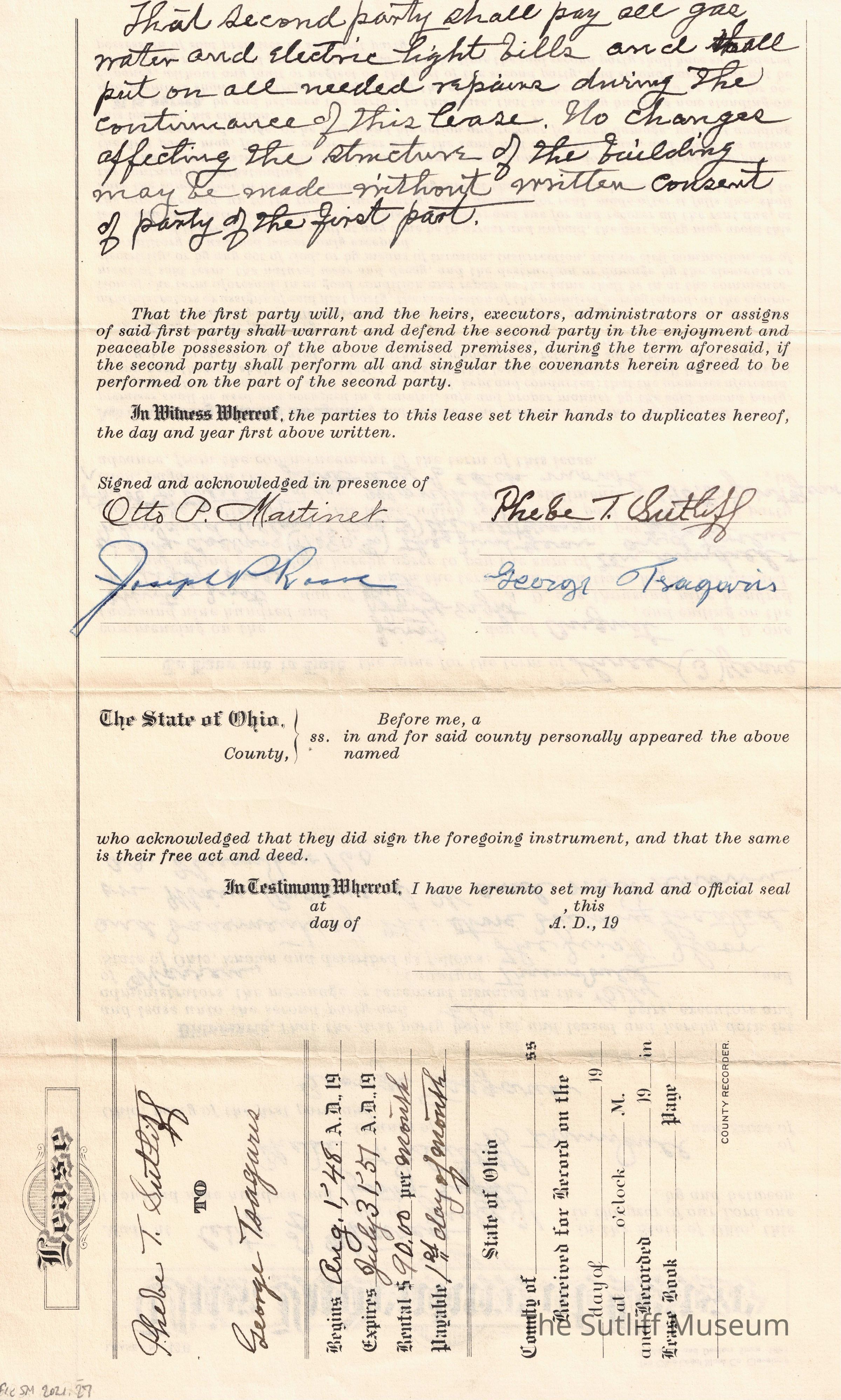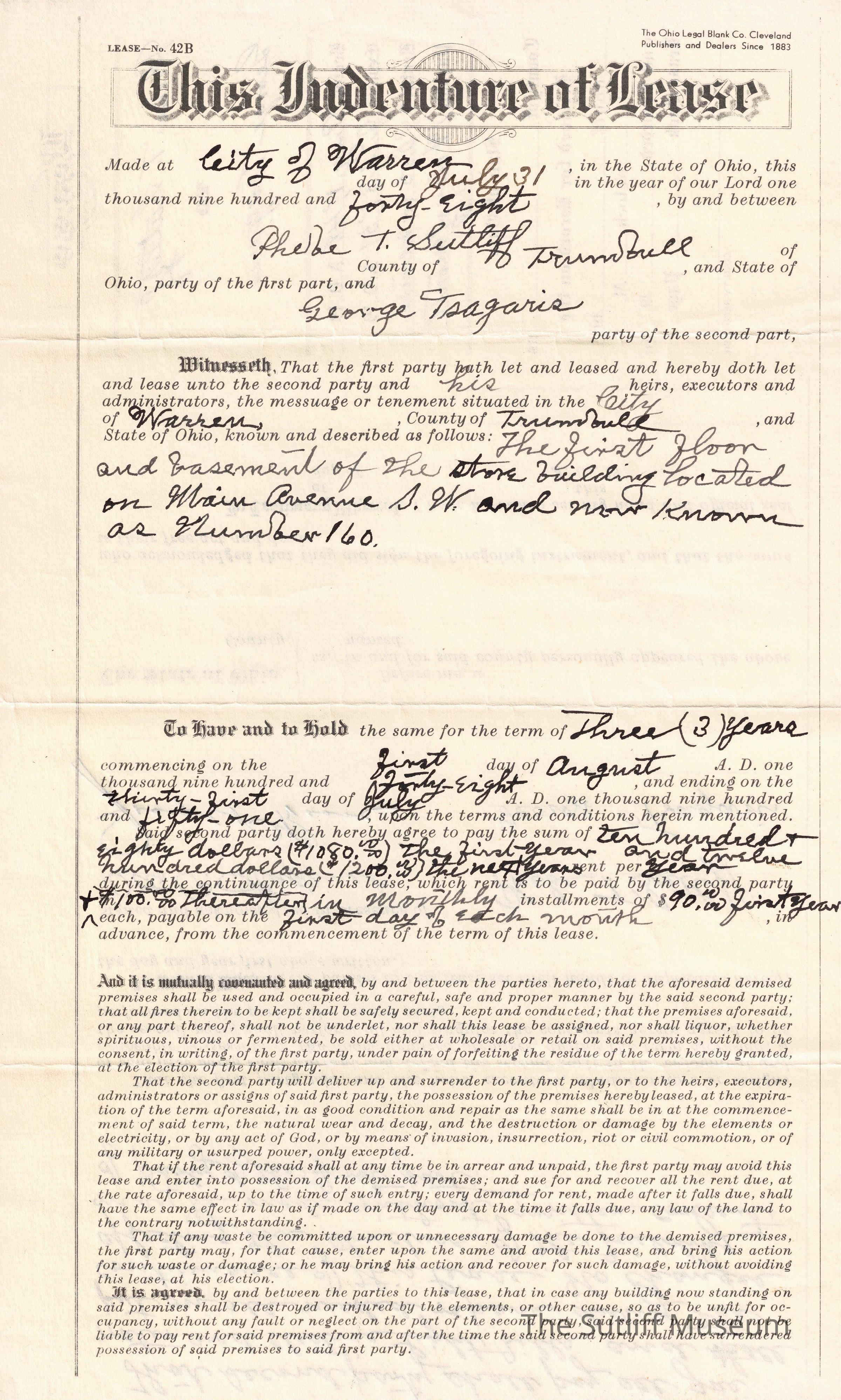 A Indenture of Lease between Phebe Temperance Sutliff and George Tsagaris to last 3 years, starting August 1, 1948.Relationships