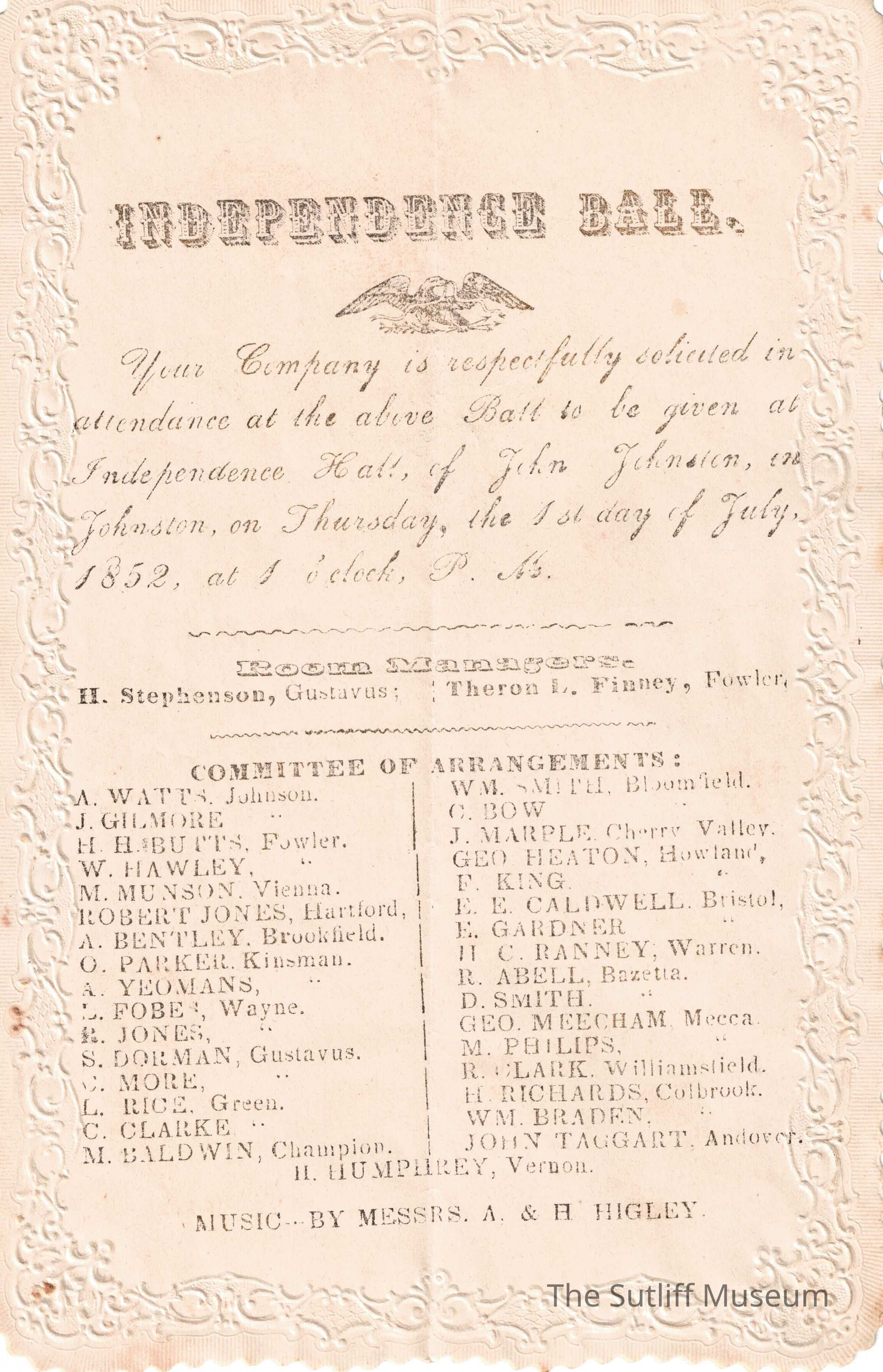 An invitation to the Independence Ball, to take place July 1, 1852 at Independence Hall of John Johnston.