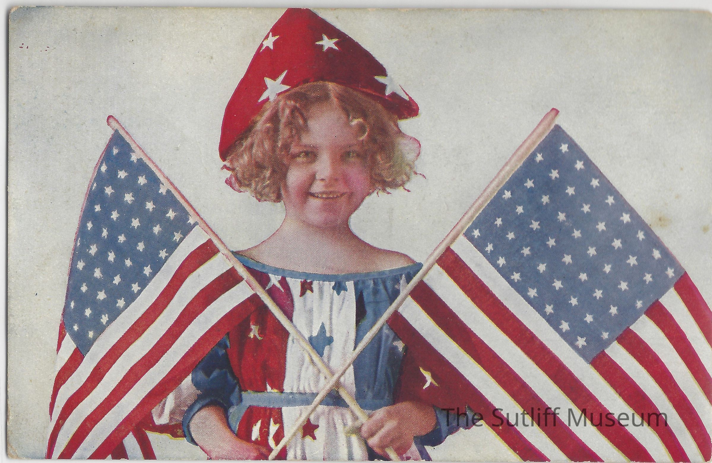 Patriotic postcard depicting a little girl in a red, white, and blue dress holding two crossing American flags.