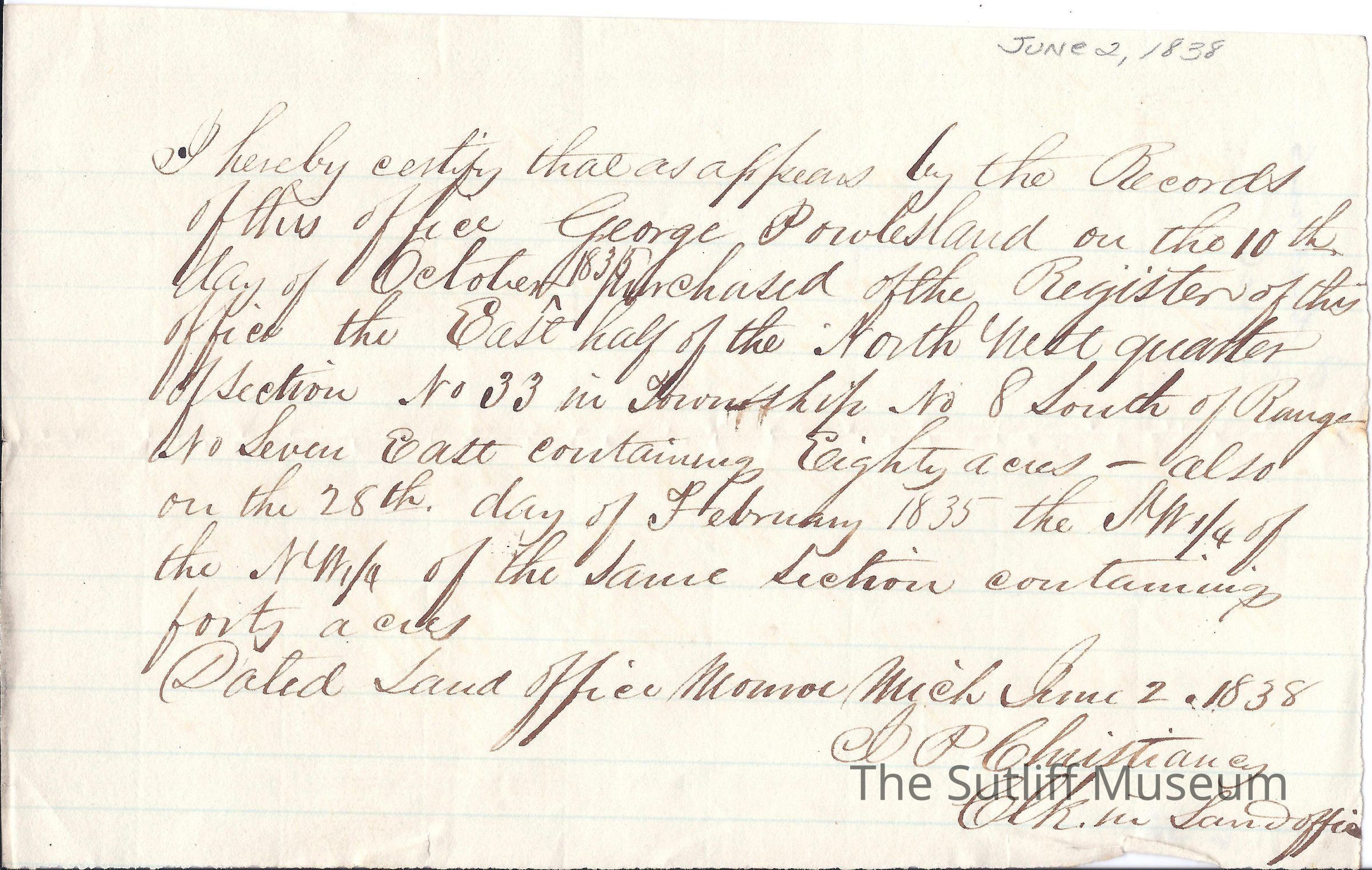 Isaac Peckham Christiancy to Flavel Sutliff. Note from the Monroe, Michigan Land Office verifying that George Powlesland purchased a tract.