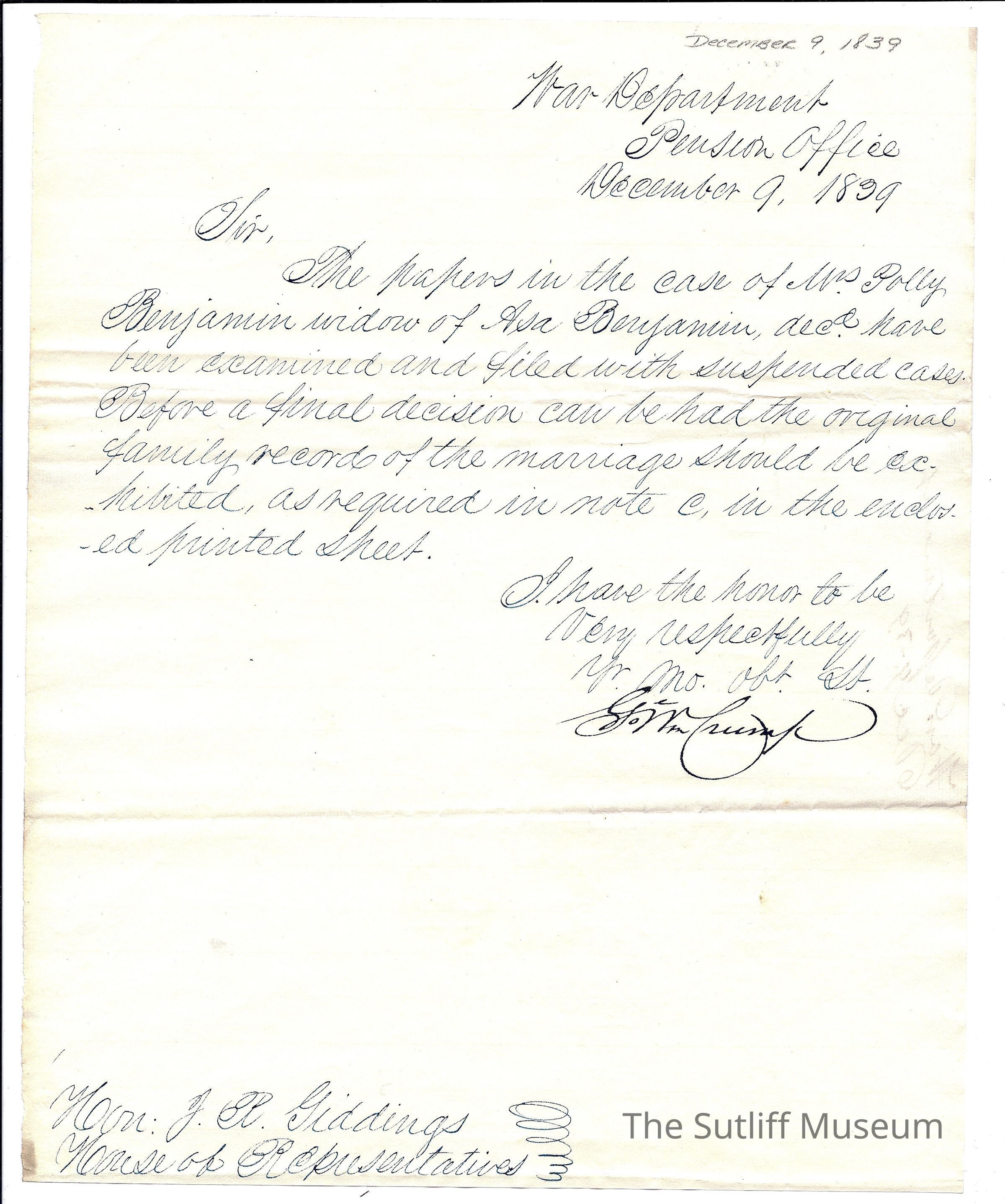 A letter from Joshua Reed Giddings to the War Department regarding a legal case of the Benjamin family.Collection