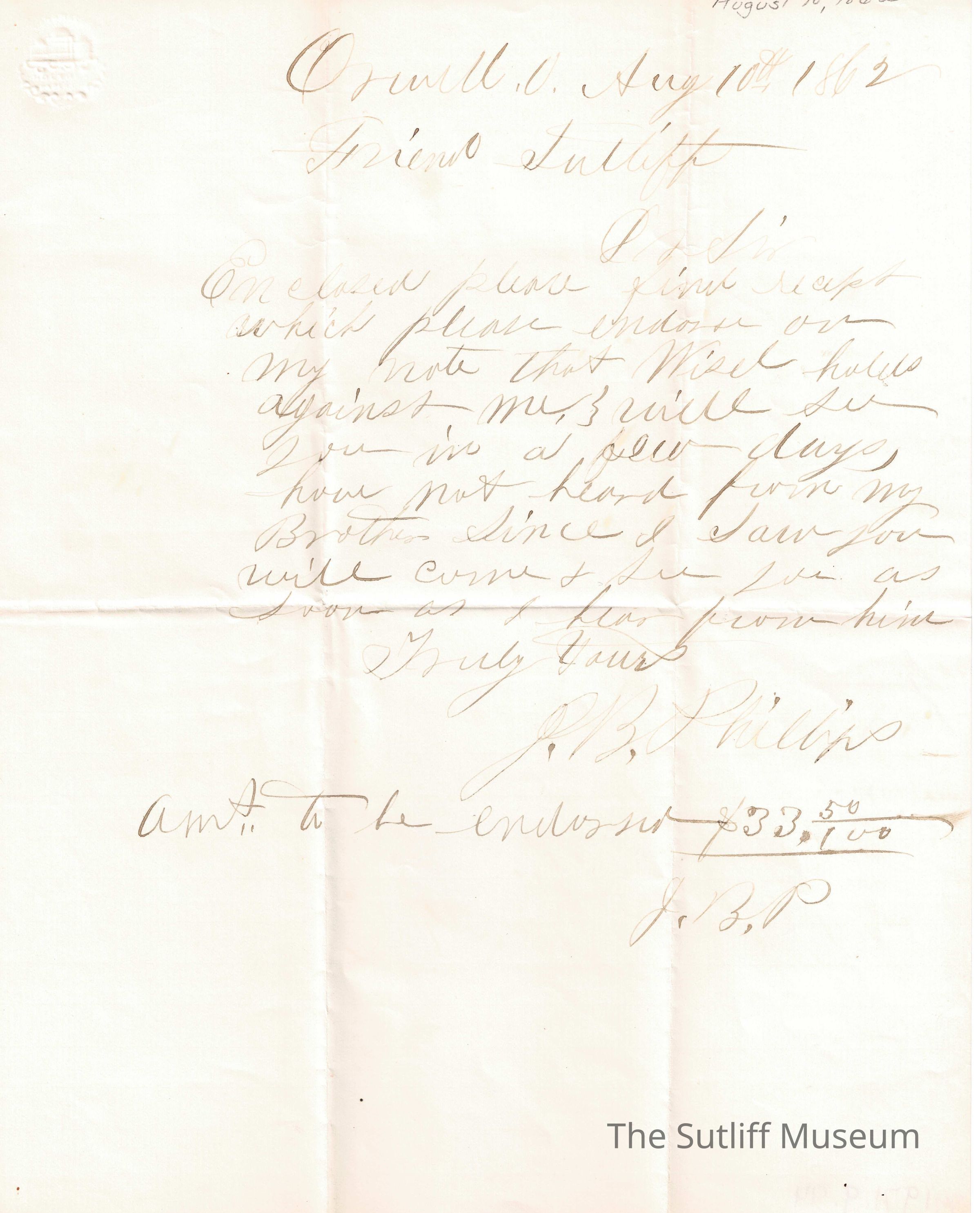 A letter from J.B. Phillips to Levi Sutliff regarding his receipt and that he has not seen his brother.Collection