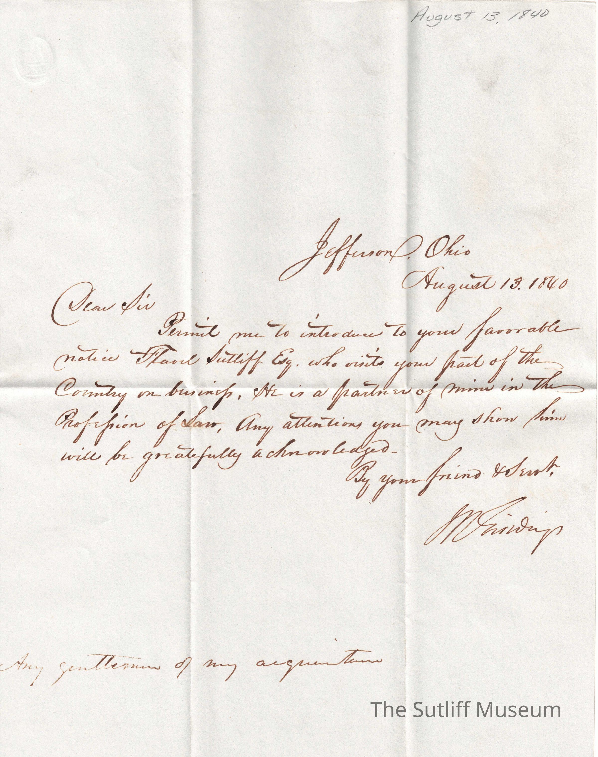Letter from Joshua Reed Giddings sent to various people representing and speaking on behalf of Flavel Sutliff for business.