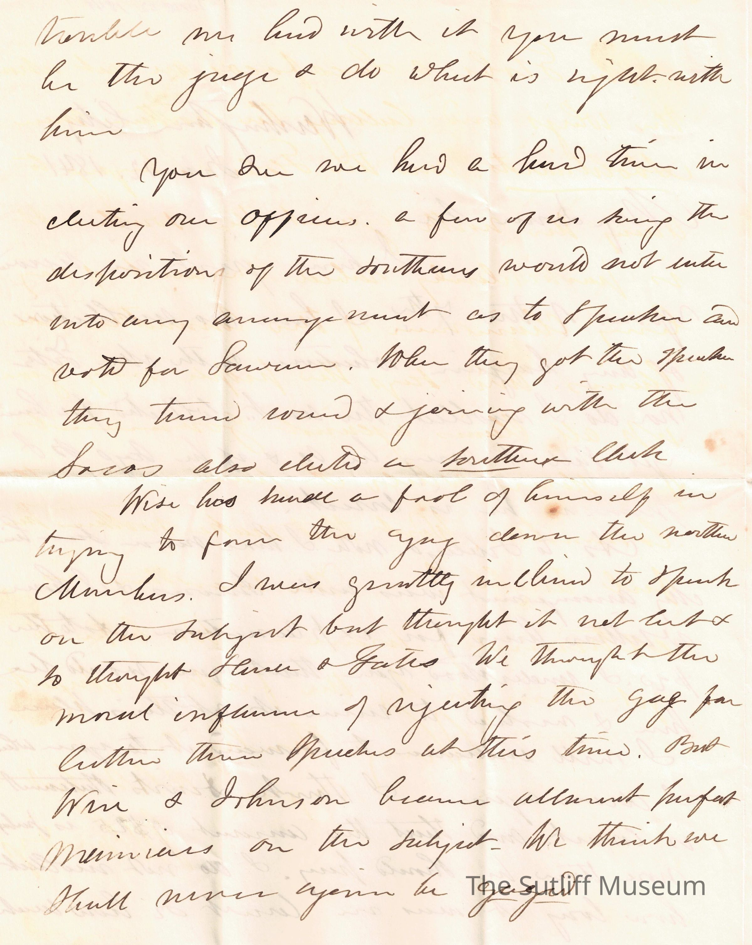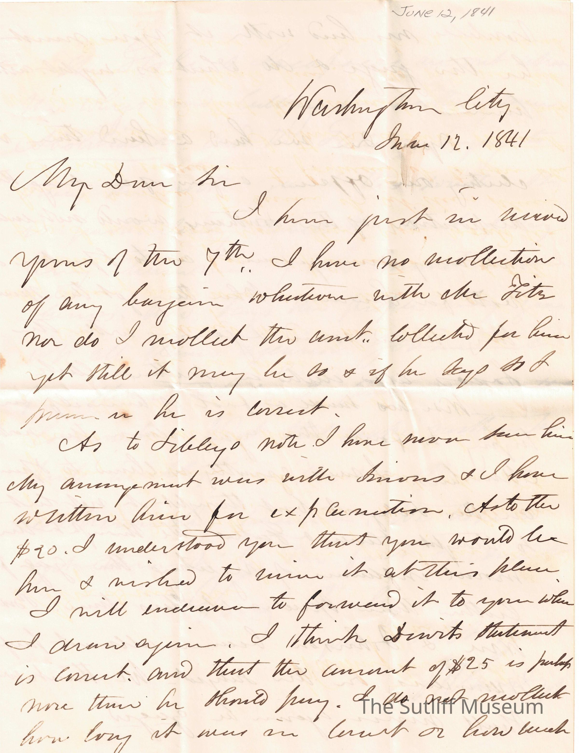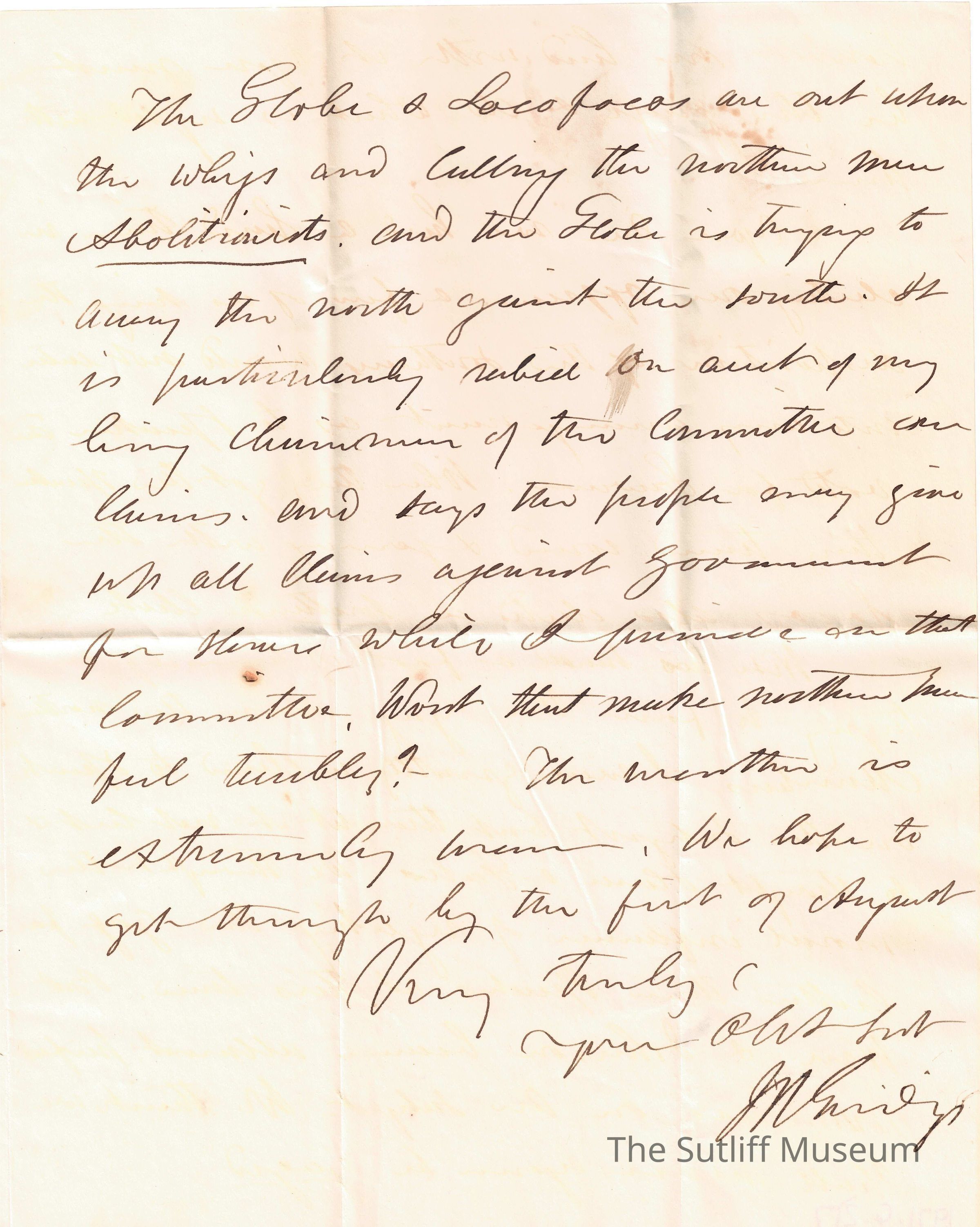 Letter from Joshua Reed Giddings to Flavel Sutliff regarding money and politics.Collection