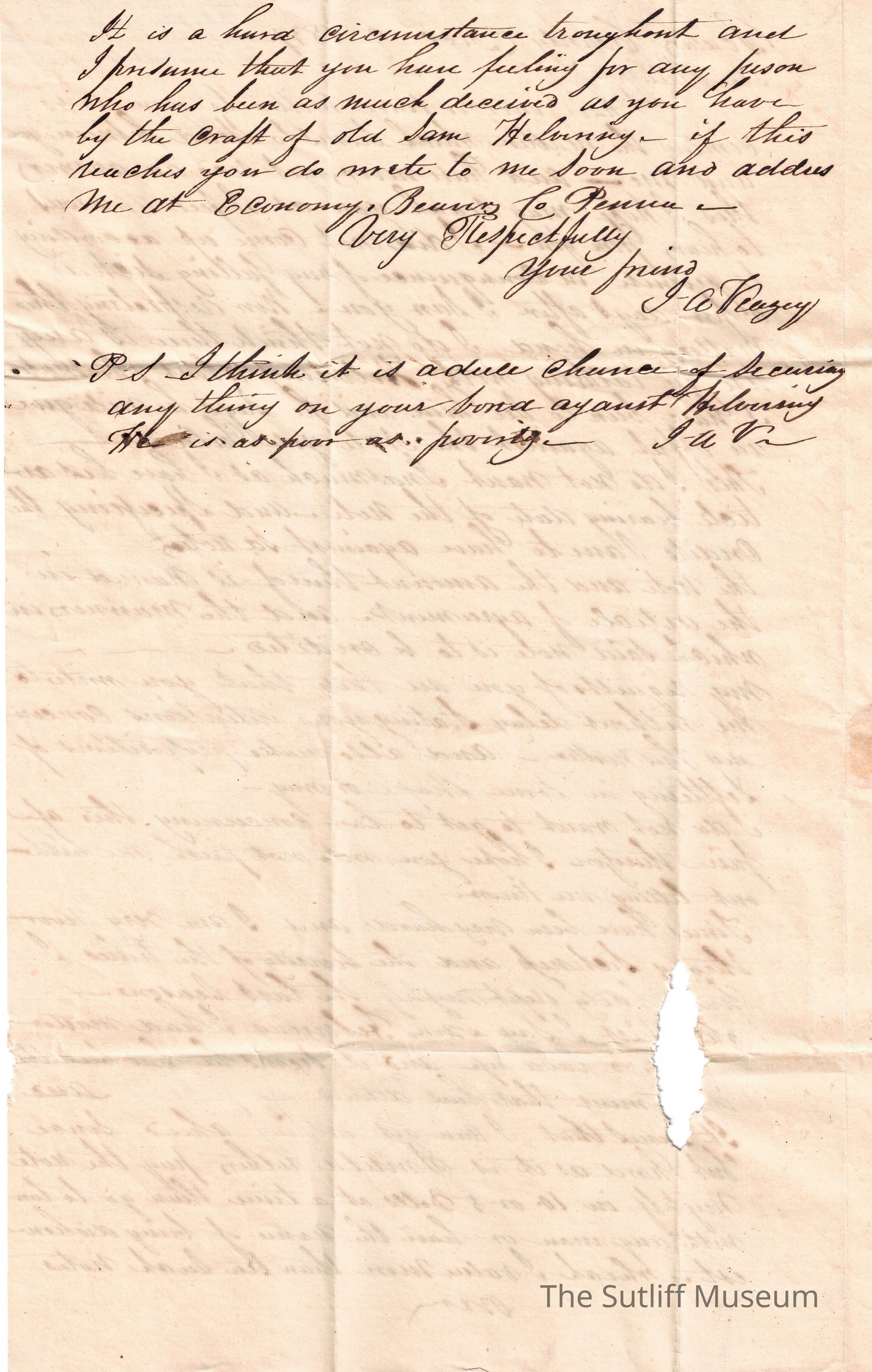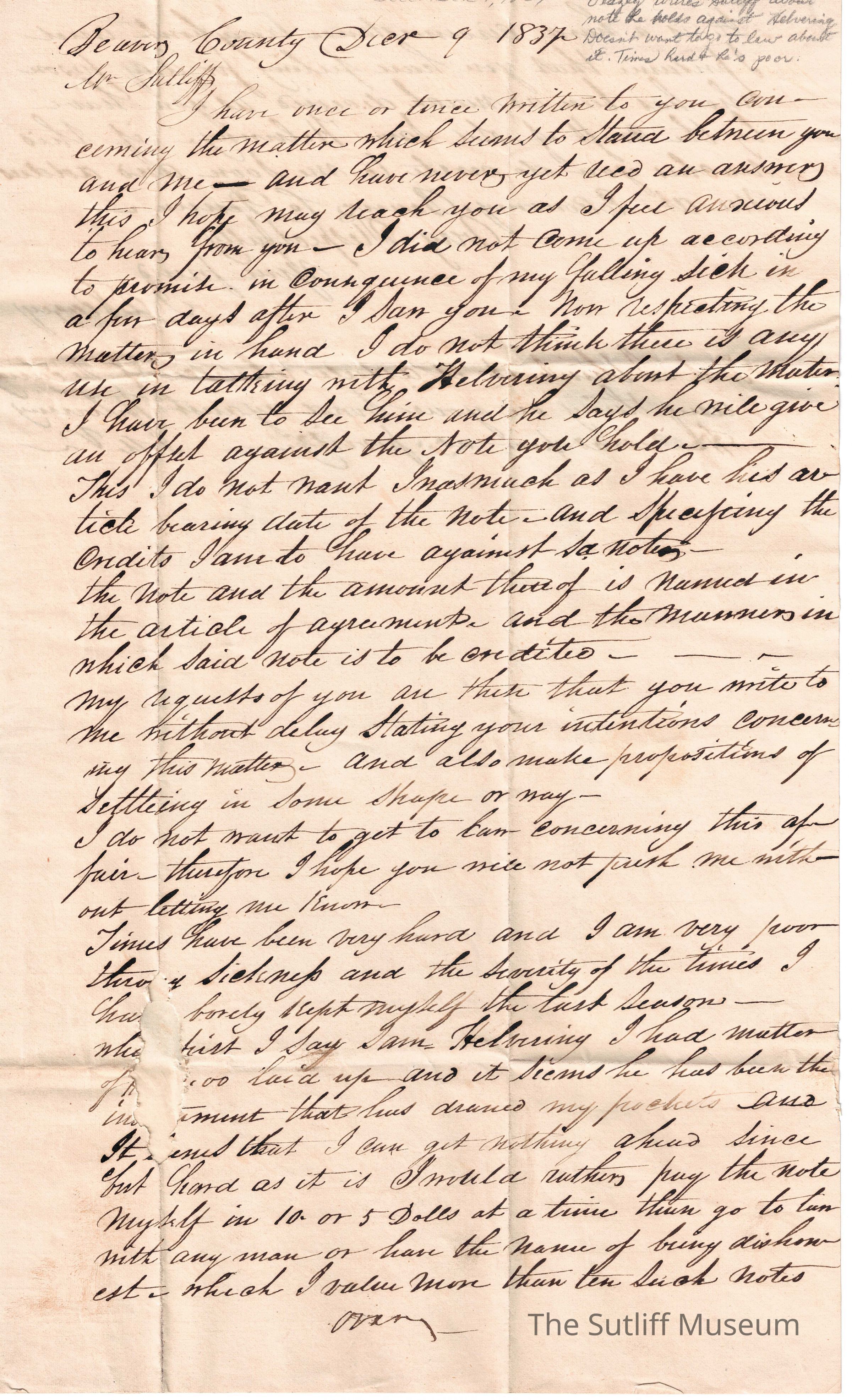 JA Veagey writes to Levi Sutliff concerning a note Sutliff holds for him and that Samuel Helvering will give Sutliff an offer against the note. Veagey does not want this because and wishes Sutliff to reply about settling the note. Veagey has been ill of late and Helvering has been draining his pockets. Veagey would rather pay the note back in $10/$5 increments than give the whole amount at once to a man he sees as dishonest.Collection