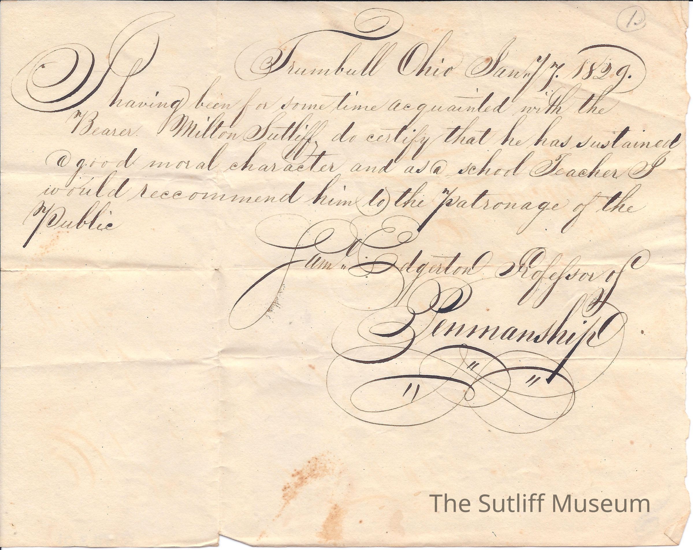 Letter from James Edgerton recommending Milton Sutliff for the patronage of the Public.