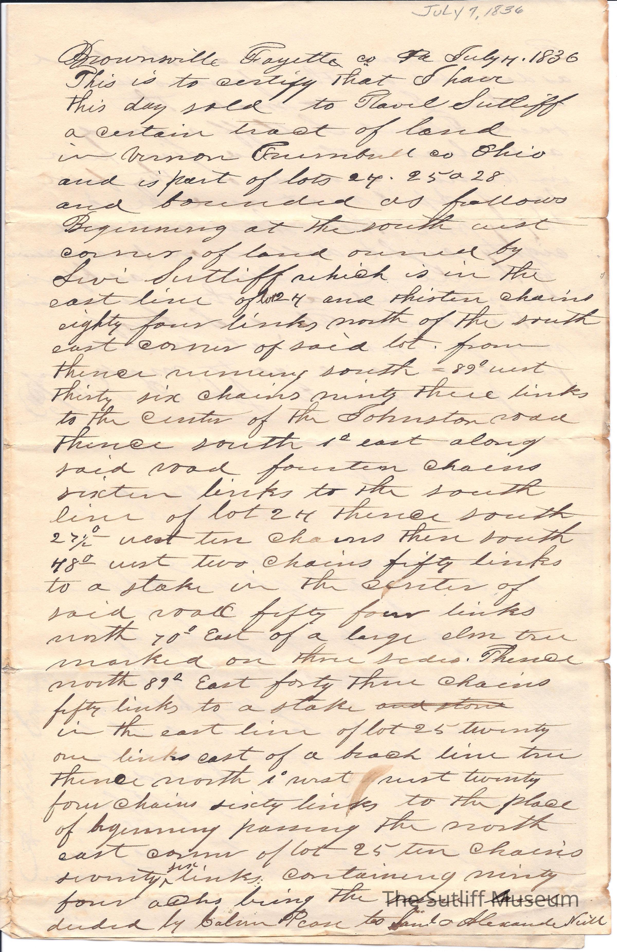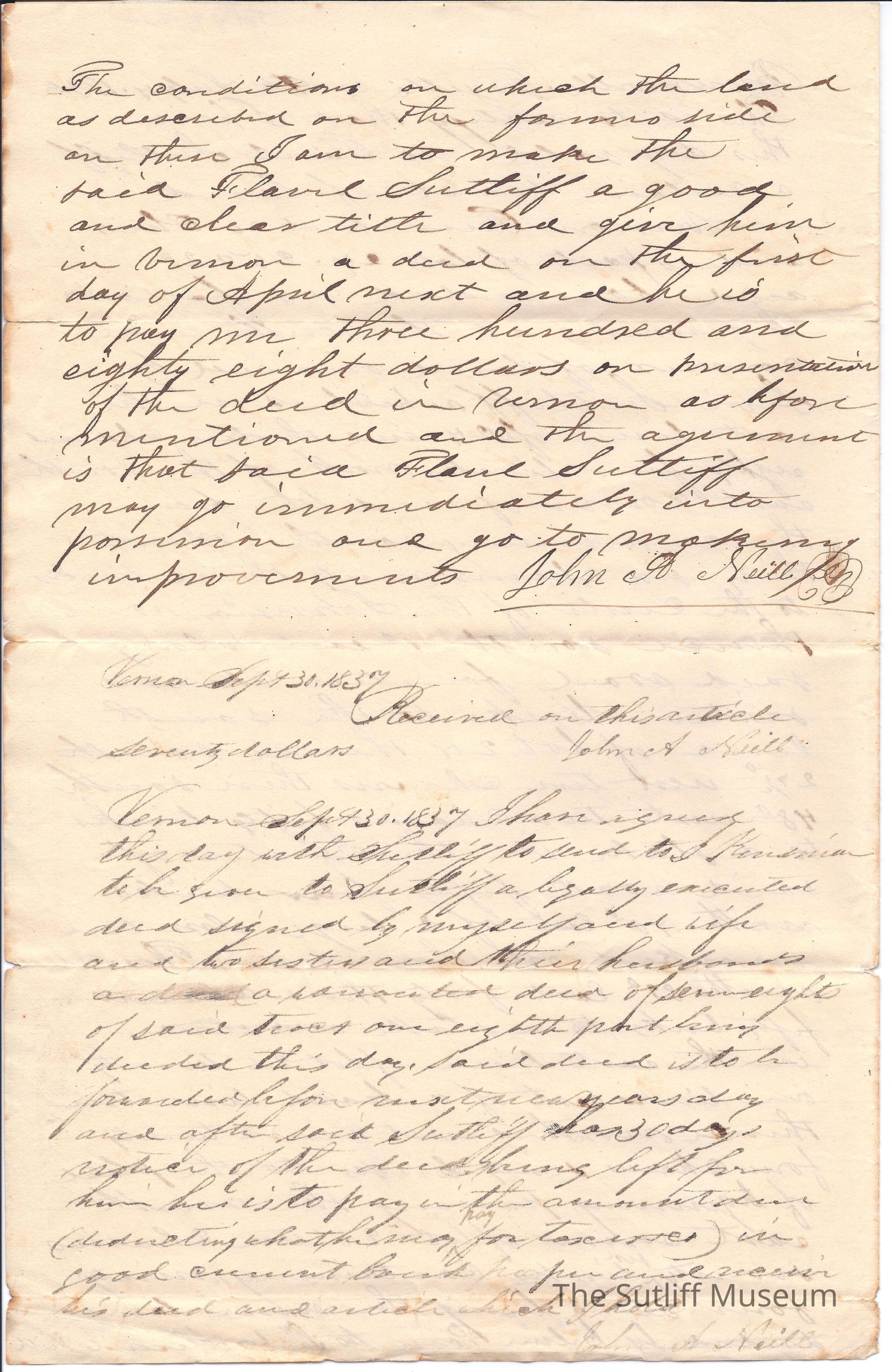 Letter from John A. Neill to Flavel Sutliff. Notice of Land Sale between John A. Neill and Flavel Sutliff in Vernon.