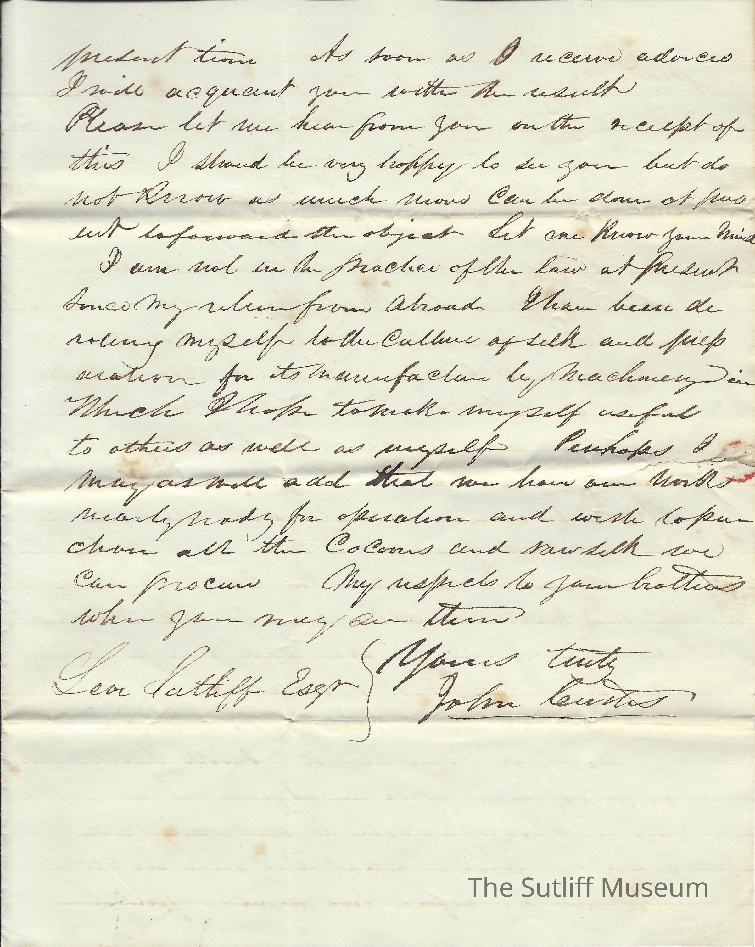 A letter from John Curtis to Levi Sutliff regarding the oppressive government system, the idea that something can be done about it, and the production of silk.Collection