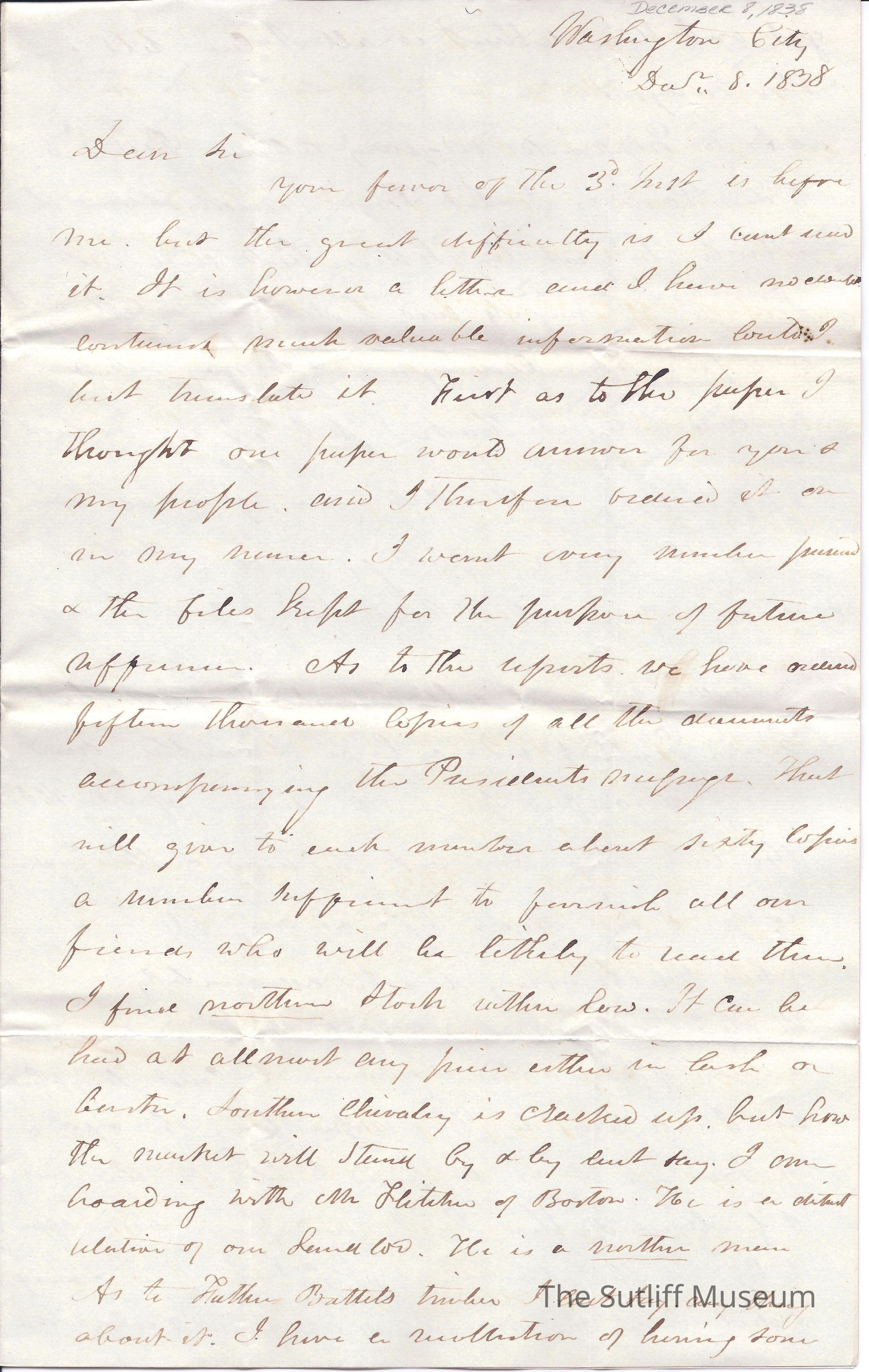 Letter from Joshua Giddings to Flavel Sutliff where he writes of an investigation into the Army affairs in Florida.Collection