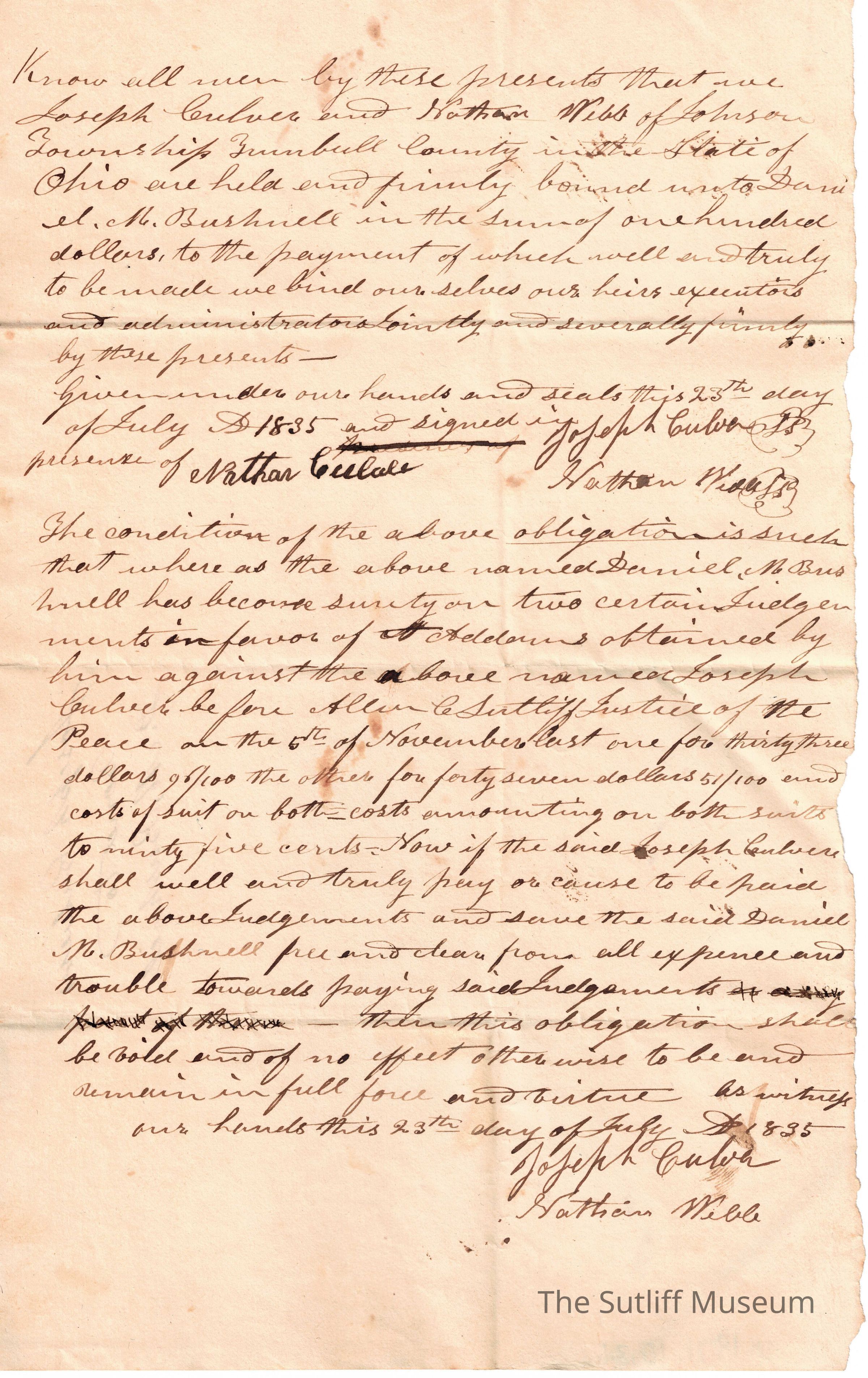 A letter of Joseph Culver and Nathan Webb binding themselves legally to pay Daniel M. Bushnell $100. Following is the conditions they must abide to for the document to remain legal.Relationships