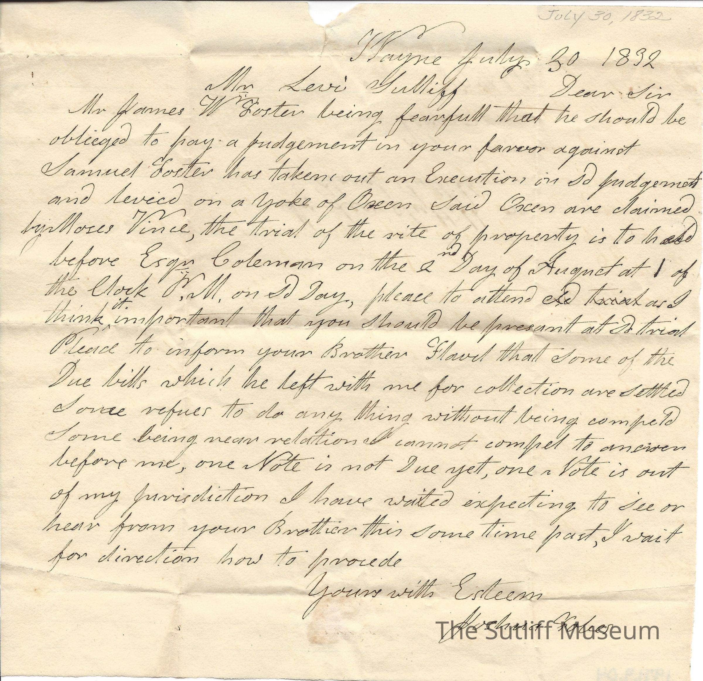 A letter from Joshua Fobes to Levi Sutliff regarding an oxen trial, to inform Flavel that some accounts are settled, and asking how to proceed as Flavel won't answer him.Collection