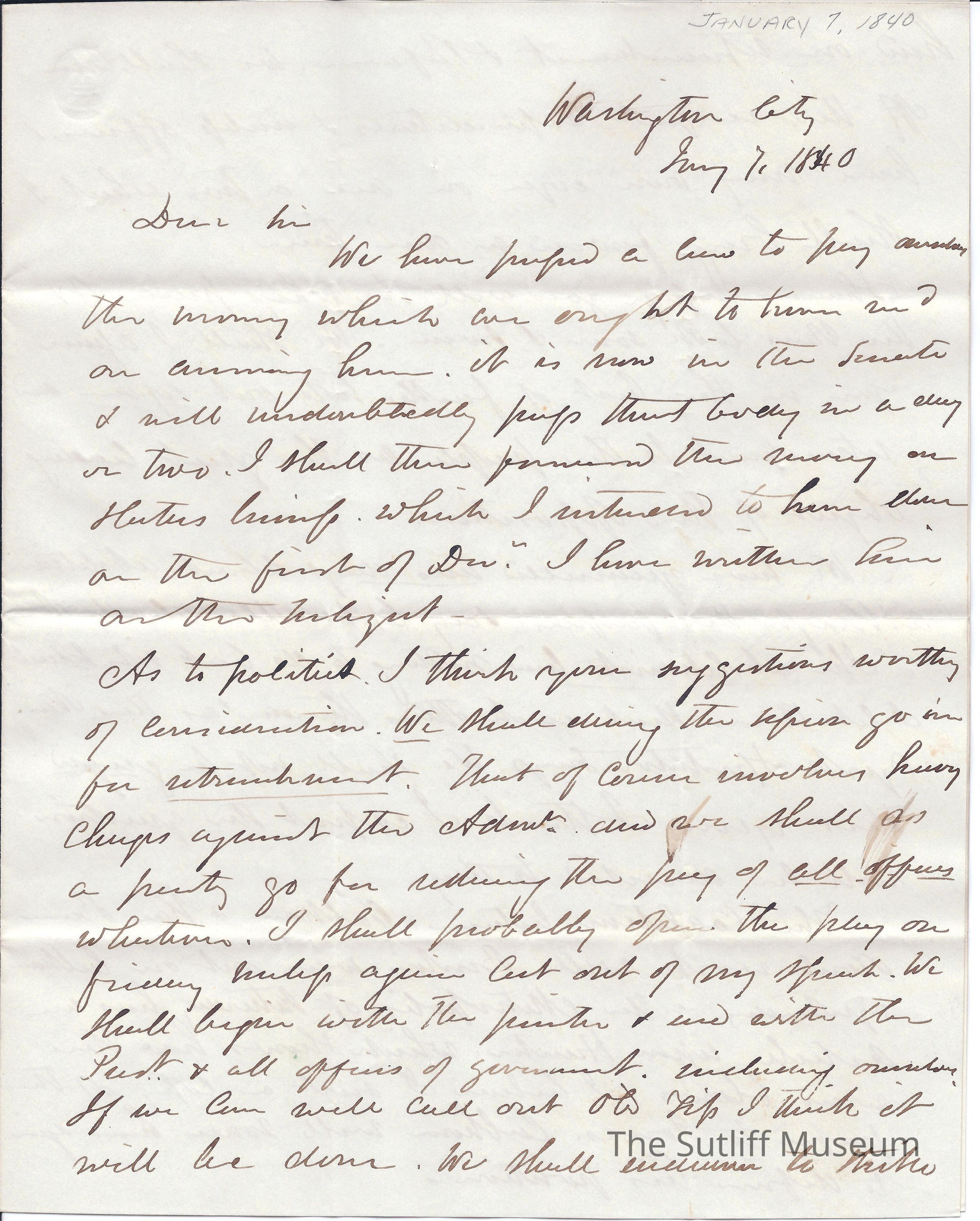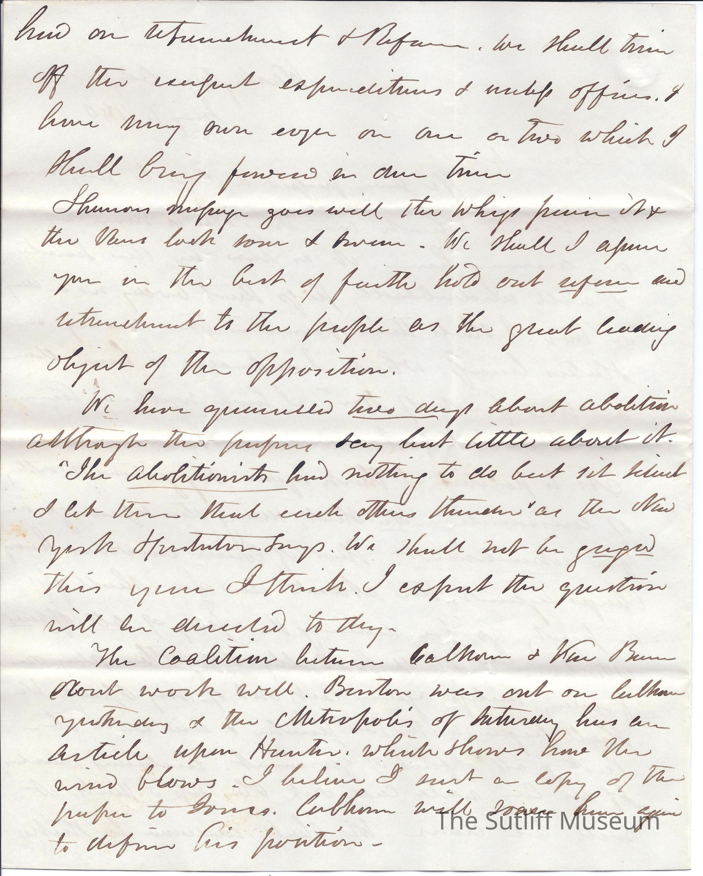 Letter from Joshua Reed Giddings to Flavel Sutliff where Giddings explains the Whigs will bring up retrenchment of offices which expanded under Jackson. Also discusses Abolition debates and coalitions.Collection