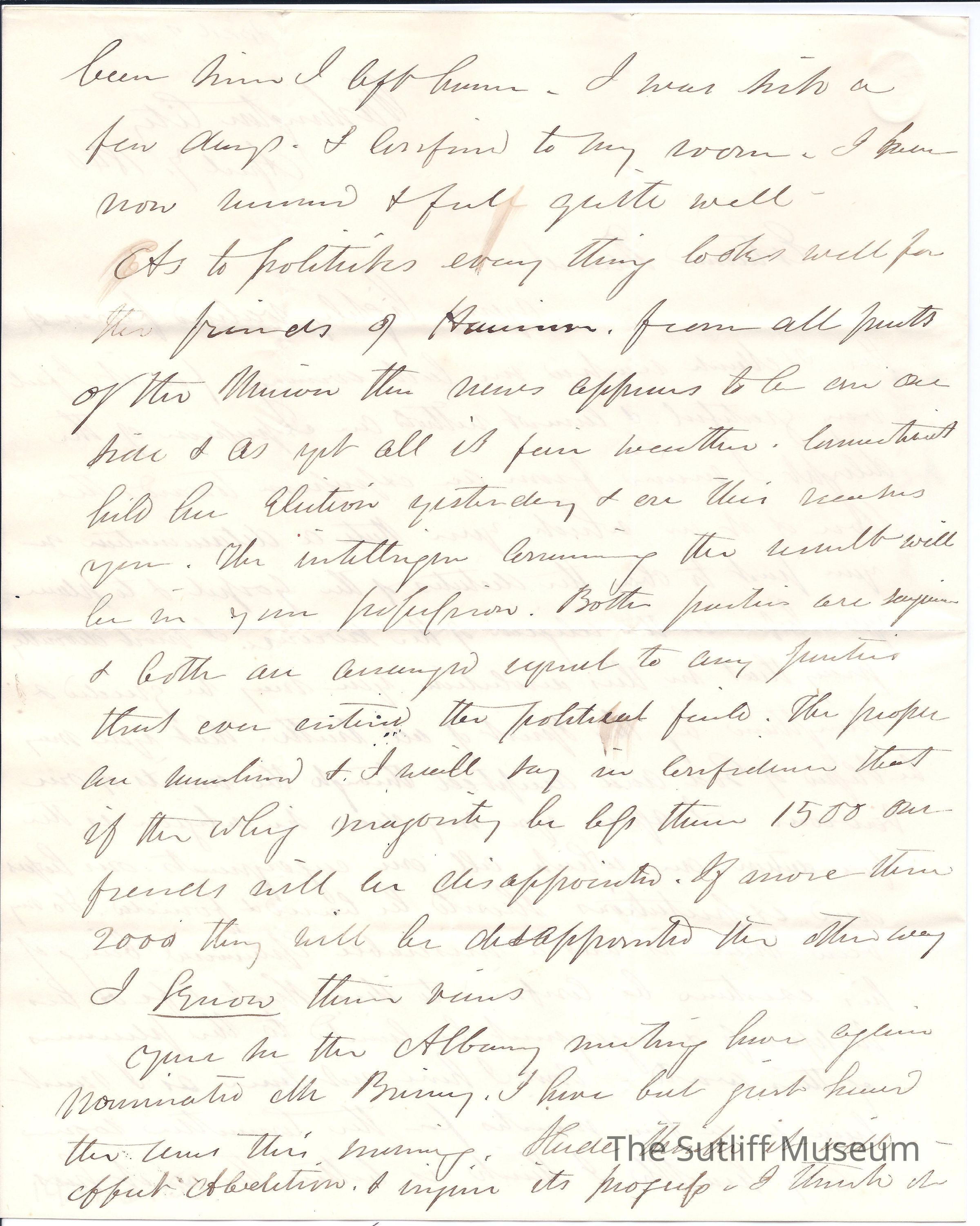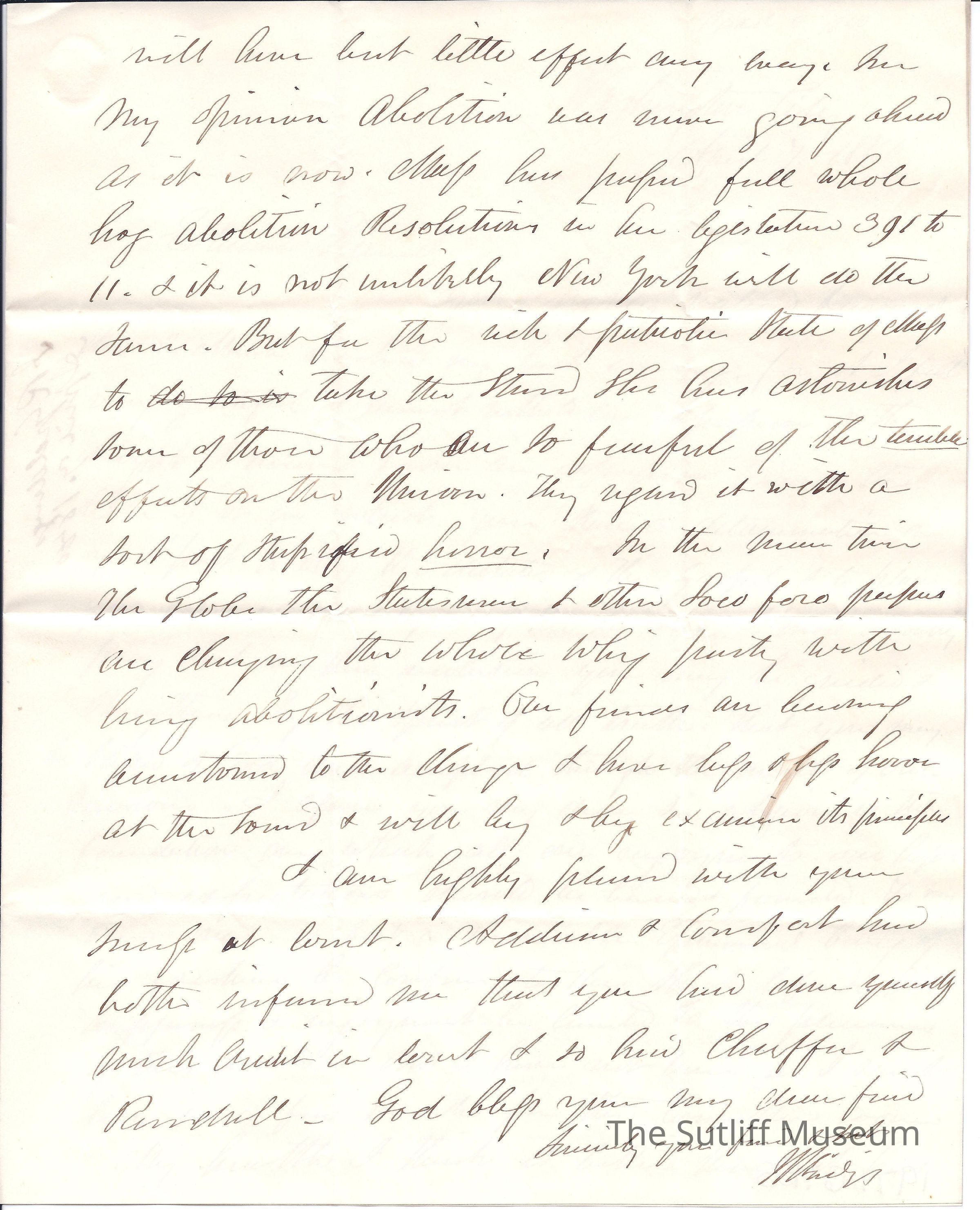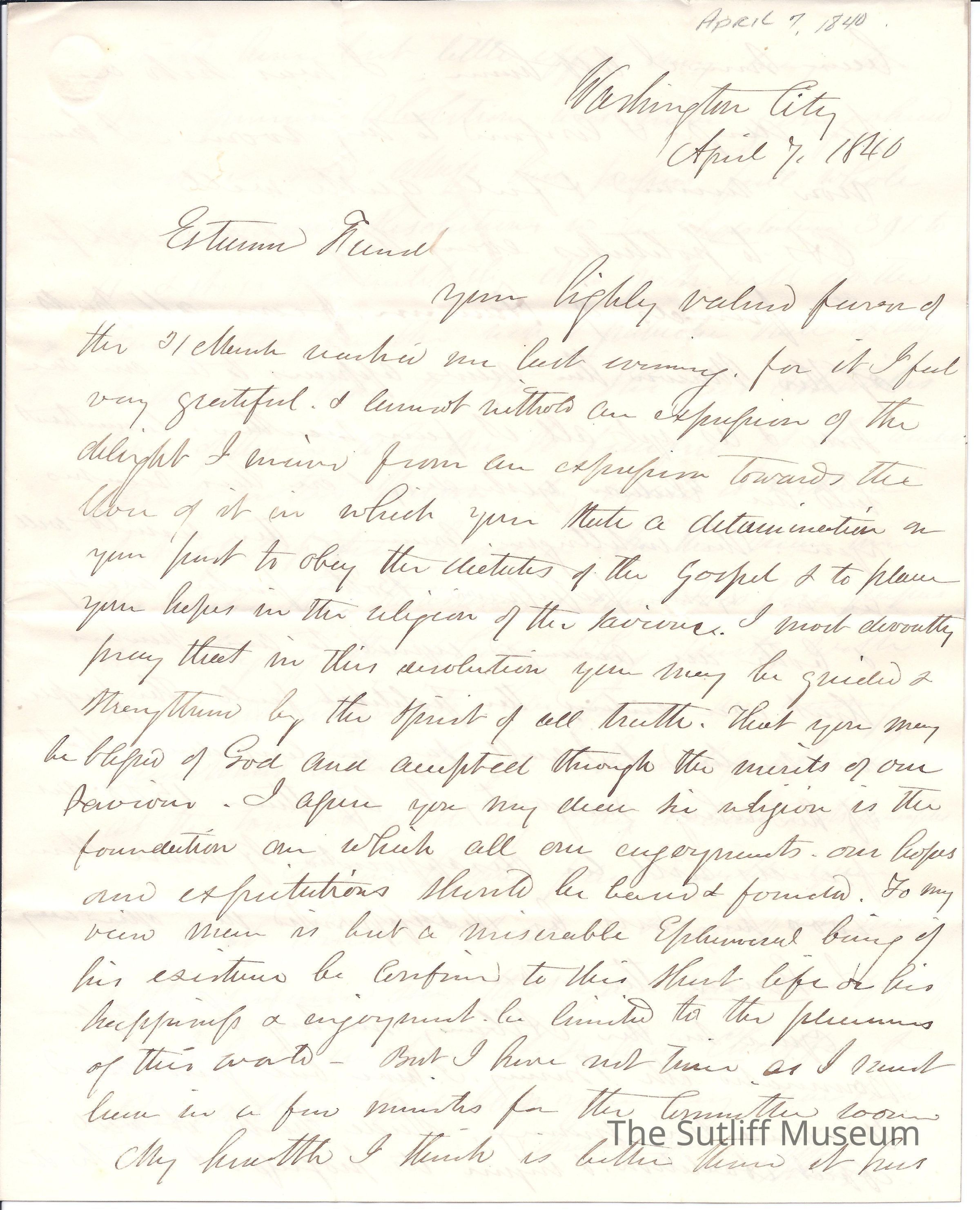 Letter from Joshua Reed Giddings to Flavel Sutliff. Giddings encourages Flavel's religious epiphany. He also predicts a Harrison victory, and is ecstatic about Massachusetts passing Abolition Resolutions in their legislature.Collection