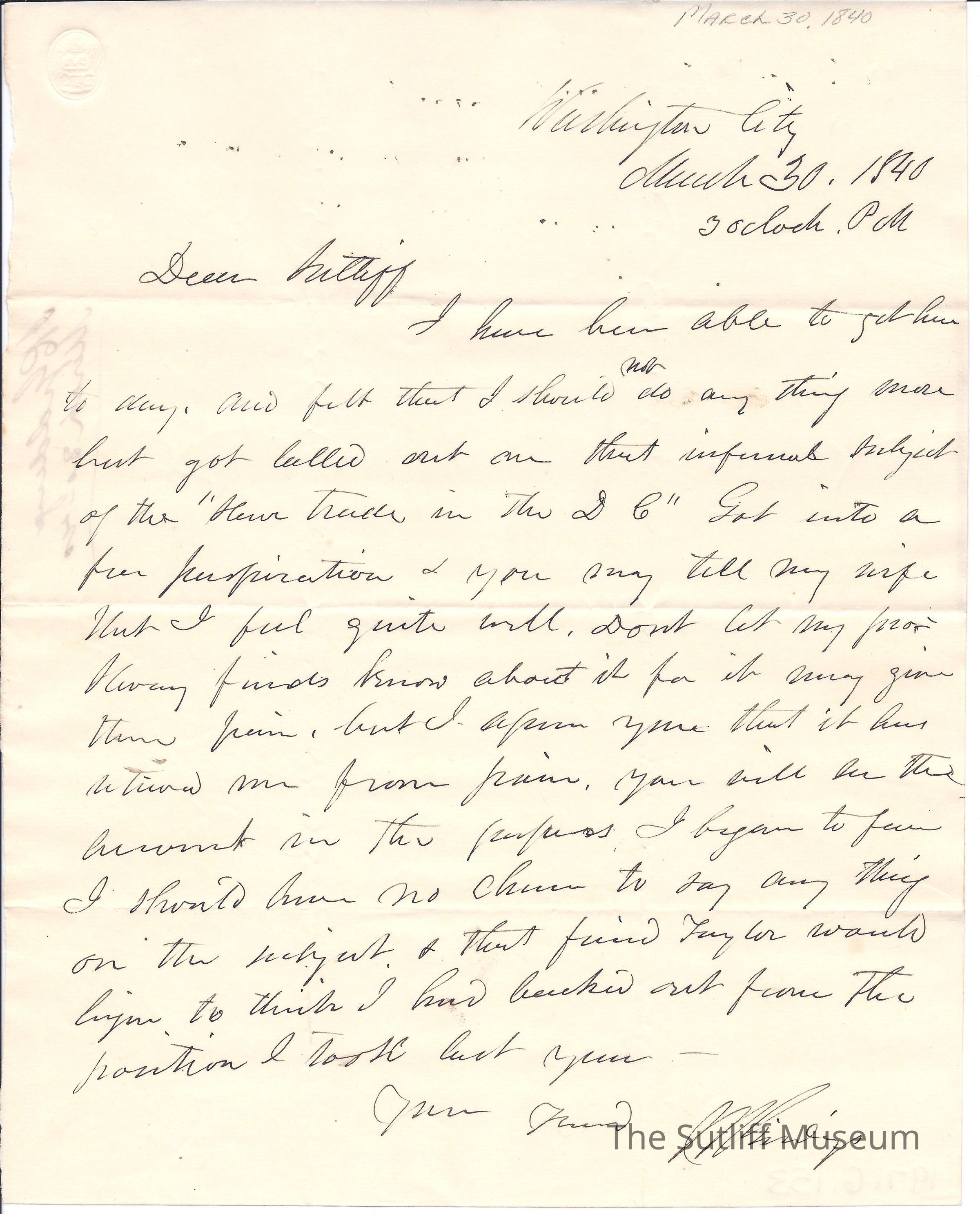 Letter from Joshua Reed Giddings to Flavel Sutliff regarding his argument against the DC Slave Auctions.Collection