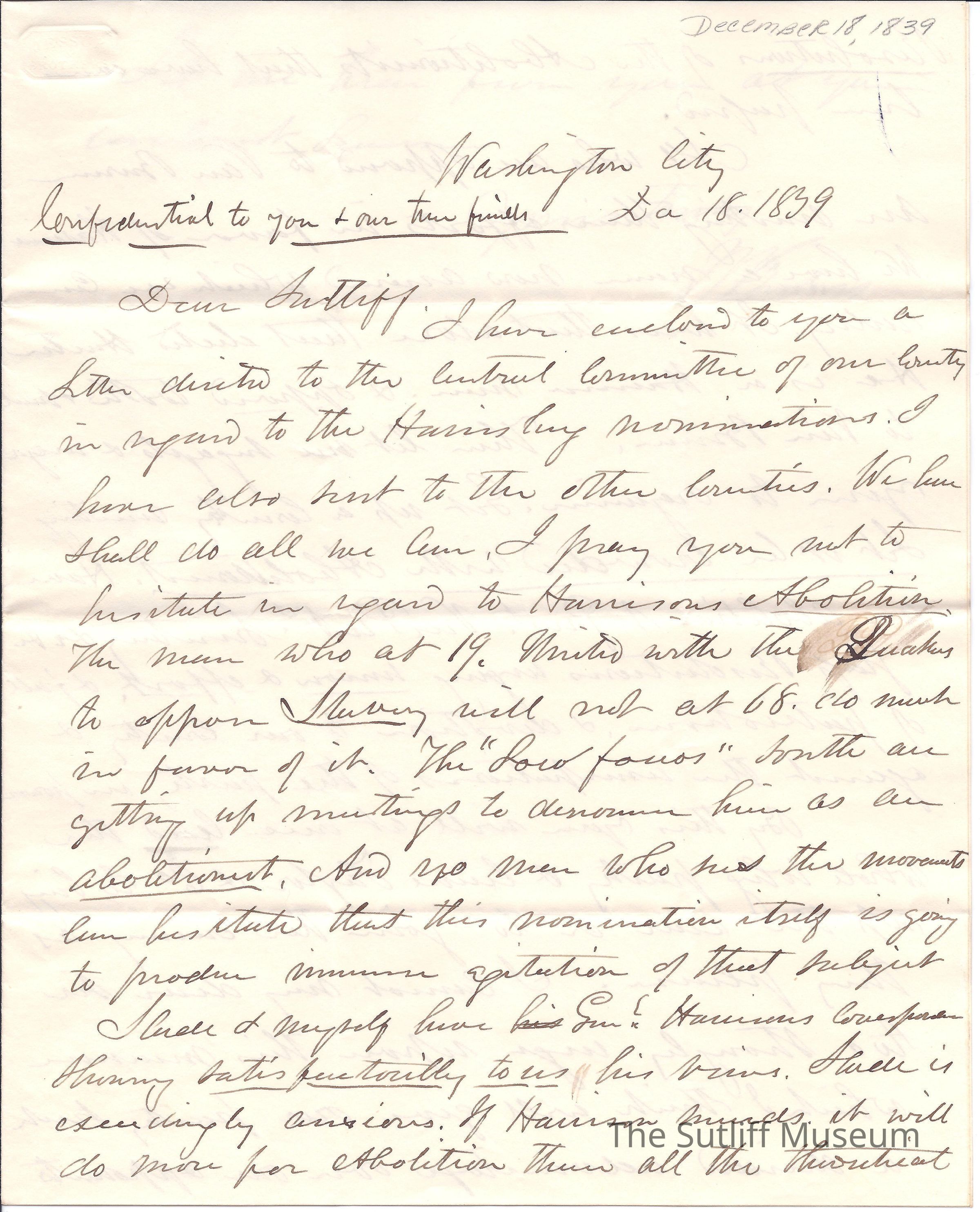 Joshua Reed Giddings to Flavel Sutliff sharing that Harrison is the Whig nominee and the excitement that is creating amongst Abolitionists.Collection
