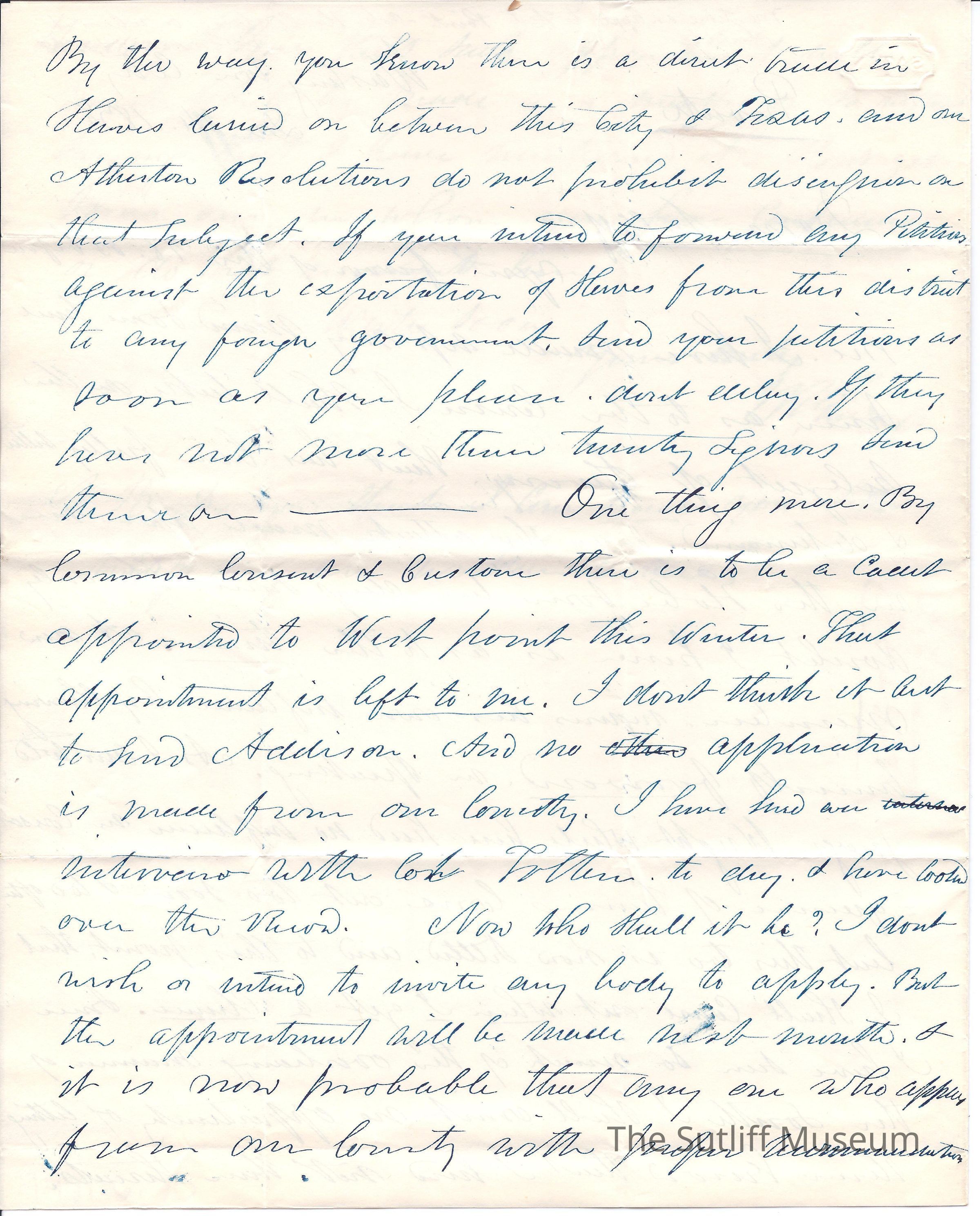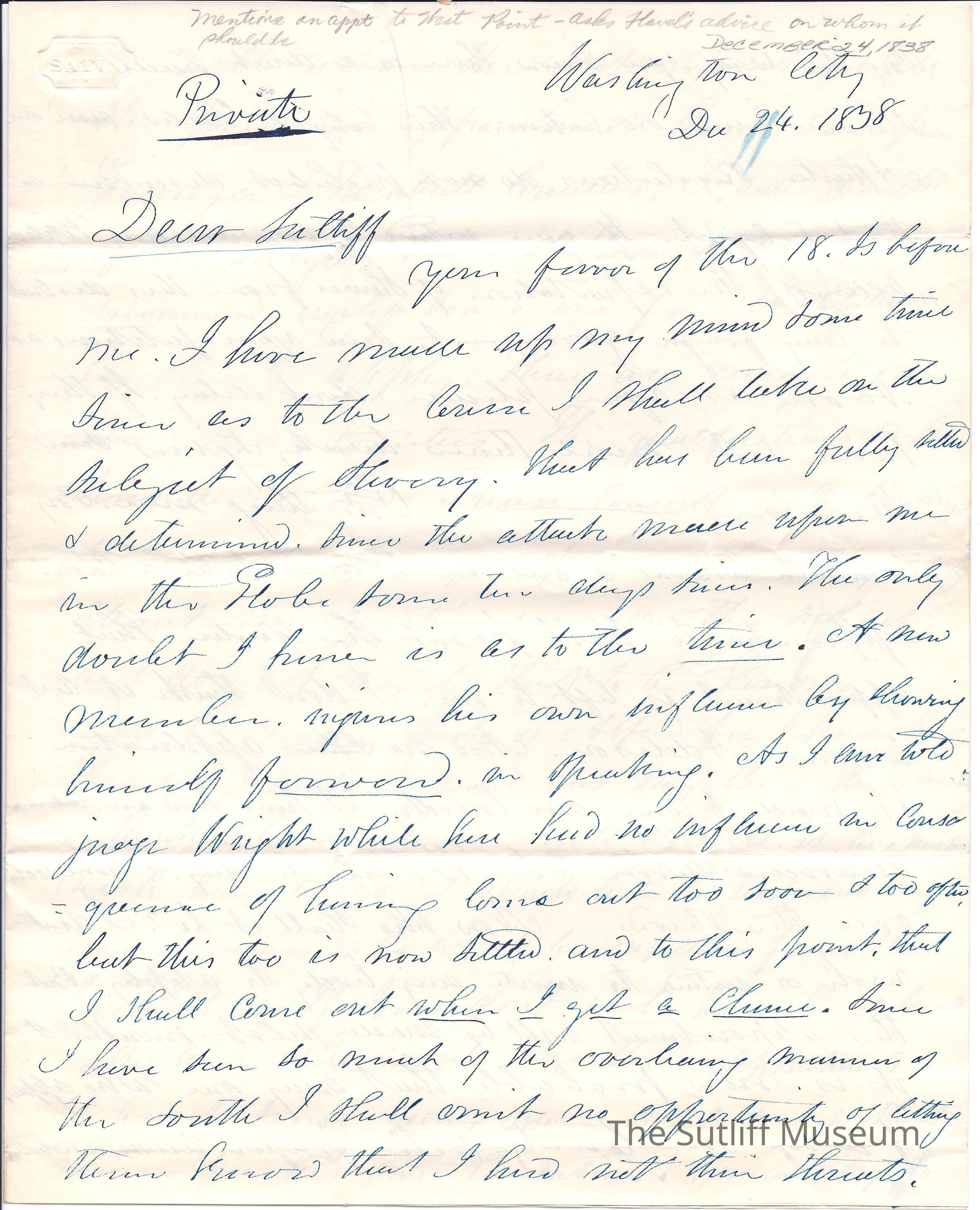 Letter from Joshua Giddings to Flavel Sutliff. Giddings writes of Flavel sending a petition on slavery to D.C. He also writes that speaking on D.C Slave Trade does not violate Atherton's Resolutions. Mentions finalists for recommendations for admittance to West Point.Collection