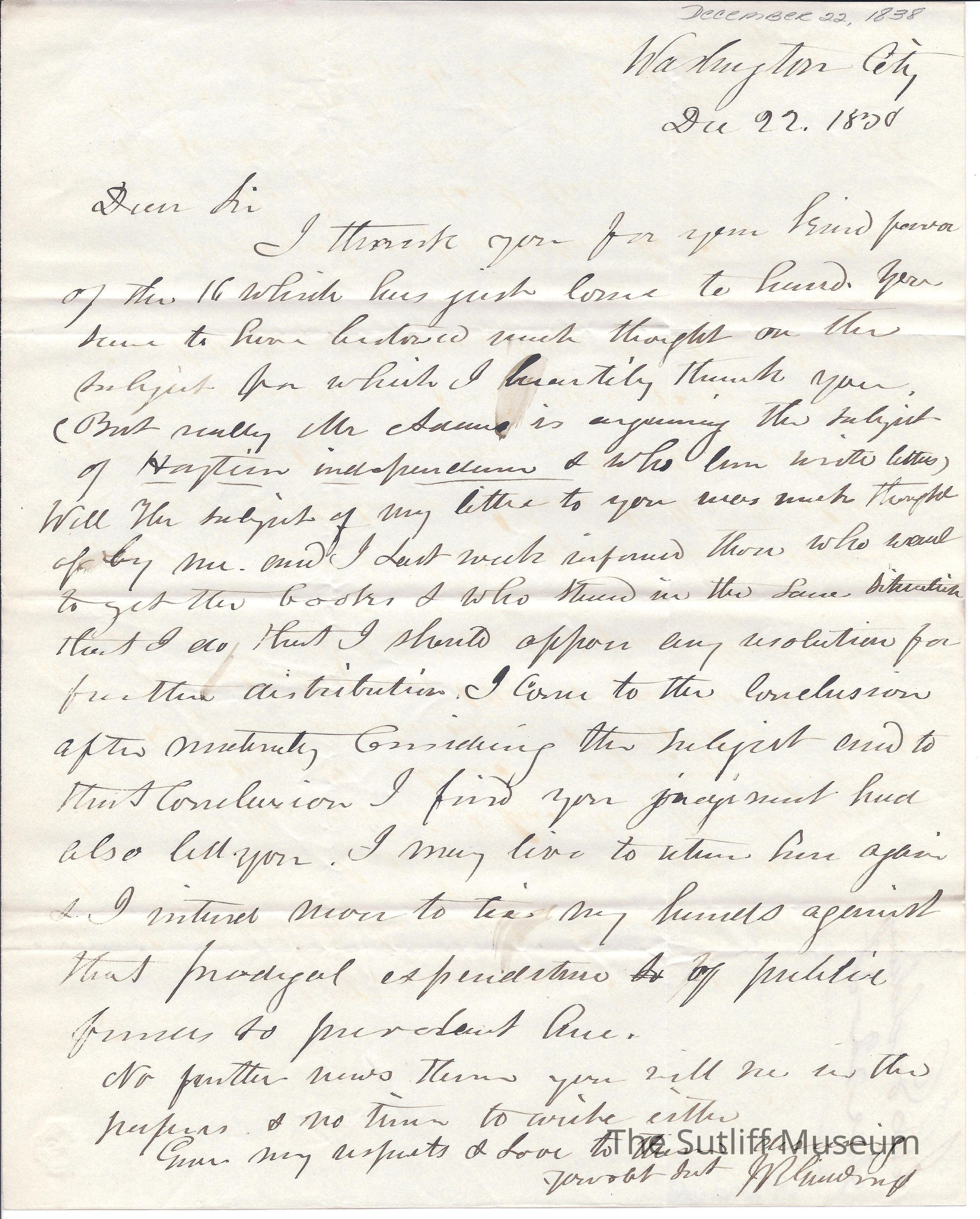 Letter from Joshua Reed Giddings to Flavel Sutliff. Giddings writes a quick note explaining why he cannot write. Alludes to John Quincy Adams talking in favor of Haitian independence.Collection