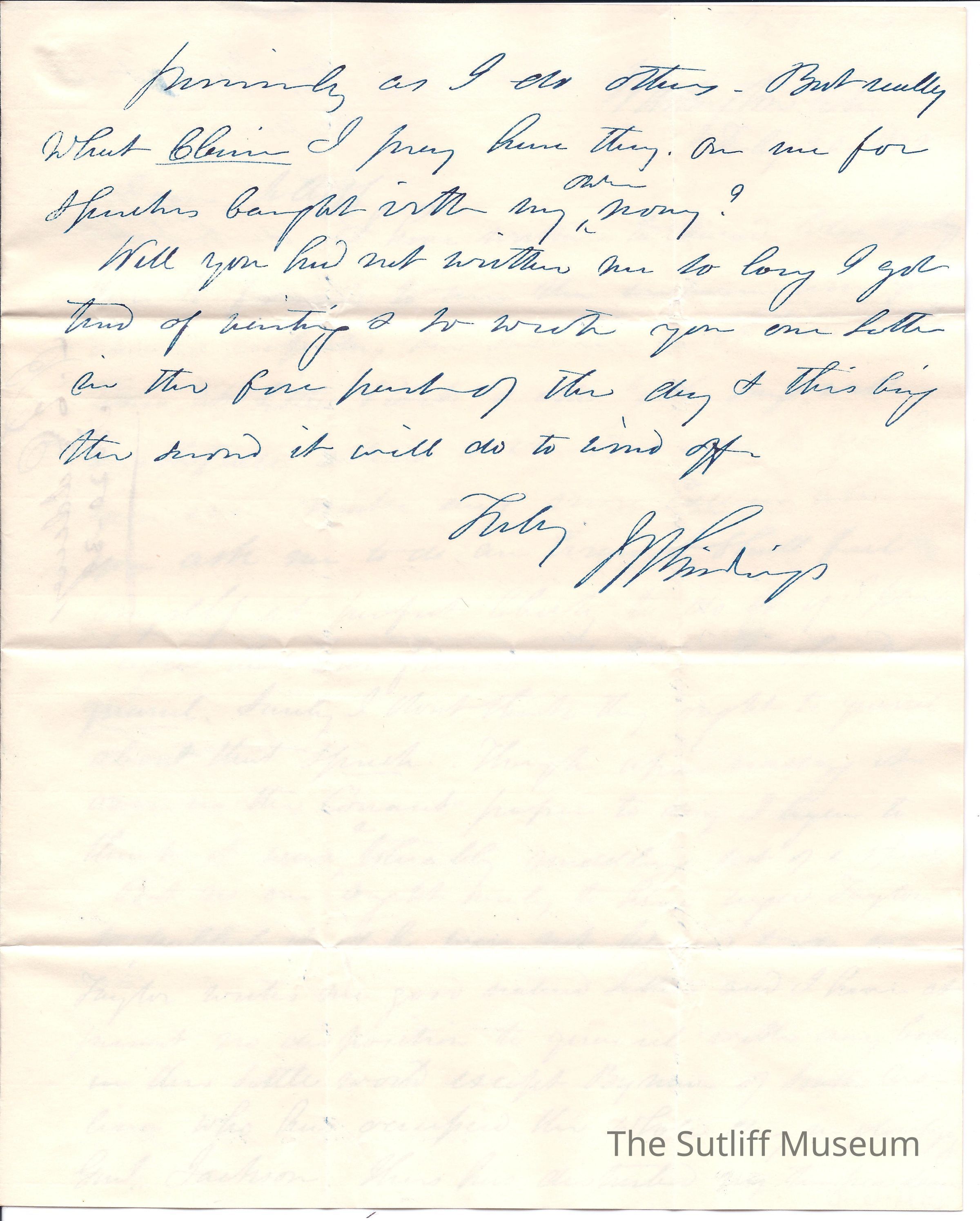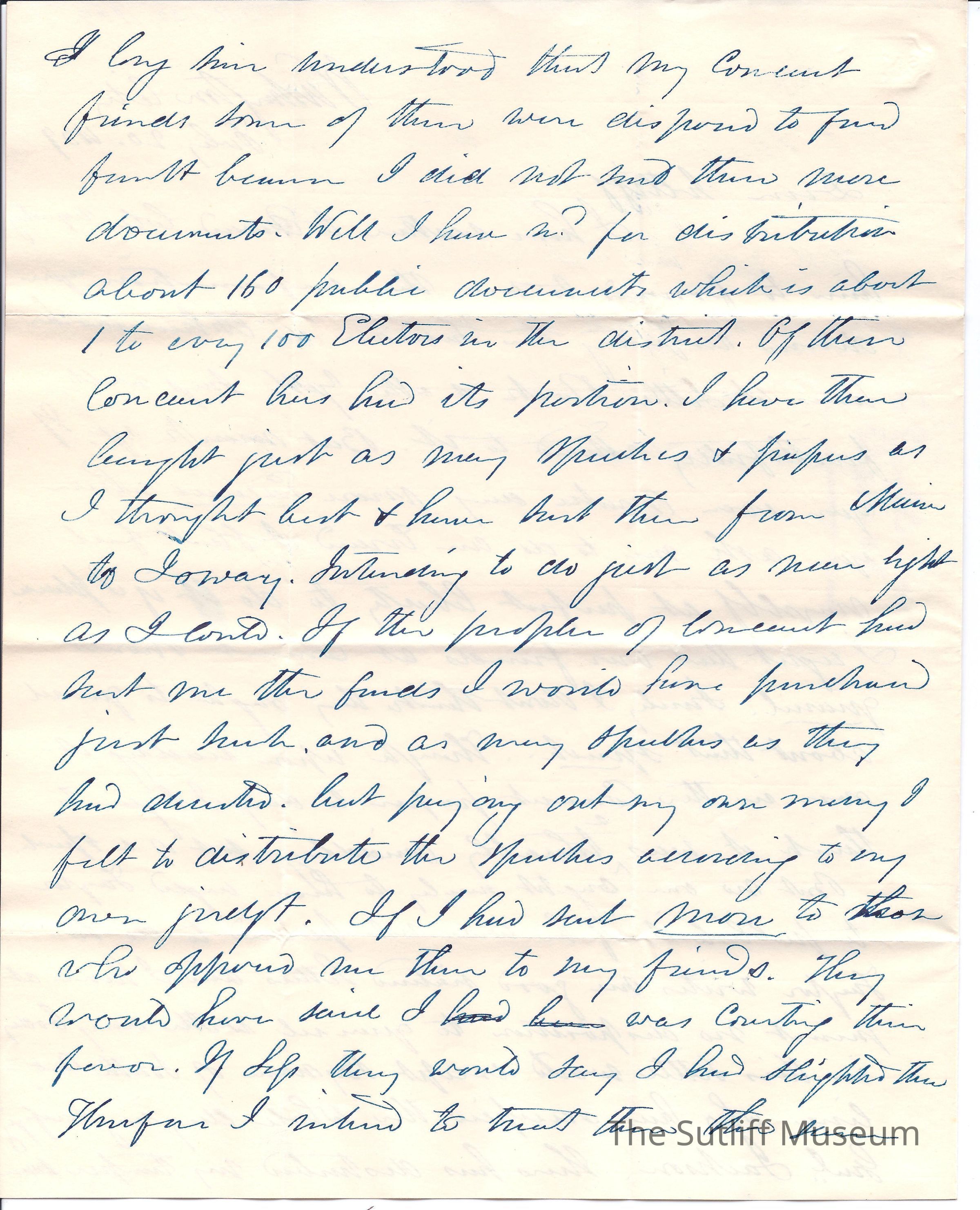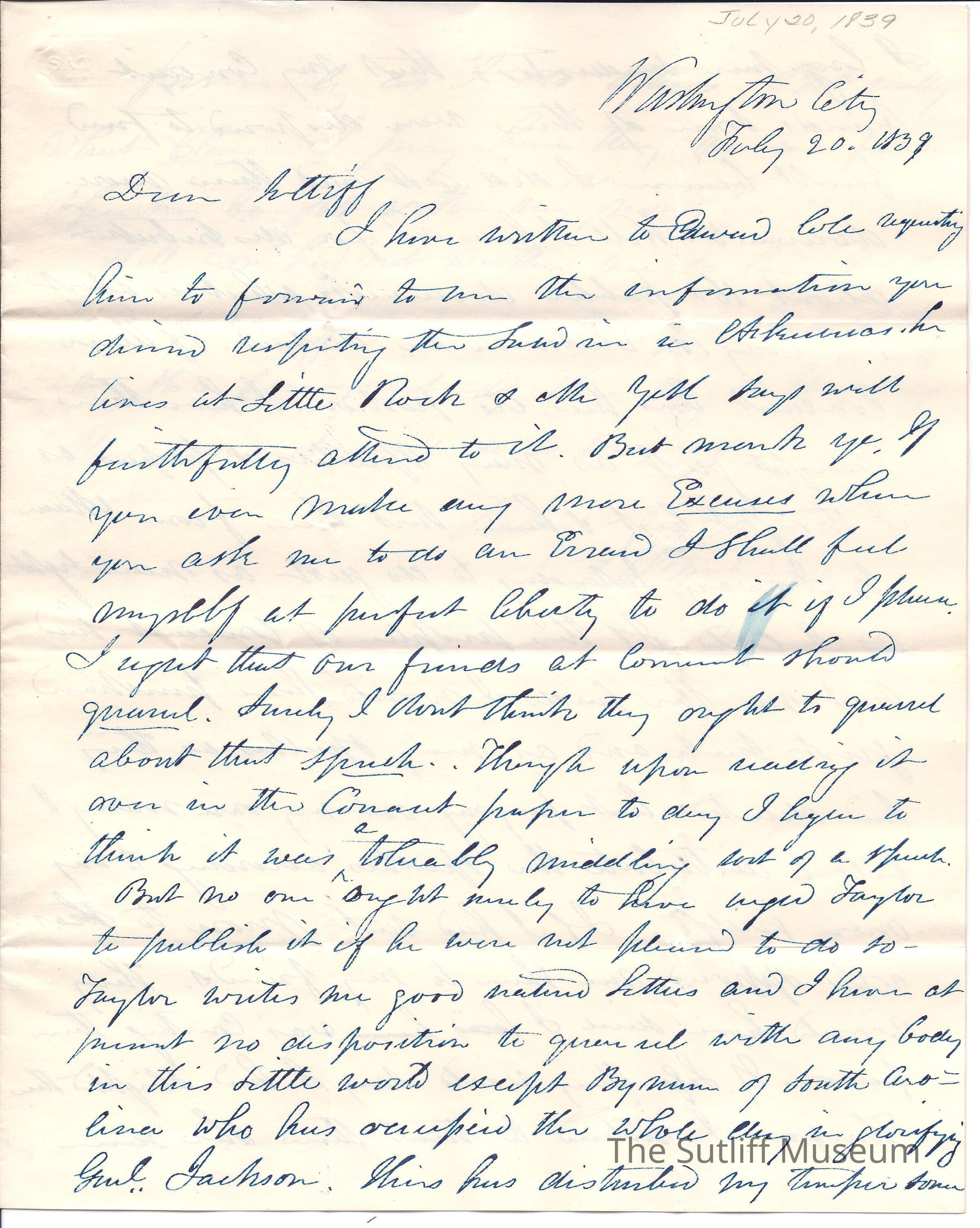 Letter from Joshua Giddings to Flavel Sutliff regarding a negative reaction in Conneaut to his speech and lack of funds.