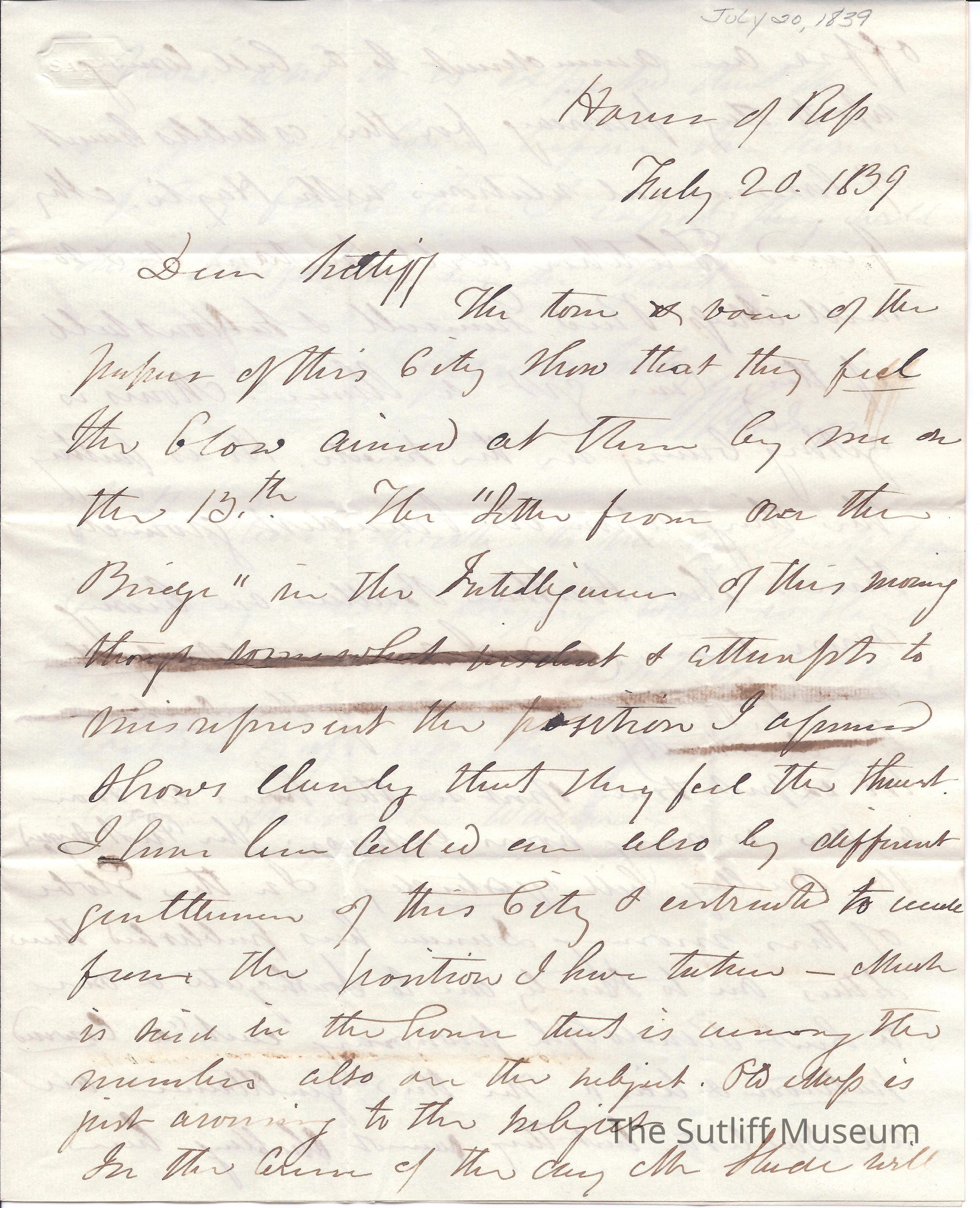 Letter from Joshua Giddings to Flavel Sutliff regarding the environment in the House of Representatives, anger over his movements and the signing of the Dueling bill.