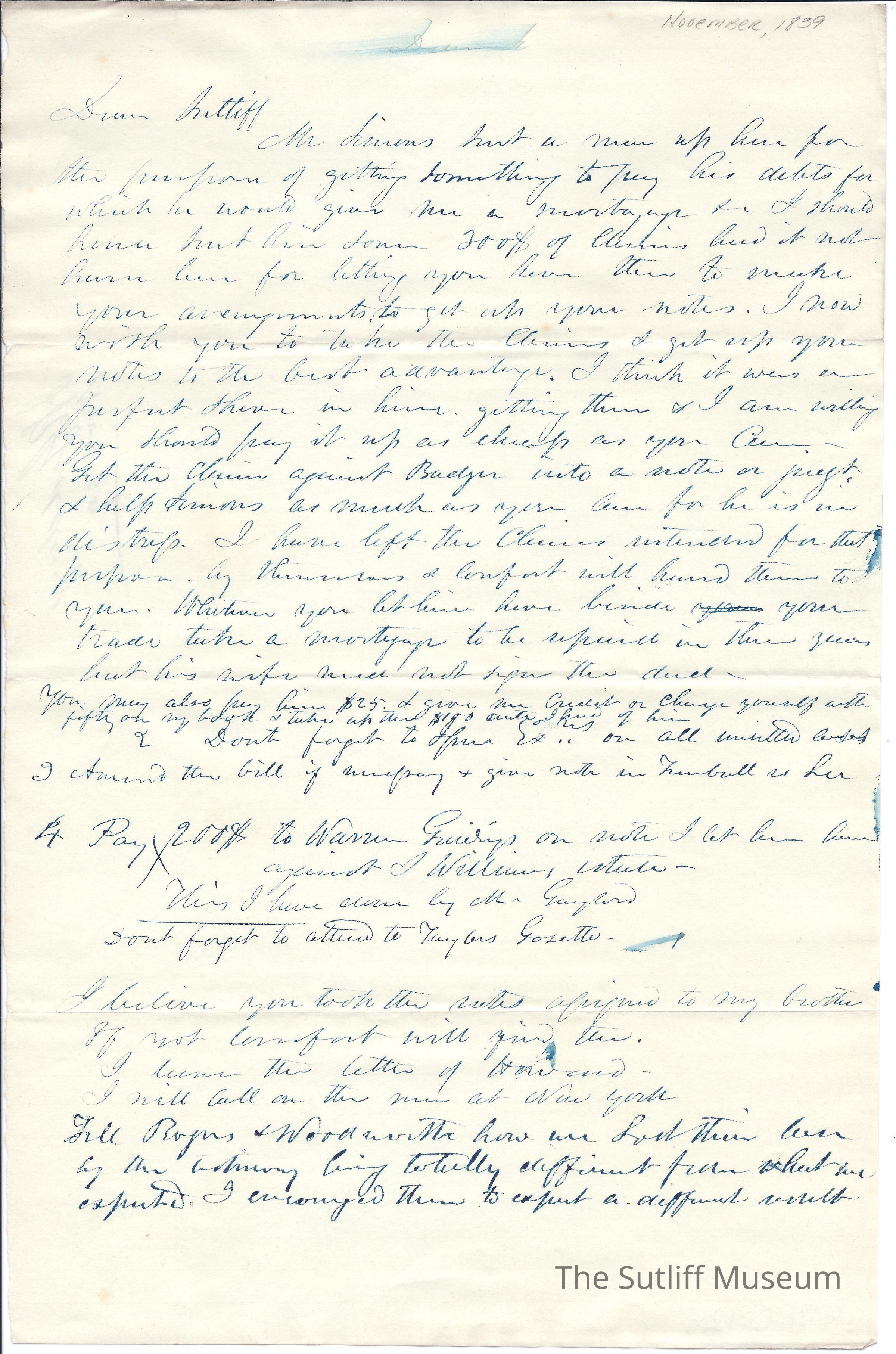 Letter from Joshua Reed Giddings to Flavel Sutliff requesting Flavel move money to assist an acquaintance.