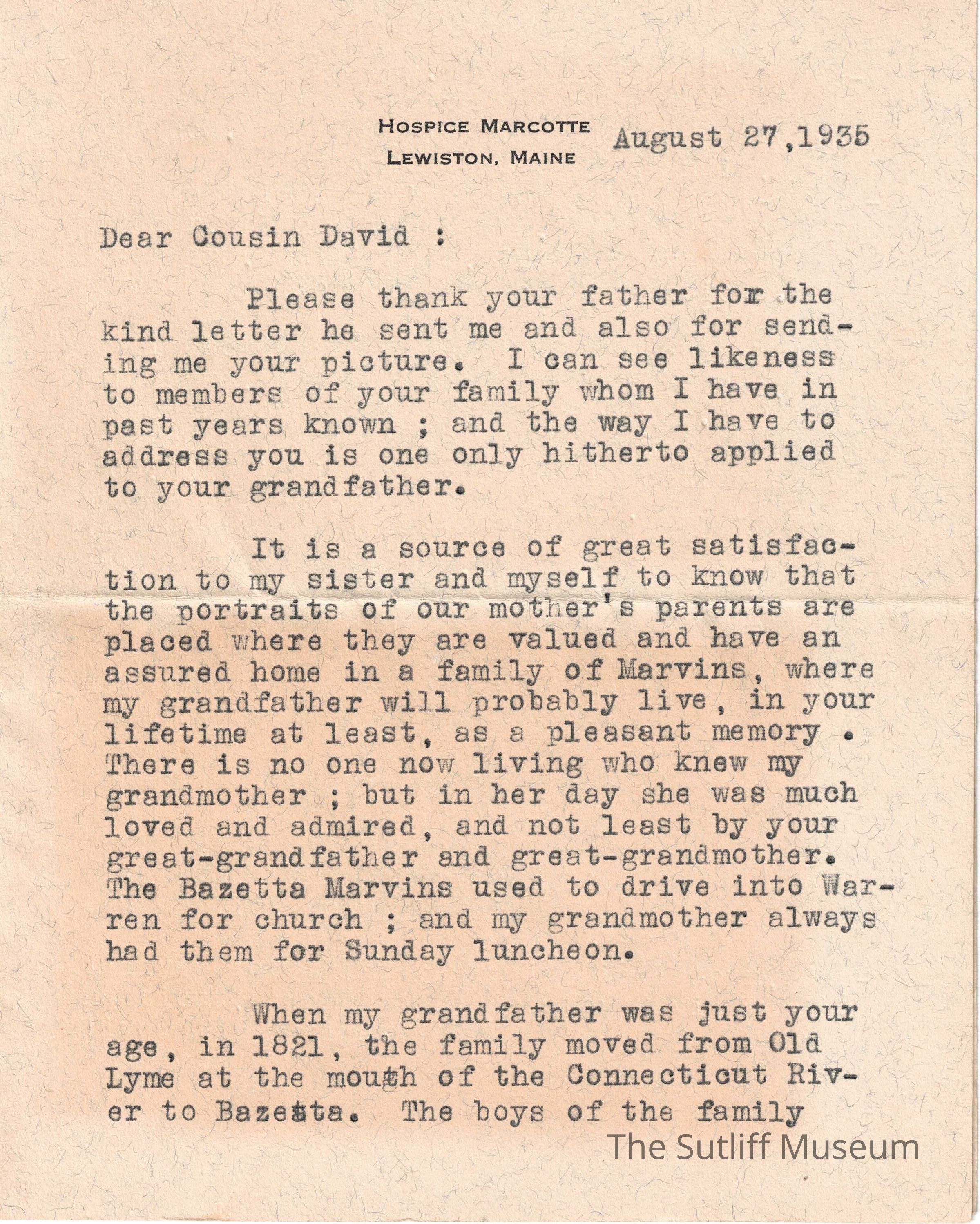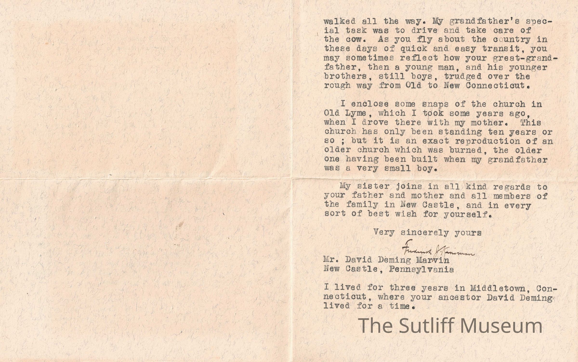 Letter from Franklin J. Kinsman to David Deming Marvin. Talks about portraits of Kinsman's maternal grandparents residing with Marvin. Talks about when the family moved from Old Lyme, Connecticut to Bazetta, Ohio in 1821. Corresponds to Object 2015.1.20b, as the photo was enclosed with the letter, a church in Old Lyme, Conn.Collection