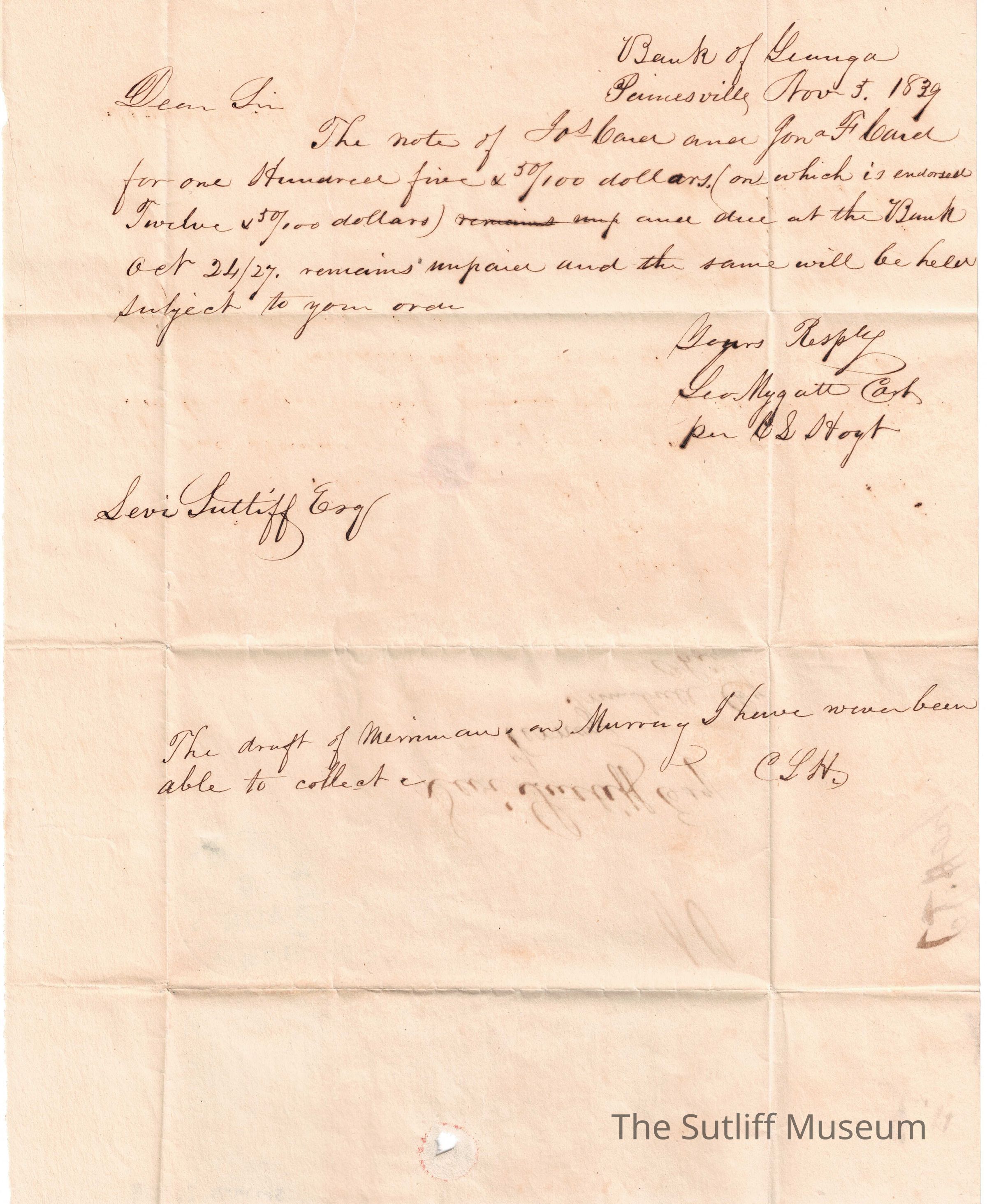 A letter from C.L. Hoyt to Levi Sutliff regarding Leo Mygatt's payment of a note of $100.Collection
