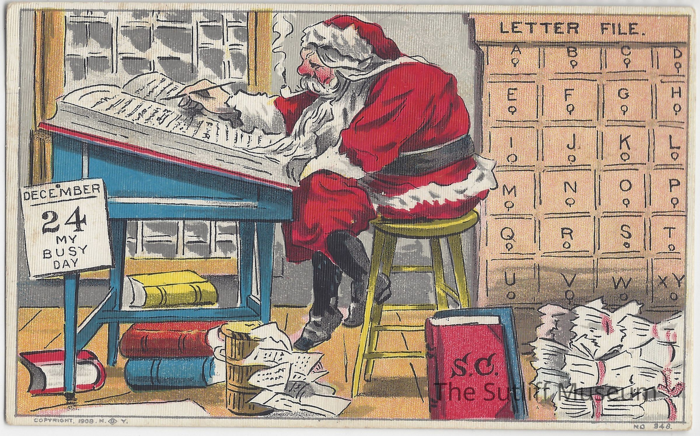 Christmas postcard depicting Santa checking his list on Christmas Eve next to his letter file. In black text, "Letter File." in all capitals on the top right corner.