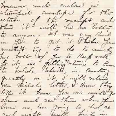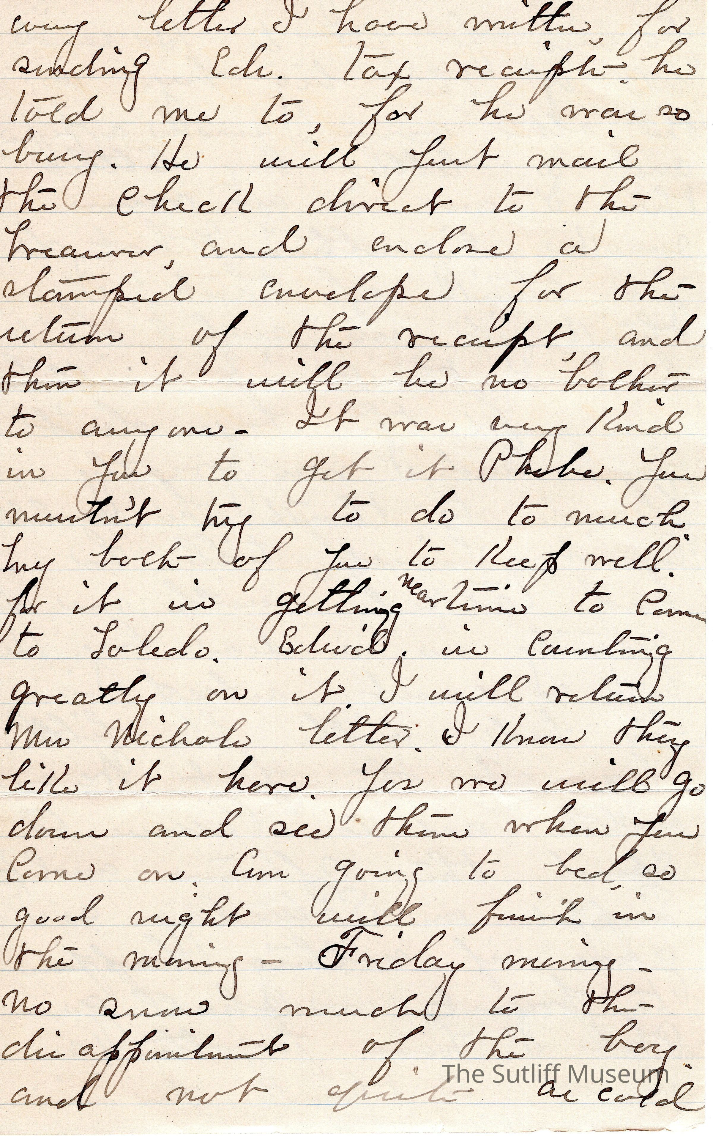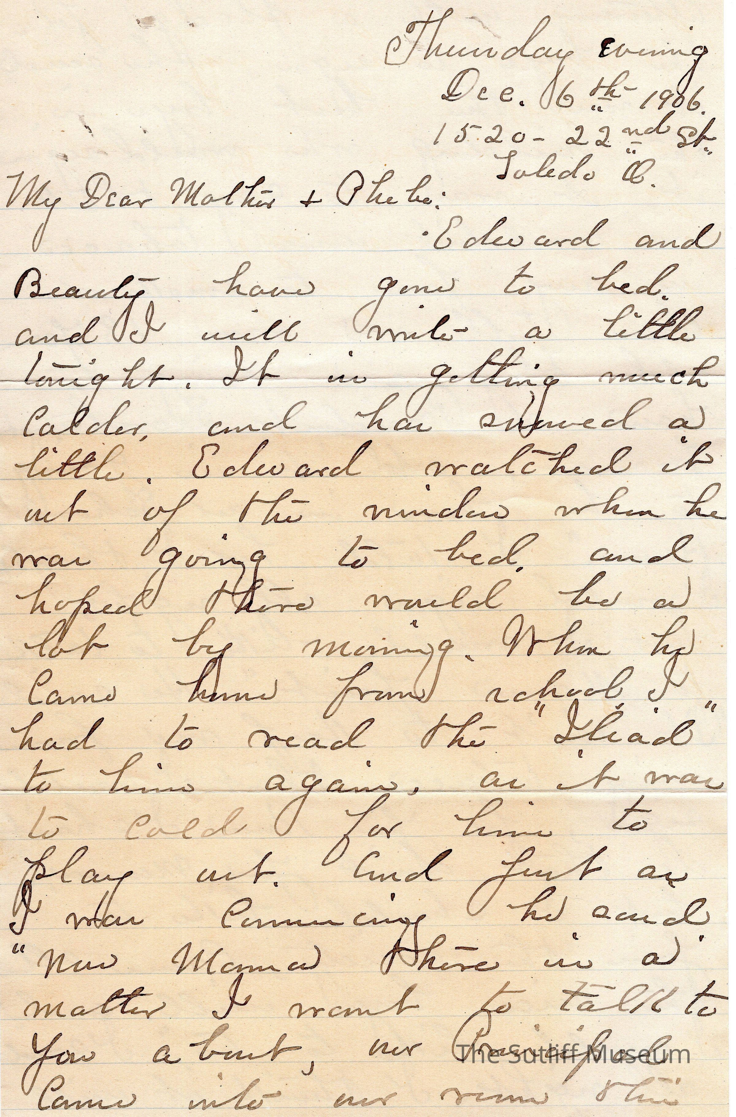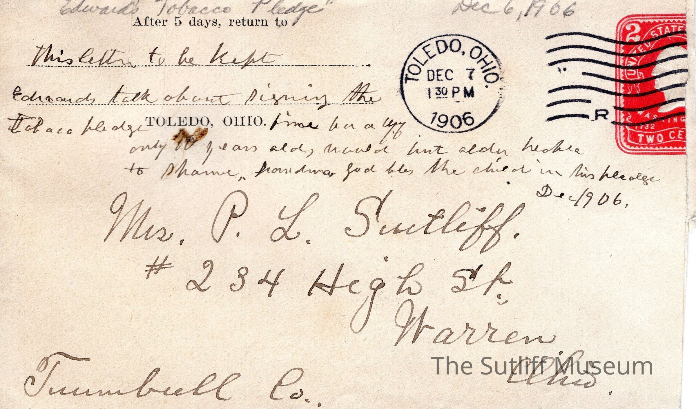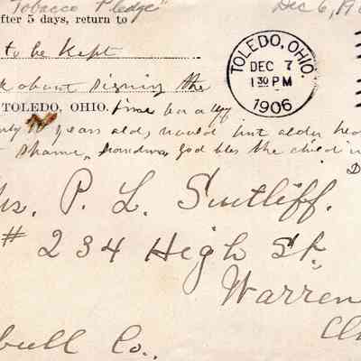 A letter from Lydia Sutliff Brainard to Phebe Lord Marvin Sutliff regarding Edward Sutliff Brainard's want to sign the Tobacco Pledge, despite being 10 years old.Archive Details