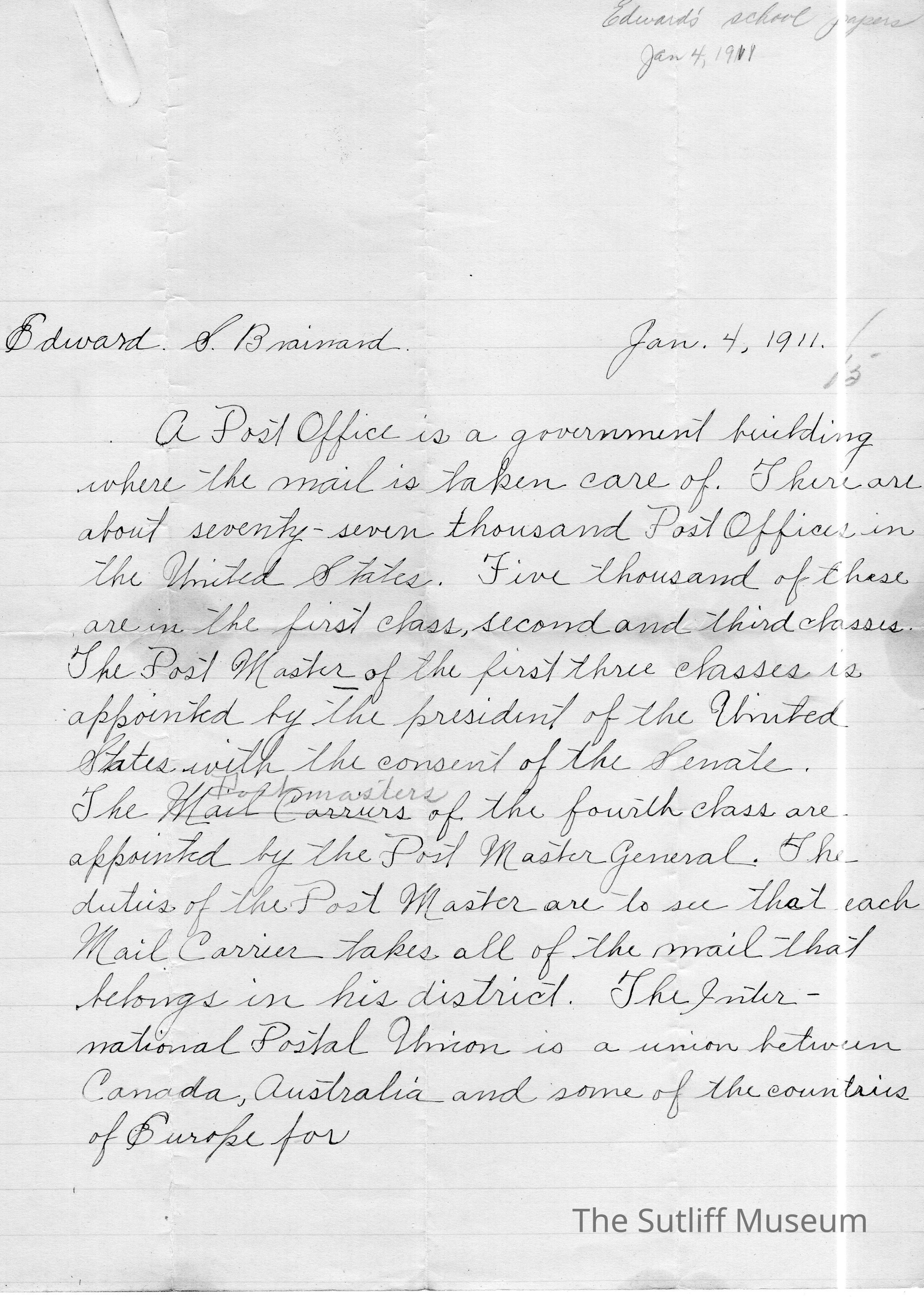A letter to Edward S. Brainard about how Post Offices work for a school project.Archive Details