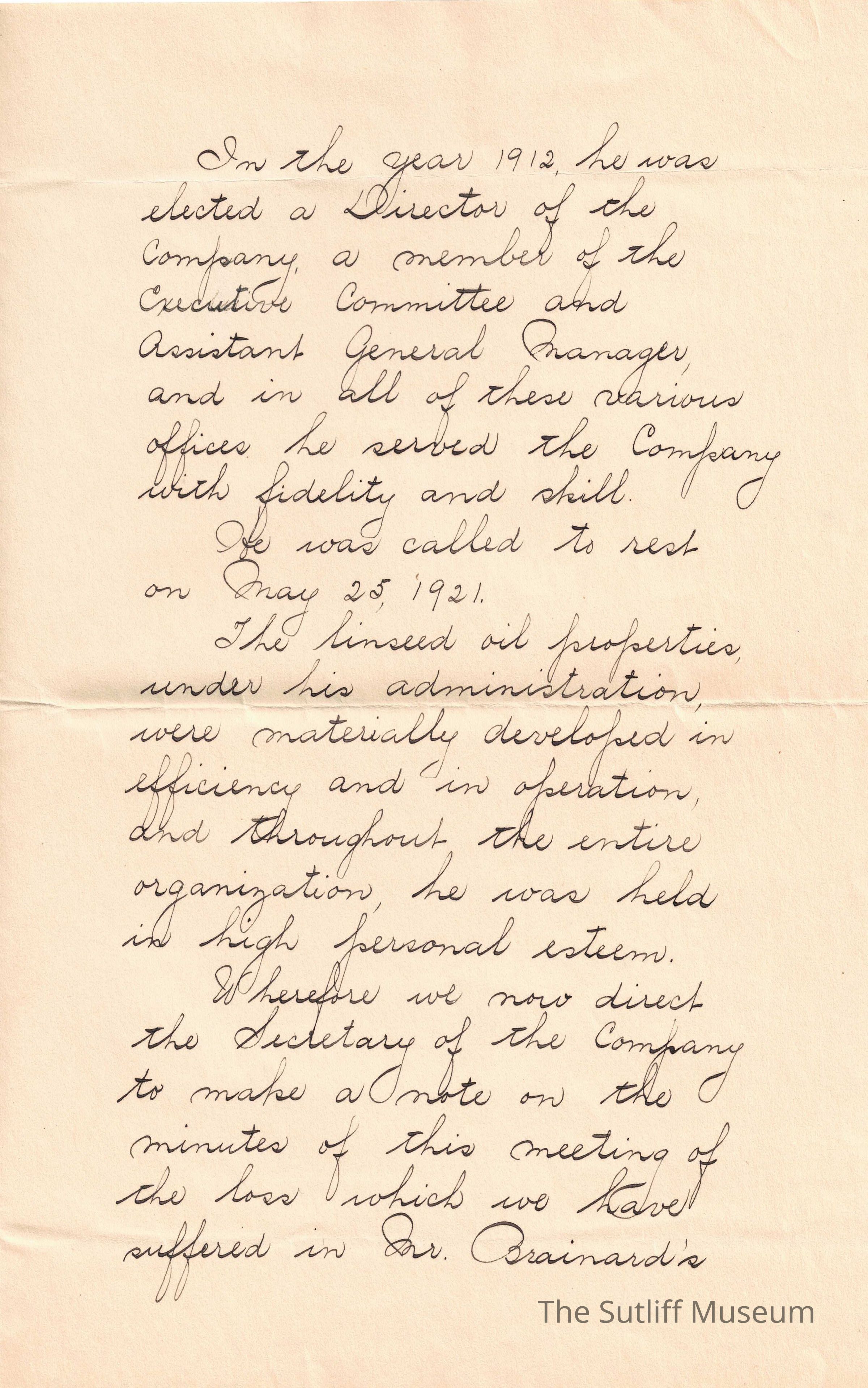 A letter from W.A. Jones to "Mrs. Edward J. Brainard" or Lydia Sutliff Brainard regarding a meeting at his former company, the American Linseed Company, where his service was referenced.